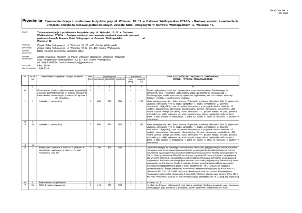 ZAŁĄCZNIK NR 4 DO SIWZ Przedmiar Termomodernizacja i przebudowa budynków przy ul. Wolności 10 i 12 w Ostrowie Wielkopolskim ETAP-V - Dostawa, montażu i uruchomienia urządzeń i sprzętu do pracowni gastronomicznych Zespołu Szkół Usługowych w Ostrowie Wielkoppolskim ul. Wolności 12. Termomodernizacja i przebudowa budynków przy ul. Wolności 10 i 12 w Ostrowie Wielkopolskim ETAP-V - Dostawa, montażu i uruchomienia urządzeń i sprzętu do pracowni gastronomicznych Zespołu Szkół Usługowych w Ostrowie Wielkoppolskim Wolności 12. dotyczy: ul. Zespół Szkół Usługowych, ul. Wolności 10, 63 - 400 Ostrów Wielkopolski Zespół Szkół Usługowych, ul. Wolności 10-12, 63 - 400 Ostrów Wielkopolski Ustne zlecenie Kierownika Jednostki (ZSU) lokalizacja: Zamawiający: podstawa opracowania: jednostka opracowująca: poziom cen: data opracowania: Zakład Inwestycji Miejskich sc Paweł Orleański Magdalena Orleańska - Ordyniak; Aleja Powstańców Wielkopolskich 20; 63 - 400 Ostrów Wielkopolski; tel. (62) 735-02-34; mail:[email protected] I kw. 2014r. 15.04.2014r. lp nr na rys. nazwa i opis urządzenia / sprzętu/ działania 1 2 3 4 5 6 7 8 9 0 - Opracowanie projektu wykonawczego wyposażenia pracowni gastronomicznych w ramach istniejących uwarunkowań technicznych pomieszczeń łącznie z ich wentylacją. 1 - - - - - 1 1 Lodówka z zamrażarką 1 600 670 1920 - 230 2 3 1 1a Lodówka z zamrażarką 1 600 670 1920 - 230 4 5 1a 2 Schładzarka szokowa 5 x GN 1/1 z półkami w standardzie, wykonania w całos ci ze stali nierdzewnej AISI 304 1 790 800 1290 - - 6 7 2 2a Półki stalowe plastyfikowane Stół z drzwiami otwieranymi 2 1 410 700 900 - - ilość wymiary [mm] [kpl.] szerokość głębokość wysokość parametry moc napięcie [kW] [V] OPIS SZCZEGÓŁOWY PRZDMIOTU ZAMÓWIENIA, UWAGI - WYMOGI ZAMAWIAJĄCEGO 13 Projekt wykonawczy musi być zatwierdzony przez rzeczoznawcę Państwowego ds. sanitarnych, bhp i ergonomii. Zatwierdzony przez rzeczoznawcę Państwowego i Zamawiającego projekt wykonawczy upoważnia Wykonawcę, do rozpoczęcia i realizacji dostawy, montażu i uruchomienia urządzeń. Klasa energetyczna: A++, kolor srebrny, Pojemnośc uzytkowa chłodziarki 260 [l], pojemnośc użytkowa zamrażarki 110 [l], liczba agregatów: 1, liczba termostatów: 2, Zdolnośc zamrażania: 14 [kg/24h], czas utrzymania temperatury w przypadku braku zasilania: 12 [godzin], bezszronowa, sterowanie: elektronivczne, Szybkie zamrażanie, oświetklenie LED, roczne zuzycie energii 270 [kWh], klasa zamrażarki ****, poziom hałasu: 40 [dB], powłoka antybakteryjna, półki wykonane ze szkła bezpiecznego, alarm (wskaźnik) niedomknętych drzwi, 3 półki szklane w chłodziarce, 1 półka na butelki, 6 półek na drzwiach, 3 szuflady w zamrażarce. Klasa energetyczna: A++, kolor srebrny, Pojemnośc uzytkowa chłodziarki 260 [l], pojemnośc użytkowa zamrażarki 110 [l], liczba agregatów: 1, liczba termostatów: 2, Zdolnośc zamrażania: 14 [kg/24h], czas utrzymania temperatury w przypadku braku zasilania: 12 [godzin], bezszronowa, sterowanie: elektronivczne, Szybkie zamrażanie, oświetklenie LED, roczne zuzycie energii 270 [kWh], klasa zamrażarki ****, poziom hałasu: 40 [dB], powłoka antybakteryjna, półki wykonane ze szkła bezpiecznego, alarm (wskaźnik) niedomknętych drzwi, 3 półki szklane w chłodziarce, 1 półka na butelki, 6 półek na drzwiach, 3 szuflady w zamrażarce. Urządzenie służące do szybkiego schładzania lub zamrażania przygotowanych potraw; Obudowa zewnętrzna oraz komora wewnętrzna w całości z wysokogatunkowej stali nierdzewnej; Komora wewnętrzna z zaokrąglonymi narożnikami ułatwiającymi czyszczenie; Komora z prowadnicami na GN 1/1 i blachy piekarnicze 600x400 mm; izolacja o grubości 60 mm z poliuretanu, wtryskiwana pod wysokim ciśnieniem, co gwarantuje wysoki współczynnik izolacji termicznej; Górna pokrywa zdejmowana; Automatycznie domykające się drzwi z uszczelką magnetyczną; Elektroniczny panel sterowania i kontroli danych; Sonda w zestawie; System schładzania/zamrażania wymuszony wentylatorem; Bezproblemowa praca w temp. otoczenia do +43° C i wilgotności względnej powietrza do 65%; Środek chłodniczy: R404A/R507; Możliwość schładzania od +70° C do +3° C (90 min) od 70° C do -18° C (240 min) lub w określonym czasie bez podania końcowej temp.; Regulowane nóżki ze stali nierdzewnej; 5 blach 600 x 400 mm; Wymiar wew. komory: 610 x 410 x 410 mm; Prowadnice: 5 par co 70 mm; Wydajność przy schładzaniu do +3° C: 20kg. (np. HENDI lub w cenie l.p. 5 ze stali nierdzewnej, satynowanej, nogi stołu z regulacją obrotową wysokości oraz elementem stabilizującym przy kontakcie z posadzką, zamki patentowe, atestowane do drzwi ZAŁĄCZNIK NR 4 DO SIWZ 8 3 Basen h=400 1 1000 700 900 - - 9 3 bateria prysznicowa 1 - - - - - 10 4 Regał perforowany 1 1200 700 1800 - - ze stali nierdzewnej, satynowanej, nogi wykonane z profilu min. 30x30, nogi łączone do półek za pomocą śrub, obciążenie na półkę min. 70kg/m², 4 półki perforowane, nogi regału z regulacją obrotową wysokości oraz elementem stabilizującym przy kontakcie z posadzką. 11 5 Stół ze zlewem 1 komorowym (L) 2 600 600 850 - - 12 5 Bateria do zlewu 1 - - - - - Wykonany ze stali nierdzewnej, Blat oraz komory wykonane ze stali AISI 304, Grubość blachy na blacie: 1,5 mm, Półka magazynowa pod blatem, nogi stołu z regulacją obrotową wysokości oraz elementem stabilizującym przy kontakcie z posadzką. napełniacz z wylewką ruchomą - wyciąganą wykonana ze stali nierdzewnej z mieszaczem. 13 14 7 Naświetlacz UV do jaj 1 360 530 245 0,077 230 15 8 Szafa magazynowa z drzwiami suwanymi z 4 półkami 1 1100 600 2000 - - 16 9 Stół szufladami 2 rzędy po 3 szuflady 1 1400 600 850 - - 17 9a Stół z drzwiami suwanymi 1 1400 600 850 - - 18 10 Szatkownica do warzyw CL 20 1 325 300 550 0,5 230 500 obr/min, ca 180 kg/, asynchroniczny silnik, magnetyczny system bezpi