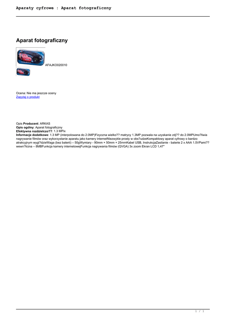 Aparaty cyfrowe : Aparat fotograficzny Aparat fotograficzny AFAJKO020010 Ocena: Nie ma jeszcze oceny Zapytaj o produkt Opis Producent: ARKAS Opis ogólny: Aparat fotograficzny Efektywna rozdzielczo??: 1.3 MPix Informacje dodatkowe: 1.3 MP (interpolowana do 2.0MP)Fizyczna wielko?? matrycy 1.3MP pozwala na uzyskanie zdj?? do 2.0MPUmo?liwia nagrywanie filmów oraz wykorzystanie aparatu jako kamery internetNiezwykle prosty w obs?udzeKompaktowy aparat cyfrowy o bardzo atrakcyjnym wygl?dzieWaga (bez baterii) – 50gWymiary - 90mm × 50mm × 25mmKabel USB, InstrukcjaZasilanie - baterie 2 x AAA 1.5VPami?? wewn?trzna – 8MBFunkcja kamery internetowejFunkcja nagrywania filmów (QVGA) 3x zoom Ekran LCD 1,47'' 1 / 1 Powered by TCPDF (www.tcpdf.org)