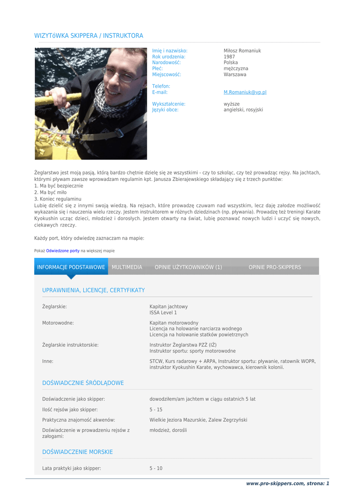 WIZYTóWKA SKIPPERA / INSTRUKTORA Imię i nazwisko: Rok urodzenia: Narodowość: Płeć: Miejscowość: Miłosz Romaniuk 1987 Polska mężczyzna Warszawa Telefon: E-mail: [email protected] Wykształcenie: Języki obce: wyższe angielski, rosyjski Żeglarstwo jest moją pasją, którą bardzo chętnie dzielę się ze wszystkimi - czy to szkoląc, czy też prowadząc rejsy. Na jachtach, którymi pływam zawsze wprowadzam regulamin kpt. Janusza Zbierajewskiego składający się z trzech punktów: 1. Ma być bezpiecznie 2. Ma być miło 3. Koniec regulaminu Lubię dzielić się z innymi swoją wiedzą. Na rejsach, które prowadzę czuwam nad wszystkim, lecz daję załodze możliwość wykazania się i nauczenia wielu rzeczy. Jestem instruktorem w różnych dziedzinach (np. pływania). Prowadzę też treningi Karate Kyokushin ucząc dzieci, młodzież i dorosłych. Jestem otwarty na świat, lubię poznawać nowych ludzi i uczyć się nowych, ciekawych rzeczy. Każdy port, który odwiedzę zaznaczam na mapie: Pokaż Odwiedzone porty na większej mapie INFORMACJE PODSTAWOWE MULTIMEDIA OPINIE UŻYTKOWNIKÓW (1) OPINIE PRO-SKIPPERS UPRAWNIENIA, LICENCJE, CERTYFIKATY Żeglarskie: Kapitan jachtowy ISSA Level 1 Motorowodne: Kapitan motorowodny Licencja na holowanie narciarza wodnego Licencja na holowanie statków powietrznych Żeglarskie instruktorskie: Instruktor Żeglarstwa PZŻ (IŻ) Instruktor sportu: sporty motorowodne Inne: STCW, Kurs radarowy + ARPA, Instruktor sportu: pływanie, ratownik WOPR, instruktor Kyokushin Karate, wychowawca, kierownik kolonii. DOŚWIADCZNIE ŚRÓDLĄDOWE Doświadczenie jako skipper: dowodziłem/am jachtem w ciągu ostatnich 5 lat Ilość rejsów jako skipper: 5 - 15 Praktyczna znajomość akwenów: Wielkie Jeziora Mazurskie, Zalew Zegrzyński Doświadczenie w prowadzeniu rejsów z załogami: młodzież, dorośli DOŚWIADCZENIE MORSKIE Lata praktyki jako skipper: 5 - 10 www.pro-skippers.com, strona: 1 Całkowity staż morski (ilość godzin): > 5000 (jako skipper: 500 - 5000) Ilość odbytych rejsów: > 50 (jako skipper: 10 - 50) Doświadczenie w prowadzeniu jachtów: Ilość kadłubów: jednokadłubowy Długość [m]: < 12, 12-16, > 24 Rodzaj napędu: żaglowy, silnik przyczepny Praktyczna znajomość akwenów: Morze Bałtyckie, Morze Północne, Chorwacja, Grecja, Włochy, Francja, Hiszpania, Baleary Doświadczenie w prowadzeniu rejsów z załogami: młodzież, dorośli, niewidomi z projektu Zobaczyć Morze DOŚWIADCZNIE SZKOLENIOWE Łączna ilość odbytych szkoleń w charakterze kadry instruktorskiej: > 15 W tym w ostatnich 5 latach: > 15 Pełnione funkcje szkoleniowe: instruktor, KWZ, wykładowca DOŚWIADCZENIE REGATOWE Brak danych www.pro-skippers.com, strona: 2