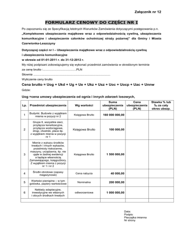 Załącznik nr 12 FORMULARZ CENOWY DO CZĘŚCI NR I Po zapoznaniu się ze Specyfikacją Istotnych Warunków Zamówienia dotyczącymi postępowania p.n. „Kompleksowe ubezpieczenia majątkowe wraz z odpowiedzialnością cywilną, ubezpieczenia komunikacyjne i ubezpieczenie członków ochotniczej straŜy poŜarnej” dla Gminy i Miasta Czerwionka-Leszczyny Dotyczącej części nr I – Ubezpieczenia majątkowe wraz z odpowiedzialnością cywilną i ubezpieczenia komunikacyjne w okresie od 01-01-2011 r. do 31-12-2012 r. My niŜej podpisani zobowiązujemy się wykonać przedmiot zamówienia w określonym terminie za cenę brutto :.......................................PLN Słownie .......................................................................................... Wyliczenie ceny brutto Cena brutto = Uog + Ukd + Ug + Ue + Ukz + Usz + Uoc + Uocp + Uac + Unnw Gdzie: Uog =cena umowy ubezpieczenia od ognia i innych zdarzeń losowych, Lp. Przedmiot ubezpieczenia Wg wartości 1 Budynki. Budowle z wyjątkiem mienia w pozycji nr 2 Księgowa Brutto 2 Grupa II, wszystkie sieci, przyłącza kanalizacyjne, przyłącza wodociągowe, drogi, chodniki, place itp. z wyjątkiem mienia w pozycji nr 1 Księgowa Brutto 3 Mienie z wykazu środków trwałych i innych wykazów, przedmioty niskocenne, maszyny, urządzenia, itp. nie ujęte w Ŝadnej ewidencji a będące własnością Zamawiającego, księgozbiory. Z wyjątkiem mienia z pozycji nr 1 i nr 2 Księgowa Brutto 4 Środki obrotowe (zapasy magazynowe) Cena nabycia 5 Wartości pienięŜne – w tym gotówka, papiery wartościowe Nominalna 6 Nakłady adaptacyjne, inwestycyjne we własnych i obcych środkach trwałych odtworzeniowa Suma ubezpieczenia (PLN) Cena ubezpieczenia (PLN) 160 000 000,00 100 000,00 1 500 000,00 40 000,00 200 000,00 1 000 000,00 Data: Podpis: Pieczątka imienna Nr strony Stawka % lub ‰ za cały okres ubezp. Załącznik nr 12 Ukd =cena umowy ubezpieczenia od kradzieŜy, rabunku i dewastacji, Suma System ubezpieczenia ubezpieczenia (PLN) Przedmiot ubezpieczenia Mienie z wykazu środków trwałych i innych wykazów, przedmioty niskocenne, maszyny, urządzenia, itp. nie ujęte w Ŝadnej ewidencji a będące własnością Zamawiającego, księgozbiory Elementy budynków i budowli (między innymi elementy ogrodzenia, sprzęt oświetleniowy, pokrywy włazów, studzienek kanalizacyjnych, elementy reklamowe, rynny, drzwi itp.) z włączeniem ryzyka kradzieŜy zwykłej Środki obrotowe (zapasy magazynowe) Na pierwsze ryzyko 400 000,00 Na pierwsze ryzyko 20 000,00 Na pierwsze ryzyko 20 000,00 Cena ubezp. (PLN) Stawka % lub ‰ za cały okres ubezp. Ukd= Ug =cena umowy ubezpieczenia wartości pienięŜnych – w tym gotówki, papierów wartościowych od kradzieŜy z włamaniem i rabunek Przedmiot ubezpieczenia Wartości pienięŜne, w tym gotówka i papiery wartościowe od kradzieŜy z włamaniem Wartości pienięŜne, w tym gotówka i papiery wartościowe od rabunku w lokalu Wartości pienięŜne, w tym gotówka i papiery wartościowe w transporcie Wartości pienięŜne – gotówka zbierana przez inkasentów i Sołtysów od kradzieŜy, rabunku i w transporcie System ubezpieczenia Suma ubezpieczenia (PLN) Na pierwsze ryzyko 200 000,00 Na pierwsze ryzyko 200 000,00 Na pierwsze ryzyko 200 000,00 Na pierwsze ryzyko 30 000,00 Cena ubezpieczenia (PLN) Stawka % lub ‰ za cały okres ubezp.. Ug= Data: Podpis: Pieczątka imienna Nr strony Załącznik nr 12 Ue =cena umowy ubezpieczenia sprzętu elektronicznego Przedmiot ubezpieczenia (Sprzęt elektroniczny, przyjmuje się do ubezpieczenia bez względu na wiek) System ubezpieczenia Suma ubezpieczenia (PLN) Sprzęt komputerowy Księgowej Brutto 3 410 000,00 Pozostały sprzęt: centrale, kopiarki, faksy itp. Księgowej Brutto 1 000 000,00 Sprzęt przenośny: komputery, kamery, urządzenia specjalistyczne itp. Księgowej Brutto 340 000,00 Oprogramowanie Księgowej Brutto 50 000,00 Cena ubezpieczenia (PLN) Stawka % lub ‰ za cały okres ubezp. Ue= Ukz =cena umowy ubezpieczenia kosztów naprawy zabezpieczeń Przedmiot ubezpieczenia System ubezpieczenia Koszty naprawy lub wymiany utraconych, zniszczonych lub uszkodzonych zabezpieczeń łącznie z kosztami usunięcia uszkodzeń ścian, podłóg, dachów, okien i drzwi Na pierwsze ryzyko Suma ubezpieczenia (PLN) Cena ubezpieczenia (PLN) Stawka % lub ‰ za cały okres ubezp. 20 000,00 Ukz= Usz =cena umowy ubezpieczenia szyb i innych przedmiotów od stłuczenia Przedmiot ubezpieczenia System ubezpieczenia Oszklenie ścian i dachów, szyby okienne i drzwiowe (w tym szyby specjalne, antywłamaniowe), szyldy, tablice reklamowe, itp. Ryzyka dodatkowe: koszty demontaŜu, montaŜu, transport; koszty ustawienia i rozebrania rusztowań, koszty wykonania znaków reklamowych Pierwsze ryzyko Suma ubezpieczenia (PLN) Cena ubezpieczenia (PLN) Stawka % lub ‰ za cały okres ubezp. 30 000,00 Usz= Data: Podpis: Pieczątka imienna Nr strony Załącznik nr 12 Uoc =cena umowy ubezpieczenia odpowiedzialności cywilnej zamawiającego Przedmiot ubezpieczenia Suma ubezpieczenia (EURO) Suma ubezpieczenia (PLN) Cena ubezpieczenia (PLN) 1 000 000,00 OC Deliktowo kontraktowa OC PRODUKTU z włączeniem ryzyka przeniesienia chorób zakaźnych, w tym zatruć pokarmowych 200 000,00 OC opiekunów wyjazdów, wycieczek itp. 200 000,00 500 000,00 OC Pracodawcy OC Zarządcy Nieruchomości – zgodnie z Rozporządzeniem Ministra Finansów z dnia 21 września 2004r., w sprawie obowiązkowego ubezpieczenia odpowiedzialności cywilnej zarządcy nieruchomości – podstawa prawna Dz. U. Nr 207, poz. 2114. 50 000,00 200 000,00* Uoc= * dla celów porównawczych niniejszej specyfikacji przyjęto wartość 4,00 pln za jedno EURO Tabela wskaźników do umowy ubezpieczenia odpowiedzialności cywilnej Przedmiot ubezpieczenia sposób (od obrotu, od sumy ubezpieczenia itp.) obliczania ceny w ubezpieczeniu odpowiedzialności cywilnej Stawka %, ‰ lub kwotowa za cały okres ubezp. OC Deliktowo kontraktowa