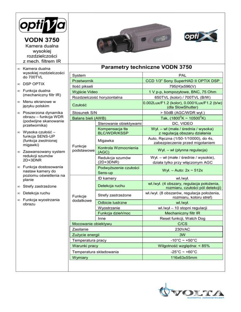 VODN 3750 Kamera dualna wysokiej rozdzielczości z mech. filtrem IR • Kamera dualna wysokiej rozdzielczości do 700TVL • DSP OPTIX • Funkcja dualna (mechaniczny filtr IR) • Menu ekranowe w języku polskim • Poszerzona dynamika obrazu – funkcja WDR (podwójne skanowanie przetwornika) • Wysoka czułość – funkcja SENS-UP (funkcja zwolnionej migawki) • Zaawansowany system redukcji szumów 2D+3DNR • Funkcja dostosowania nastaw kamery do poziomu oświetlenia na planie • Strefy zastrzeżone • Detekcja ruchu • Funkcja wyostrzania obrazu Parametry techniczne VODN 3750 System Przetwornik Ilość pikseli Wyjście Video Rozdzielczość horyzontalna PAL CCD 1/3" Sony SuperHAD II OPTIX DSP 795(H)x596(V) 1 V p-p, kompozytowe, BNC, 75 Ohm 650TVL (kolor) / 700TVL (B/W) 0.002Lux/F1.2 (kolor), 0.0001Lux/F1.2 (b/w) Czułość (dla SlowShutter) Stosunek S/N > 50dB (AGC/WDR wył.) 0 0 Balans bieli (AWB) Tak, (1800 K ~ 10500 K) Sterowanie obiektywami DC, VIDEO Kompensacja tła Wył. – wł (mała / średnia / wysoka) BLC/WDR/KSSP z regulacją obszaru działania Auto, Ręczna (1/50-1/10000), do 4s, Migawka zabezpieczenie przed migotaniem Funkcje Kontrola Wzmocnienia Wył. – wł (płynna regulacja) podstawowe (AGC) Wył. – wł (małe / średnie / wysokie), Redukcja szumów (2D+3DNR) działa tylko przy włączonym AGC Podwyższenie czułości Wył. – Auto: 2x ~ 512x Sens-up ID kamery wł./wył. wł./wył. (4 obszary, regulacja położenia, Detekcja ruchu rozmiaru, czułości pól detekcji) wł./wył. (8 obszarów, regulacja położenia, Strefy zastrzeżone Funkcje rozmiaru, koloru stref) dodatkowe Odbicie lustrzne wł./wył. Wyostrzanie wł./wył – 10 stopni regulacji Funkcja dzień/noc Mechaniczny filtr IR Inne Reset funkcji, Watch Dog Mocowanie obiektywu C/CS Zasilanie 230VAC Zużycie energii 3W Temperatura pracy -10°C ~ +50°C Warunki pracy Wilgotność względna: < 85% Temperatura składowania -25°C ~ +60°C Wymiary 116x63x55mm