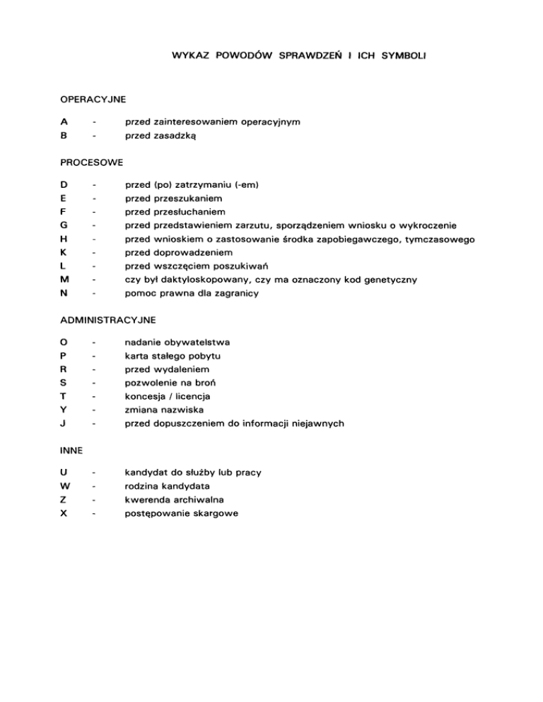 WYKAZ POWODÓW SPRAWDZEŃ l ICH SYMBOLI OPERACYJNE A - przed zainteresowaniem operacyjnym B - przed zasadzką PROCESOWE D - przed (po) zatrzymaniu (-em) E - przed przeszukaniem F - przed przesłuchaniem G - przed przedstawieniem zarzutu, sporządzeniem wniosku o wykroczenie H K - przed wnioskiem o zastosowanie środka zapobiegawczego, tymczasowego przed doprowadzeniem L - przed wszczęciem poszukiwań M - czy był daktyloskopowany, czy ma oznaczony kod genetyczny N - pomoc prawna dla zagranicy ADMINISTRACYJNE O - nadanie obywatelstwa P - karta stałego pobytu R - przed wydaleniem S - pozwolenie na broń T - koncesja / licencja Y - zmiana nazwiska J - przed dopuszczeniem do informacji niejawnych U - kandydat do służby lub pracy W - rodzina kandydata Z - kwerenda archiwalna X - postępowanie skargowe INNE