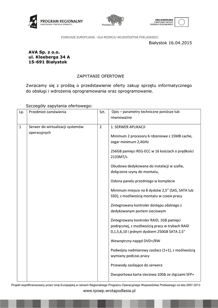 Białystok 16.04.2015 AVA Sp. z o.o. ul. Kleeberga 34 A 15-691 Białystok ZAPYTANIE OFERTOWE Zwracamy się z prośbą o przedstawienie oferty zakup sprzętu informatycznego do obsługi i wdrożenia oprogramowania oraz oprogramowanie. Szczegóły zapytania ofertowego: Lp. Przedmiot zamówienia 1 Serwer do wirtualizacji systemów operacyjnych Szt. Opis – parametry techniczne poniższe lub równoważne 2 1. SERWER APLIKACJI Minimum 2 procesory 6 rdzeniowe z 15MB cache, zegar minimum 2,4GHz 256GB pamięci REG-ECC w 16 kościach o prędkości 2133MT/s Obudowa dedykowana do instalacji w szafie, dołączone szyny do montażu, Osłona panelu przedniego w komplecie Minimum miejsce na 8 dysków 2,5" (SAS, SATA lub SSD), z możliwością montażu w czasie pracy Zintegrowany kontroler dostępu zdalnego z dedykowanym portem sieciowym Zintegrowany kontroler RAID, 1GB pamięci podręcznej, z możliwością pracy w trybach RAID 0,1,5,6,10 i jednym dyskiem 250GB SATA 2,5" Wewnętrzny napęd DVD+/RW Podwójny nadmiarowy zasilacz (1+1), z możliwością wymiany podczas pracy Przewody zasilające do serwera Dwuportowa karta sieciowa 10Gb ze złączami SFP+ Projekt współfinansowany przez Unię Europejską w ramach Regionalnego Programu Operacyjnego Województwa Podlaskiego na lata 2007-2013 Czteroportowa karta sieciowa 1Gb ze złączami RJ-45 2 karty SD dla uruchomienia systemu wirtualizacji Dysk SSD wpinany do szyny PCI-Ex o pojemności minimum 400GB 2. SERWER BAZY DANYCH Minimum 2 procesory 6 rdzeniowe z 20MB cache, zegar minimum 3,4GHz 256GB pamięci REG-ECC w 16 kościach o prędkości 2133MT/s Obudowa dedykowana do instalacji w szafie, dołączone szyny do montażu, Osłona panelu przedniego w komplecie Minimum miejsce na 8 dysków 2,5" (SAS, SATA lub SSD), z możliwością montażu w czasie pracy Zintegrowany kontroler dostępu zdalnego z dedykowanym portem sieciowym Zintegrowany kontroler RAID, 1GB pamięci podręcznej, z możliwością pracy w trybach RAID 0,1,5,6,10 i jednym dyskiem 250GB SATA 2,5" Wewnętrzny napęd DVD+/RW Podwójny nadmiarowy zasilacz (1+1), z możliwością wymiany podczas pracy Przewody zasilające do serwera Dwuportowa karta sieciowa 10Gb ze złączami SFP+ Czteroportowa karta sieciowa 1Gb ze złączami RJ-45 2 karty SD dla uruchomienia systemu wirtualizacji Dysk SSD wpinany do szyny PCI-Ex o pojemności minimum 400GB Projekt współfinansowany przez Unię Europejską w ramach Regionalnego Programu Operacyjnego Województwa Podlaskiego na lata 2007-2013 3. WSPÓLNA PRZESTRZEŃ DYSKOWA Producent urządzenia musi być identyczny z producentem serwera Musi pozwalać na montaż 24 dysków 2,5" (SAS, SATA lub SSD), z możliwością montażu w czasie pracy Musi posiadać co najmniej 2 kontrolery, każdy z 4GB cache Musi pozwolić na pracę w trybie SAS-12G lub FC16 Musi mieć dodatkowo dwie karty kontrolerów SAS lub FC dwuportowe dla powyższych serwerów wraz z okablowaniem Musi mieć minimum 4TB użytkowej skonfigurowanej w R10 na dyskach SAS 15k Minimum jeden dysk jako Hot-Spare zainstalowany już w macierzy Podwójny nadmiarowy zasilacz 4. OGÓLNE Gwarancja 3 lata, z naprawą w następnym dniu roboczym w siedzibie klienta Serwery i przestrzeń dyskowa muszą być wpisany na listę HCL wybranych dostawców systemu wirtualizacji (vmware, microsoft) 2 Zasilanie awaryjne – zasilacz 1 Zasilacz awaryjny UPS do podtrzymania pracy serwera i elementów sieci komputerowej o mocy min. 5kVA i czasie pracy na baterii min. 2h przy założeniu 50% obciążenia, umożliwiający bezpieczne automatyczne wyłączenie serwera i systemów wirtualizacji oraz systemów operacyjnych. Podłączenie jedno fazowe, karta zarządzania ze złączem sieci LAN. Gwarancja 3 lata. Do montażu w szafie rack. Projekt współfinansowany przez Unię Europejską w ramach Regionalnego Programu Operacyjnego Województwa Podlaskiego na lata 2007-2013 3 Zasilanie awaryjne – baterie 3 Bateria do zasilacza awaryjnego dopasowane do powyższego urządzenia. Do montażu w szafie rack. 4 Router sieci do komunikacji z Internetem 1 Router sieci zapewniający dostęp do/z Internetu dla sieci wewnętrznej AVA. Router będzie wyposażony w: - funkcję firewall - funkcję IDS/ IPS - transparent proxy z klasyfikacją ruchu opartą na zewnętrznych serwerach analitycznych oraz wadze słów kluczowych - usługę VPN bez limitu klientów - obudowa 1U - jeden port rozbudowy PCI-Ex x16 - gwarancja 3 lata 5 System wirtualizacji SO do głównego serwera 1 Licencja na sześć fizycznych procesorów i maksymalnie do 3 serwerów, system zgodny z Serwerem do Wirtualizacji Systemów Operacyjnych i z Systemami Operacyjnymi. Minimum 1 rok wsparcia technicznego. Możliwość migracji maszyn online. Zintegrowane oprogramowanie do kopii zapasowych. 6 System operacyjny serwera SQL 1 System operacyjny 64 bitowy zgodny z serwerem SQL i oprogramowaniem produkcyjnym w firmie AVA. Do tego 40 licencji dostępowych do Serwera. Licencje nie mogą być przywiązane do sprzętu. 7 System operacyjny serwera WWW 1 System Operacyjny 64 bitowy zgodny z oprogramowaniem produkcyjnym w firmie AVA. Licencje nie mogą być przywiązane do sprzętu. 8 System operacyjny serwera kontroler domeny 1 System Operacyjny 64 bitowy zgodny oprogramowaniem produkcyjnym w firmie AVA i serwerem poczty elektronicznej. Licencje nie mogą być przywiązane do sprzętu. 9 System operacyjny serwera terminali do pracy zdalnej 1 System operacyjny 64 bitowy z licencja na 10 użytkowników do pracy zdalnej przez Internet zgodny oprogramowaniem produkcyjnym w firmie AVA. Projekt współfinansowany przez Unię Europejską w ramach Regionalnego Programu Operacyjnego Województwa Podlaskiego na lata 2007-2013 Licencje nie mogą być przywiązane do sprzętu. 10 System antywirusowy ze scentralizowanym zarządzaniem 1 System Antywirusowy z centralnym zarządzaniem z licencją na 40 użytk. Zgodny z systemami operacyjnym użytkowanymi w firmie AVA. Z dwuletnim okresem aktualizacji. 11 Syste