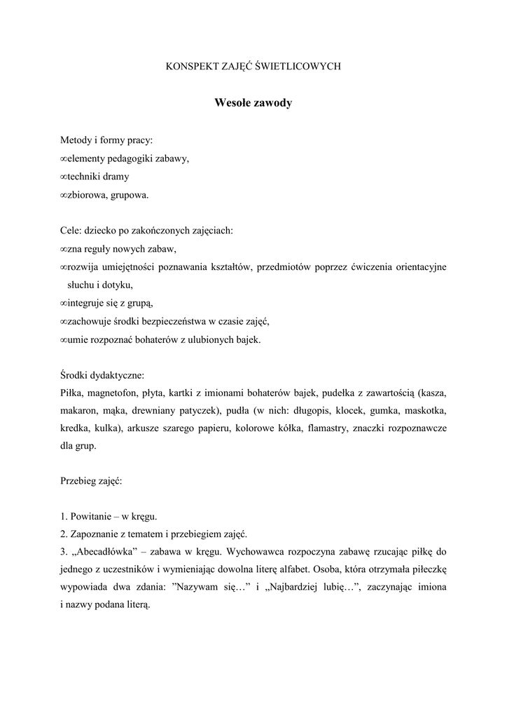KONSPEKT ZAJĘĆ ŚWIETLICOWYCH Wesołe zawody Metody i formy pracy: • elementy pedagogiki zabawy, • techniki dramy • zbiorowa, grupowa. Cele: dziecko po zakończonych zajęciach: • zna reguły nowych zabaw, • rozwija umiejętności poznawania kształtów, przedmiotów poprzez ćwiczenia orientacyjne słuchu i dotyku, • integruje się z grupą, • zachowuje środki bezpieczeństwa w czasie zajęć, • umie rozpoznać bohaterów z ulubionych bajek. Środki dydaktyczne: Piłka, magnetofon, płyta, kartki z imionami bohaterów bajek, pudełka z zawartością (kasza, makaron, mąka, drewniany patyczek), pudła (w nich: długopis, klocek, gumka, maskotka, kredka, kulka), arkusze szarego papieru, kolorowe kółka, flamastry, znaczki rozpoznawcze dla grup. Przebieg zajęć: 1. Powitanie – w kręgu. 2. Zapoznanie z tematem i przebiegiem zajęć. 3. „Abecadłówka” – zabawa w kręgu. Wychowawca rozpoczyna zabawę rzucając piłkę do jednego z uczestników i wymieniając dowolna literę alfabet. Osoba, która otrzymała piłeczkę wypowiada dwa zdania: ”Nazywam się…” i „Najbardziej lubię…”, zaczynając imiona i nazwy podana literą. 4. „Muzyczny spacer”- zabawa ruchowa przy muzyce. Wszyscy spacerują w rytm muzyki. Gdy muzyka zostaje przerwana dzieci wykonują polecenia podane przez prowadzącego. 5. Podział na grupy (grupa czerwonych i zielonych) i zapoznanie z zasadami współzawodnictwa grup- ustalenie sygnałów rozpoczynających i kończących zabawy, przydzielanie punktów za poprawnie wykonane zadanie. 6. Sławne postacie z bajek - grupy losują kartki z imionami bohaterów bajek: Gargamel, Czerwony Kapturek, Śpiąca Królewna, Kot w butach. Przedstawiciel grupy przedstawia postać, a grupa przeciwna odgaduje jej imię. 7. „Co jest w pudełku?” – grupy otrzymują pudełka z zawartością i muszą odgadnąć, co jest w środku (piszą na kartce)- ćwiczenie słuchu. 8. „Rozbitek i rekiny” – każda grupa otrzymuje arkusz szarego papieru i wybiera swojego rozbitka. Papier to wyspa. Grupa przeciwna to rekiny. Rekiny zjadają wyspę odrywając papier. Rozbitek może się bronić usypiając rekiny uderzeniami w ręce. Uderzony rekin odpada z gry. 9. „Pudło z niespodzianką” – grupy siedzą w szeregu naprzeciw siebie. Każda grupa otrzymuje pudło z przedmiotami (jednakowymi dla obu grup). Każdy zawodnik musi znaleźć dotykiem przedmiot wymieniony przez wychowawcę, wyjąć go i położyć przed sobą. Czas szukania określa muzyka. 10. „Maska” – zabawa w kręgu, dla całej grupy. Każdy zasłania dłonią twarz. Odsłaniając ją wkłada maską emocji i uczuć podanych przez wychowawcę: nieśmiały uśmiech, złość, strach, zdziwienie, wielka radość. 11. Podsumowanie zajęć- uczniowie przyklejają kolorowe kółko z narysowaną buźką wyrażającą ocenę przeprowadzonych zajęć Opracowała: mgr Anna Szczepańczyk - wychowawca świetlicy ZSO nr8 – SP nr 3 im. Elizy Orzeszkowej w Sosnowcu