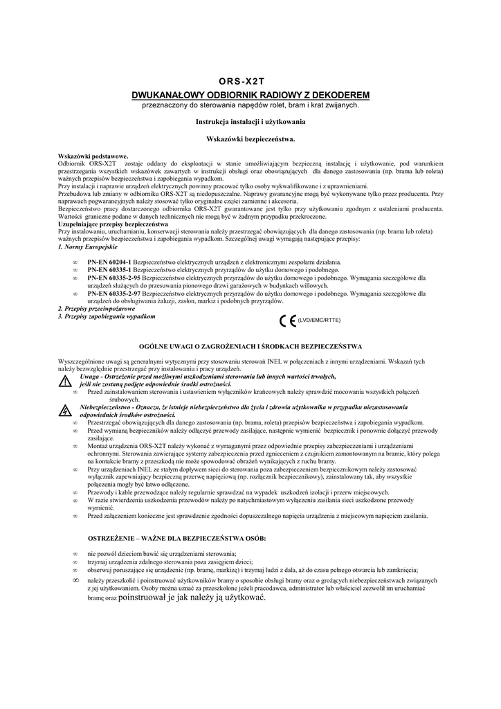 ORS-X2T DWUKANAŁOWY ODBIORNIK RADIOWY Z DEKODEREM przeznaczony do sterowania napędów rolet, bram i krat zwijanych. Instrukcja instalacji i uŜytkowania Wskazówki bezpieczeństwa. Wskazówki podstawowe. Odbiornik ORS-X2T zostaje oddany do eksploatacji w stanie umoŜliwiającym bezpieczną instalację i uŜytkowanie, pod warunkiem przestrzegania wszystkich wskazówek zawartych w instrukcji obsługi oraz obowiązujących dla danego zastosowania (np. brama lub roleta) waŜnych przepisów bezpieczeństwa i zapobiegania wypadkom. Przy instalacji i naprawie urządzeń elektrycznych powinny pracować tylko osoby wykwalifikowane i z uprawnieniami. Przebudowa lub zmiany w odbiorniku ORS-X2T są niedopuszczalne. Naprawy gwarancyjne mogą być wykonywane tylko przez producenta. Przy naprawach pogwarancyjnych naleŜy stosować tylko oryginalne części zamienne i akcesoria. Bezpieczeństwo pracy dostarczonego odbiornika ORS-X2T gwarantowane jest tylko przy uŜytkowaniu zgodnym z ustaleniami producenta. Wartości graniczne podane w danych technicznych nie mogą być w Ŝadnym przypadku przekroczone. Uzupełniające przepisy bezpieczeństwa Przy instalowaniu, uruchamianiu, konserwacji sterowania naleŜy przestrzegać obowiązujących dla danego zastosowania (np. brama lub roleta) waŜnych przepisów bezpieczeństwa i zapobiegania wypadkom. Szczególnej uwagi wymagają następujące przepisy: 1. Normy Europejskie • • • PN-EN 60204-1 Bezpieczeństwo elektrycznych urządzeń z elektronicznymi zespołami działania. PN-EN 60335-1 Bezpieczeństwo elektrycznych przyrządów do uŜytku domowego i podobnego. PN-EN 60335-2-95 Bezpieczeństwo elektrycznych przyrządów do uŜytku domowego i podobnego. Wymagania szczegółowe dla urządzeń słuŜących do przesuwania pionowego drzwi garaŜowych w budynkach willowych. • PN-EN 60335-2-97 Bezpieczeństwo elektrycznych przyrządów do uŜytku domowego i podobnego. Wymagania szczegółowe dla urządzeń do obsługiwania Ŝaluzji, zasłon, markiz i podobnych przyrządów. 2. Przepisy przeciwpoŜarowe 3. Przepisy zapobiegania wypadkom OGÓLNE UWAGI O ZAGROśENIACH I ŚRODKACH BEZPIECZEŃSTWA Wyszczególnione uwagi są generalnymi wytycznymi przy stosowaniu sterowań INEL w połączeniach z innymi urządzeniami. Wskazań tych naleŜy bezwzględnie przestrzegać przy instalowaniu i pracy urządzeń. Uwaga - OstrzeŜenie przed moŜliwymi uszkodzeniami sterowania lub innych wartości trwałych, jeśli nie zostaną podjęte odpowiednie środki ostroŜności. • Przed zainstalowaniem sterowania i ustawieniem wyłączników krańcowych naleŜy sprawdzić mocowania wszystkich połączeń śrubowych. Niebezpieczeństwo - Oznacza, Ŝe istnieje niebezpieczeństwo dla Ŝycia i zdrowia uŜytkownika w przypadku niezastosowania odpowiednich środków ostroŜności. • Przestrzegać obowiązujących dla danego zastosowania (np. brama, roleta) przepisów bezpieczeństwa i zapobiegania wypadkom. Przed wymianą bezpieczników naleŜy odłączyć przewody zasilające, następnie wymienić bezpiecznik i ponownie dołączyć przewody • zasilające. • MontaŜ urządzenia ORS-X2T naleŜy wykonać z wymaganymi przez odpowiednie przepisy zabezpieczeniami i urządzeniami ochronnymi. Sterowania zawierające systemy zabezpieczenia przed zgnieceniem z czujnikiem zamontowanym na bramie, który polega na kontakcie bramy z przeszkodą nie moŜe spowodować obraŜeń wynikających z ruchu bramy. • Przy urządzeniach INEL ze stałym dopływem sieci do sterowania poza zabezpieczeniem bezpiecznikowym naleŜy zastosować wyłącznik zapewniający bezpieczną przerwę napięciową (np. rozłącznik bezpiecznikowy), zainstalowany tak, aby wszystkie połączenia mogły być łatwo odłączone. • Przewody i kable przewodzące naleŜy regularnie sprawdzać na wypadek uszkodzeń izolacji i przerw miejscowych. W razie stwierdzenia uszkodzenia przewodów naleŜy po natychmiastowym wyłączeniu zasilania sieci uszkodzone przewody • wymienić. • Przed załączeniem konieczne jest sprawdzenie zgodności dopuszczalnego napięcia urządzenia z miejscowym napięciem zasilania. OSTRZEśENIE – WAśNE DLA BEZPIECZEŃSTWA OSÓB: • • • • nie pozwól dzieciom bawić się urządzeniami sterowania; trzymaj urządzenia zdalnego sterowania poza zasięgiem dzieci; obserwuj poruszające się urządzenie (np. bramę, markizę) i trzymaj ludzi z dala, aŜ do czasu pełnego otwarcia lub zamknięcia; naleŜy przeszkolić i poinstruować uŜytkowników bramy o sposobie obsługi bramy oraz o groŜących niebezpieczeństwach związanych z jej uŜytkowaniem. Osoby moŜna uznać za przeszkolone jeŜeli pracodawca, administrator lub właściciel zezwolił im uruchamiać bramę oraz poinstruował je jak naleŜy ją uŜytkować. Instrukcja montaŜu i specyfikacja techniczna G1 D4 PR3, PR4 1, 2 24V DC 12V DC SW1 SW2 - gniazdo radioodbiornika, - dioda świecąca, - przekaźniki kanału 1 i 2 - zaciski przekaźników kanałów 1 i 2, - zasilanie 24VDC/AC niestabilizowane, - zasilanie 12VDC stabilizowane, - przycisk uczenia kodów - przycisk kasowania wyuczonych kodów, DANE TECHNICZNE DEKODERA ORS-X2T Napięcie zasilania 24V/DC/AC lub 12VDC, Pobór prądu 10mA (stand-by), Częstotliwość pracy 435MHz, Impedancja wejścia antenowego 50Ω, Liczba kanałów 2 Zasięg·· >>100m OPIS DZIAŁANIA DEKODERA Dekoder zdalnego sterowania ORS-X2T z dołączonym odbiornikiem radiowym pozwala na sterowanie dwóch niezaleŜnych urządzeń. Wyjścia dekodera stanowią dwie pary zacisków dołączonych do styków niezaleŜnych przekaźników. Dekoder moŜe współpracować z pilotami dwu i cztero kanałowymi. Po naciśnięciu klawisza na pilocie styki odpowiedniego przekaźnika zostaną zwarte na czas tym dłuŜszy, im dłuŜej będziemy trzymać naciśnięty klawisz pilota. Styki ulegną rozłączeniu ok. 1 sekundę po zwolnieniu klawisza na pilocie. Jednoczesne naciśnięcie obu klawiszy pilota nie powoduje zadziałania deko