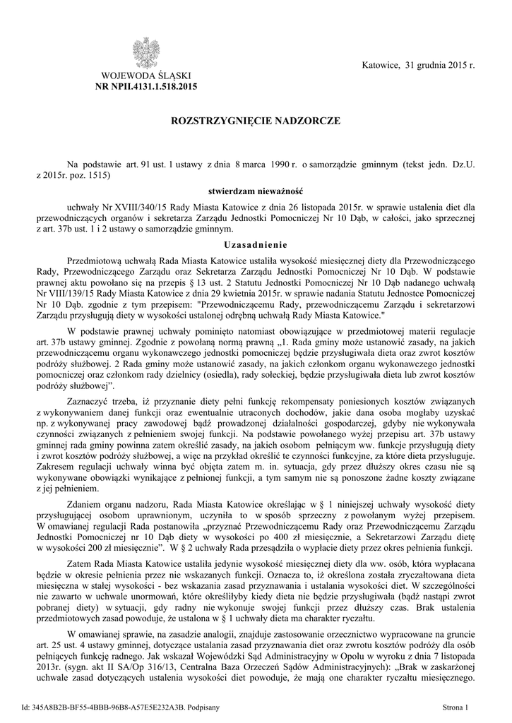 Katowice, 31 grudnia 2015 r. WOJEWODA ŚLĄSKI NR NPII.4131.1.518.2015 ROZSTRZYGNIĘCIE NADZORCZE Na podstawie art. 91 ust. 1 ustawy z dnia 8 marca 1990 r. o samorządzie gminnym (tekst jedn. Dz.U. z 2015r. poz. 1515) stwierdzam nieważność uchwały Nr XVIII/340/15 Rady Miasta Katowice z dnia 26 listopada 2015r. w sprawie ustalenia diet dla przewodniczących organów i sekretarza Zarządu Jednostki Pomocniczej Nr 10 Dąb, w całości, jako sprzecznej z art. 37b ust. 1 i 2 ustawy o samorządzie gminnym. Uzasadnienie Przedmiotową uchwałą Rada Miasta Katowice ustaliła wysokość miesięcznej diety dla Przewodniczącego Rady, Przewodniczącego Zarządu oraz Sekretarza Zarządu Jednostki Pomocniczej Nr 10 Dąb. W podstawie prawnej aktu powołano się na przepis § 13 ust. 2 Statutu Jednostki Pomocniczej Nr 10 Dąb nadanego uchwałą Nr VIII/139/15 Rady Miasta Katowice z dnia 29 kwietnia 2015r. w sprawie nadania Statutu Jednostce Pomocniczej Nr 10 Dąb. zgodnie z tym przepisem: "Przewodniczącemu Rady, przewodniczącemu Zarządu i sekretarzowi Zarządu przysługują diety w wysokości ustalonej odrębną uchwałą Rady Miasta Katowice." W podstawie prawnej uchwały pominięto natomiast obowiązujące w przedmiotowej materii regulacje art. 37b ustawy gminnej. Zgodnie z powołaną normą prawną „1. Rada gminy może ustanowić zasady, na jakich przewodniczącemu organu wykonawczego jednostki pomocniczej będzie przysługiwała dieta oraz zwrot kosztów podróży służbowej. 2 Rada gminy może ustanowić zasady, na jakich członkom organu wykonawczego jednostki pomocniczej oraz członkom rady dzielnicy (osiedla), rady sołeckiej, będzie przysługiwała dieta lub zwrot kosztów podróży służbowej”. Zaznaczyć trzeba, iż przyznanie diety pełni funkcję rekompensaty poniesionych kosztów związanych z wykonywaniem danej funkcji oraz ewentualnie utraconych dochodów, jakie dana osoba mogłaby uzyskać np. z wykonywanej pracy zawodowej bądź prowadzonej działalności gospodarczej, gdyby nie wykonywała czynności związanych z pełnieniem swojej funkcji. Na podstawie powołanego wyżej przepisu art. 37b ustawy gminnej rada gminy powinna zatem określić zasady, na jakich osobom pełniącym ww. funkcje przysługują diety i zwrot kosztów podróży służbowej, a więc na przykład określić te czynności funkcyjne, za które dieta przysługuje. Zakresem regulacji uchwały winna być objęta zatem m. in. sytuacja, gdy przez dłuższy okres czasu nie są wykonywane obowiązki wynikające z pełnionej funkcji, a tym samym nie są ponoszone żadne koszty związane z jej pełnieniem. Zdaniem organu nadzoru, Rada Miasta Katowice określając w § 1 niniejszej uchwały wysokość diety przysługującej osobom uprawnionym, uczyniła to w sposób sprzeczny z powołanym wyżej przepisem. W omawianej regulacji Rada postanowiła „przyznać Przewodniczącemu Rady oraz Przewodniczącemu Zarządu Jednostki Pomocniczej nr 10 Dąb diety w wysokości po 400 zł miesięcznie, a Sekretarzowi Zarządu dietę w wysokości 200 zł miesięcznie”. W § 2 uchwały Rada przesądziła o wypłacie diety przez okres pełnienia funkcji. Zatem Rada Miasta Katowice ustaliła jedynie wysokość miesięcznej diety dla ww. osób, która wypłacana będzie w okresie pełnienia przez nie wskazanych funkcji. Oznacza to, iż określona została zryczałtowana dieta miesięczna w stałej wysokości - bez wskazania zasad przyznawania i ustalania wysokości diet. W szczególności nie zawarto w uchwale unormowań, które określiłyby kiedy dieta nie będzie przysługiwała (bądź nastąpi zwrot pobranej diety) w sytuacji, gdy radny nie wykonuje swojej funkcji przez dłuższy czas. Brak ustalenia przedmiotowych zasad powoduje, że ustalona w § 1 uchwały dieta ma charakter ryczałtu. W omawianej sprawie, na zasadzie analogii, znajduje zastosowanie orzecznictwo wypracowane na gruncie art. 25 ust. 4 ustawy gminnej, dotyczące ustalania zasad przyznawania diet oraz zwrotu kosztów podróży dla osób pełniących funkcję radnego. Jak wskazał Wojewódzki Sąd Administracyjny w Opolu w wyroku z dnia 7 listopada 2013r. (sygn. akt II SA/Op 316/13, Centralna Baza Orzeczeń Sądów Administracyjnych): „Brak w zaskarżonej uchwale zasad dotyczących ustalenia wysokości diet powoduje, że mają one charakter ryczałtu miesięcznego. Id: 345A8B2B-BF55-4BBB-96B8-A57E5E232A3B. Podpisany Strona 1 Ustalona w stałej kwocie dieta w formie ryczałtu miesięcznego traci charakter rekompensacyjny, a przyjmuje charakter stałego, miesięcznego wynagrodzenia, niezależnego od kosztów związanych z pełnieniem funkcji. Użyty przez ustawodawcę w przepisie art. 25 ust. 4 u.s.g. wyraz "dieta" należy rozumieć natomiast jako zwrot kosztów związanych z pełnieniem funkcji. Jego istota sprowadza się do wyrównywania wydatków i strat spowodowanych pełnieniem wskazanej funkcji. Jeżeli dieta sprowadza się do wyrównania wydatków i strat spowodowanych pełnieniem funkcji przewodniczącego rady, to osoba pełniąca funkcję przewodniczącego zachowuje prawo do zwrotu kosztów i wydatków poniesionych w związku ze sprawowaniem tej funkcji, a nie z tytułu samego faktu bycia taką osobą”. Powyższe stanowisko potwierdził również Naczelny Sąd Administracyjny w wyroku z dnia 26 czerwca 2014r., (sygn. akt II OSK 406/14, Centralna Baza Orzeczeń Sądów Administracyjnych) stwierdzając, iż w sytuacji, gdy ustalenie świadczenia następuje w formie ryczałtu, brak przewidzianych potrąceń diety za przypadki nieobecności przewodniczącego (radnego) na posiedzeniach, czy innych obowiązkowych czynnościach, sprawia, że nie mamy już do czynienia ze świadczeniem wyrównawczym (kompensacyjnym). Reasumując Rada Miasta Katowice, określając w kwestionowanej uchwale jedynie sztywne stawki diet dla Przewodniczącego Rady, Przewodniczącego Zarządu oraz Sekretarza Zarządu Jednostki Pomocniczej Nr 10 Dąb niezależnie od tego czy fakt