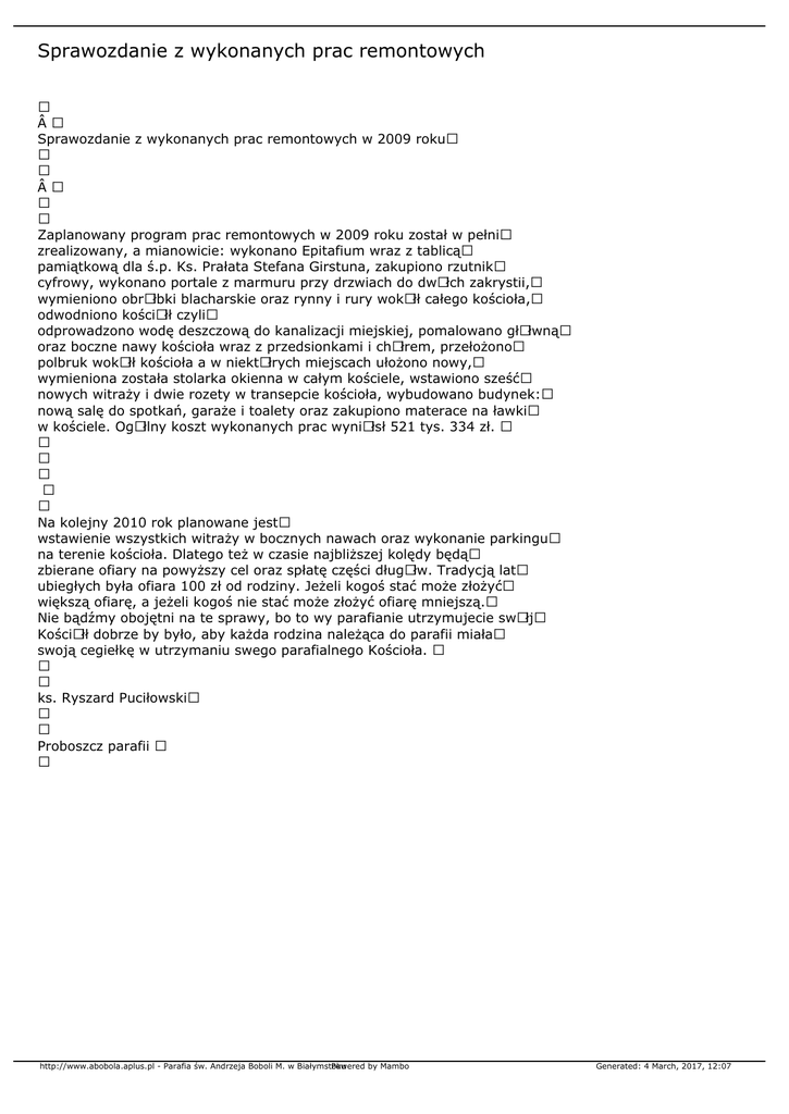Sprawozdanie z wykonanych prac remontowych  Sprawozdanie z wykonanych prac remontowych w 2009 roku  Zaplanowany program prac remontowych w 2009 roku został w pełni zrealizowany, a mianowicie: wykonano Epitafium wraz z tablicą pamiątkową dla ś.p. Ks. Prałata Stefana Girstuna, zakupiono rzutnik cyfrowy, wykonano portale z marmuru przy drzwiach do dwÃłch zakrystii, wymieniono obrÃłbki blacharskie oraz rynny i rury wokÃłł całego kościoła, odwodniono kościÃłł czyli odprowadzono wodę deszczową do kanalizacji miejskiej, pomalowano głÃłwną oraz boczne nawy kościoła wraz z przedsionkami i chÃłrem, przełożono polbruk wokÃłł kościoła a w niektÃłrych miejscach ułożono nowy, wymieniona została stolarka okienna w całym kościele, wstawiono sześć nowych witraży i dwie rozety w transepcie kościoła, wybudowano budynek: nową salę do spotkań, garaże i toalety oraz zakupiono materace na ławki w kościele. OgÃłlny koszt wykonanych prac wyniÃłsł 521 tys. 334 zł. Na kolejny 2010 rok planowane jest wstawienie wszystkich witraży w bocznych nawach oraz wykonanie parkingu na terenie kościoła. Dlatego też w czasie najbliższej kolędy będą zbierane ofiary na powyższy cel oraz spłatę części długÃłw. Tradycją lat ubiegłych była ofiara 100 zł od rodziny. Jeżeli kogoś stać może złożyć większą ofiarę, a jeżeli kogoś nie stać może złożyć ofiarę mniejszą. Nie bądźmy obojętni na te sprawy, bo to wy parafianie utrzymujecie swÃłj KościÃłł dobrze by było, aby każda rodzina należąca do parafii miała swoją cegiełkę w utrzymaniu swego parafialnego Kościoła. ks. Ryszard Puciłowski Proboszcz parafii http://www.abobola.aplus.pl - Parafia św. Andrzeja Boboli M. w Białymstoku Powered by Mambo Generated: 4 March, 2017, 12:07