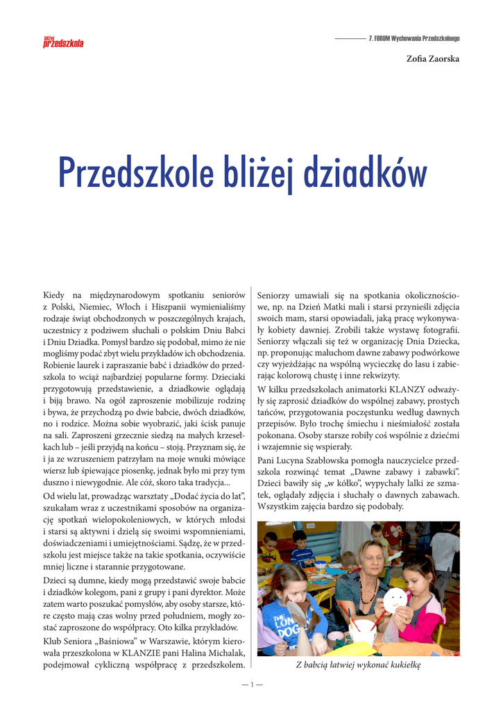 7. FORUM Wychowania Przedszkolnego Zofia Zaorska Przedszkole bliżej dziadków Kiedy na międzynarodowym spotkaniu seniorów z Polski, Niemiec, Włoch i Hiszpanii wymienialiśmy rodzaje świąt obchodzonych w poszczególnych krajach, uczestnicy z podziwem słuchali o polskim Dniu Babci i Dniu Dziadka. Pomysł bardzo się podobał, mimo że nie mogliśmy podać zbyt wielu przykładów ich obchodzenia. Robienie laurek i zapraszanie babć i dziadków do przedszkola to wciąż najbardziej popularne formy. Dzieciaki przygotowują przedstawienie, a dziadkowie oglądają i biją brawo. Na ogół zaproszenie mobilizuje rodzinę i bywa, że przychodzą po dwie babcie, dwóch dziadków, no i rodzice. Można sobie wyobrazić, jaki ścisk panuje na sali. Zaproszeni grzecznie siedzą na małych krzesełkach lub – jeśli przyjdą na końcu – stoją. Przyznam się, że i ja ze wzruszeniem patrzyłam na moje wnuki mówiące wiersz lub śpiewające piosenkę, jednak było mi przy tym duszno i niewygodnie. Ale cóż, skoro taka tradycja... Seniorzy umawiali się na spotkania okolicznościowe, np. na Dzień Matki mali i starsi przynieśli zdjęcia swoich mam, starsi opowiadali, jaką pracę wykonywały kobiety dawniej. Zrobili także wystawę fotografii. Seniorzy włączali się też w organizację Dnia Dziecka, np. proponując maluchom dawne zabawy podwórkowe czy wyjeżdżając na wspólną wycieczkę do lasu i zabierając kolorową chustę i inne rekwizyty. W kilku przedszkolach animatorki KLANZY odważyły się zaprosić dziadków do wspólnej zabawy, prostych tańców, przygotowania poczęstunku według dawnych przepisów. Było trochę śmiechu i nieśmiałość została pokonana. Osoby starsze robiły coś wspólnie z dziećmi i wzajemnie się wspierały. Pani Lucyna Szabłowska pomogła nauczycielce przedszkola rozwinąć temat „Dawne zabawy i zabawki”. Dzieci bawiły się „w kółko”, wypychały lalki ze szmatek, oglądały zdjęcia i słuchały o dawnych zabawach. Wszystkim zajęcia bardzo się podobały. Od wielu lat, prowadząc warsztaty „Dodać życia do lat”, szukałam wraz z uczestnikami sposobów na organizację spotkań wielopokoleniowych, w których młodsi i starsi są aktywni i dzielą się swoimi wspomnieniami, doświadczeniami i umiejętnościami. Sądzę, że w przedszkolu jest miejsce także na takie spotkania, oczywiście mniej liczne i starannie przygotowane. Dzieci są dumne, kiedy mogą przedstawić swoje babcie i dziadków kolegom, pani z grupy i pani dyrektor. Może zatem warto poszukać pomysłów, aby osoby starsze, które często mają czas wolny przed południem, mogły zostać zaproszone do współpracy. Oto kilka przykładów. Klub Seniora „Baśniowa” w Warszawie, którym kierowała przeszkolona w KLANZIE pani Halina Michalak, podejmował cykliczną współpracę z przedszkolem. Z babcią łatwiej wykonać kukiełkę 7. FORUM Wychowania Przedszkolnego Ciekawym pomysłem, opisanym w książce Dodać życia do lat, jest zorganizowanie spotkania, na którym najpierw dziadkowie ciekawie opowiedzą o mieście, dzielnicy, ulubionych miejscach, gdzie się bawili, a później dzieci opiszą miejsca, w których lubią spędzać czas. Z kolei w jednym z lubelskich przedszkoli powstało minimuzeum, do którego dziadkowie przekazali dawne sprzęty domowe, np.: kołowrotek, sagan, pogrzebacz, fajerki, tarę do prania, maglownicę itp. A przy okazji opowiedzieli, jakich sprzętów i w jaki sposób używali w gospodarstwie domowym. Innym rodzajem kontaktu osób starszych z dziećmi jest działalność Teatru Bajarka, który powstał w Szkole Superbabci i Superdziadka w Lublinie. Babcie pod kierunkiem emerytowanej nauczycielki przedszkola przedstawiają już szósty scenariusz. Początkowo występowały w placówkach, do których chodzą ich wnuki, a teraz utworzyła się już kolejka przedszkoli chętnych do zaproszenia teatru. Grane obecnie bajki Wesoła Ludwika (przedstawienie kukiełkowe) i Bajki, baśnie i bajeczki (tu już grają tylko aktorzy) cieszą się dużym powodzeniem. Nauczycielki z przedszkoli podkreślają, że babcie przełamują stereotyp „babci domowej”, zachwycają humorem, bezpośrednim kontaktem z dziećmi, ujmują spokojem, cierpliwością, no i imponują pomysłami strojów, dekoracji mieszczących się „w jednej taksówce”. A może warto się odważyć i zaprosić babcię lub dziadka do spektaklu przygotowanego w przedszkolu? Innym pomysłem jest grupa Opowiadaczy, czytająca bajkę z podziałem na role, włączając dzieci do pantomimicznej współpracy. O bajce można potem porozmawiać, zilustrować ją obrazkiem. Tych kilka przykładów powinno zachęcić do przemyślenia, czy nie warto zaprosić do przedszkola osób starszych, odnaleźć dla nich nową rolę, pomocną w kształtowaniu u przedszkolaków postawy szacunku, otwartości i chęci współpracy. Coraz częściej w opiekę, poza rodzicami, włączają się babcie. Może zatem warto także im przekazywać nową wiedzą o żywieniu, pierwszej pomocy, nowych książkach dla dzieci i rozwijających zabawach. Praca w Szkole Superbabci pokazała, jak potrzebna jest wiedza o komunikacji z wnukami, sposobach nagradzania, ale też stawiania granic, wymagania i przestrzegania zasad. Coraz bardziej pobudliwe dzieci stwarzają wiele problemów i starsi często nie wiedzą, jak postępować, a większość rodziców długo pracuje i wyręcza się niepracującą babcią. Może też o tym warto porozmawiać z rodzicami, zwrócić im uwagę na potrzebę okazania wdzięczności, dyskusji nad zasadami, które powinny być takie same w domu, jak u dziadków. Jeżeli zaś są różne, to powinny być jasne i zrozumiałe dla wszystkich. Warto spróbować wypracowywać nowy styl życia po przejściu na emeryturę. W Polsce jeszcze dość żywa jest więź rodzinna i naturalna chęć dziadków do pomocy dorosłym dzieciom powinna być doceniona. Co mogą zyskać dzieci mające kochających dzi