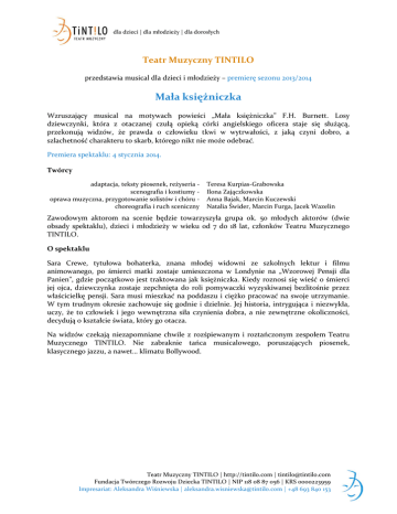 dla dzieci | dla młodzieży | dla dorosłych Teatr Muzyczny TINTILO przedstawia musical dla dzieci i młodzieży – premierę sezonu 2013/2014 Mała księżniczka Wzruszający musical na motywach powieści „Mała księżniczka” F.H. Burnett. Losy dziewczynki, która z otaczanej czułą opieką córki angielskiego oficera staje się służącą, przekonują widzów, że prawda o człowieku tkwi w wytrwałości, z jaką czyni dobro, a szlachetność charakteru to skarb, którego nikt nie może odebrać. Premiera spektaklu: 4 stycznia 2014. Twórcy adaptacja, teksty piosenek, reżyseria scenografia i kostiumy oprawa muzyczna, przygotowanie solistów i chóru choreografia i ruch sceniczny Teresa Kurpias-Grabowska Ilona Zajączkowska Anna Bajak, Marcin Kuczewski Natalia Świder, Marcin Furga, Jacek Wazelin Zawodowym aktorom na scenie będzie towarzyszyła grupa ok. 50 młodych aktorów (dwie obsady spektaklu), dzieci i młodzieży w wieku od 7 do 18 lat, członków Teatru Muzycznego TINTILO. O spektaklu Sara Crewe, tytułowa bohaterka, znana młodej widowni ze szkolnych lektur i filmu animowanego, po śmierci matki zostaje umieszczona w Londynie na „Wzorowej Pensji dla Panien", gdzie początkowo jest traktowana jak księżniczka. Kiedy roznosi się wieść o śmierci jej ojca, dziewczynka zostaje zepchnięta do roli pomywaczki wyzyskiwanej bezlitośnie przez właścicielkę pensji. Sara musi mieszkać na poddaszu i ciężko pracować na swoje utrzymanie. W tym trudnym okresie zachowuje się godnie i dzielnie. Jej historia, intrygująca i niezwykła, uczy, że to człowiek i jego wewnętrzna siła czynienia dobra, a nie zewnętrzne okoliczności, decydują o kształcie świata, który go otacza. Na widzów czekają niezapomniane chwile z rozśpiewanym i roztańczonym zespołem Teatru Muzycznego TINTILO. Nie zabraknie tańca musicalowego, poruszających piosenek, klasycznego jazzu, a nawet… klimatu Bollywood. Teatr Muzyczny TINTILO | http://tintilo.com | [email protected] Fundacja Twórczego Rozwoju Dziecka TINTILO | NIP 118 08 87 056 | KRS 0000223959 Impresariat: Aleksandra Wiśniewska | [email protected] | +48 693 840 153