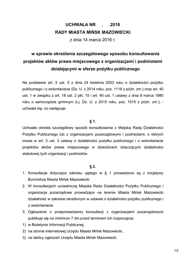 UCHWAŁA NR . .2016 RADY MIASTA MIŃSK MAZOWIECKI z dnia 14 marca 2016 r. w sprawie określenia szczegółowego sposobu konsultowania projektów aktów prawa miejscowego z organizacjami i podmiotami działającymi w sferze pożytku publicznego Na podstawie art. 5 ust. 5 z dnia 24 kwietnia 2003 roku o działalności pożytku publicznego i o wolontariacie (Dz. U. z 2014 roku, poz. 1118 z późn. zm.) oraz art. 40 ust. 1 w związku z art. 18 ust. 2 pkt. 15 i art. 40 ust. 1 ustawy z dnia 8 marca 1990 roku o samorządzie gminnym (t.j. Dz. U. z 2015 roku, poz. 1515 z późn. zm.); uchwala się, co następuje: § 1. Uchwała określa szczegółowy sposób konsultowania z Miejską Radą Działalności Pożytku Publicznego lub z organizacjami pozarządowymi i podmiotami, o których mowa w art. 3 ust. 3 ustawy o działalności pożytku publicznego i o wolontariacie projektów aktów prawa miejscowego w dziedzinach dotyczących działalności statutowej tych organizacji i podmiotów. § 2. 1. Konsultacje dotyczące zakresu ujętego w § 1 prowadzone są z inicjatywy Burmistrza Miasta Mińsk Mazowiecki. 2. W konsultacjach uczestniczą Miejska Rada Działalności Pożytku Publicznego i organizacje pozarządowe prowadzące na terenie Miasta Mińsk Mazowiecki działalność w zakresie określonym w ustawie o działalności pożytku publicznego i o wolontariacie. 3. Ogłoszenie o przeprowadzeniu konsultacji z organizacjami pozarządowymi publikuje się na minimum 7 dni przed terminem ich rozpoczęcia: 1) w Biuletynie Informacji Publicznej, 2) na stronie internetowej Urzędu Miasta Mińsk Mazowiecki, 3) na tablicy ogłoszeń Urzędu Miasta Mińsk Mazowiecki, 1/3 4. Ogłoszenie o przeprowadzeniu konsultacji może być także zamieszczone w prasie lokalnej. 5. Ogłoszenie o przeprowadzeniu konsultacji określa: 1) cel konsultacji, 2) przedmiot konsultacji wraz z projektem aktu prawa miejscowego, 3) czas rozpoczęcia i zakończenia konsultacji, 4) formę konsultacji. 6. Ponadto ogłoszenie może także zawierać: 1) formularz konsultacyjny projektu aktu prawa miejscowego lub informację o miejscu, z którego można pobrać formularz, 2) adres, na który należy dostarczyć wypełniony formularz. 7. Konsultacje prowadzone są w formach: 1) protokołowanego otwartego spotkania z przedstawicielami organizacji pozarządowych oraz innych podmiotów, o których mowa w §1., z możliwością zgłaszania opinii, 2) zgłaszanie przez przedstawicieli organizacji opinii na piśmie, 3) zgłaszania przez przedstawicieli organizacji opinii drogą elektroniczną. 8. O wyborze formy konsultacji decyduje Burmistrz Miasta Mińsk Mazowiecki. 9. Termin wyrażenia opinii w sprawie konsultowanych projektów aktów prawa miejscowego nie może być krótszy niż 14 dni od dnia zamieszczenia ogłoszenia o konsultacjach. Opinia może zawierać propozycje zmian projektowanych zapisów uchwał, wnioski w zakresie nowych rozwiązań prawnych. § 3. 1. Wnioski i propozycje wyrażone w opiniach mogą być uwzględniane, jeżeli nie naruszają obowiązującego porządku prawnego, proponują rozwiązania możliwe do wykonania ze strony gminy oraz budżet gminy jest w stanie je sfinansować. 2. Wyniki konsultacji zawierające zestawienie zgłoszonych opinii zamieszczane są: 1) w Biuletynie Informacji Publicznej, 2) na stronie internetowej Urzędu Miasta Mińsk Mazowiecki, 3) na tablicy ogłoszeń Urzędu Miasta Mińsk Mazowiecki, nie później niż w ciągu 30 dni od zakończenia konsultacji. 3. Wyniki konsultacji Burmistrz Miasta Mińsk Mazowiecki przedstawia Radzie Miasta w uzasadnieniu do projektów aktów, o których mowa w § 1. 2/3 § 4. 1. W przypadku powołania Miejskiej Rady Działalności Pożytku Publicznego konsultacje, o których mowa w niniejszej uchwale odbywają się w ten sposób, że Burmistrz Miasta kieruje do tej Rady projekty aktów prawa miejscowego, dotyczące sfery zadań publicznych, o których mowa w art. 4 ust. 1 o działalności pożytku publicznego i o wolontariacie - w celu wyrażenia przez nią opinii w ciągu 14 dni od ich doręczenia. 2. Nieprzedstawienie opinii w w/w terminie oznacza rezygnację z prawa do jej wyrażenia. § 5. Wyniki konsultacji mają charakter opiniodawczy i nie są wiążące dla organów Miasta. § 6. Konsultacje uznaje się za ważne bez względu na liczbę podmiotów biorących w nich udział, jeżeli zostały przeprowadzone w sposób określony w uchwale. § 7. Traci moc Uchwała Nr Uchwała Nr XLII/402/10 Rady Miasta Mińsk Mazowiecki z dnia 20 września 2010 r. w sprawie określenia szczegółowego sposobu konsultowania z Miejską Radą Działalności Pożytku Publicznego lub z organizacjami pozarządowymi i podmiotami, o których mowa w art. 3 ust. 3 ustawy o działalności pożytku publicznego i o wolontariacie projektów aktów prawa miejscowego w dziedzinach dotyczących działalności statutowej tych organizacji. § 8. Wykonanie uchwały powierza się Burmistrzowi Miasta Mińsk Mazowiecki. § 9. Uchwała wchodzi w życie po upływie 14 dni od dnia ogłoszenia w Dzienniku Urzędowym Województwa Mazowieckiego. 3/3