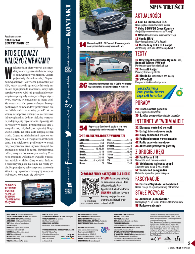 KONTAKT Redaktor naczelny 4 Audi A7 i Mercedes CLS Nowe, piękne i luksusowe auta marzeń 7 Volvo S60/V60 Cross Country Jak jeżdżą uterenowione auta ze Szwecji? 8 News Aktualności ze świata motoryzacji 14 12 Honda HR-V Mercedesy GLE i GLE coupé. Pierwsza jazda następcami luksusowej terenówki ML Nowy kompaktowy SUV z Japonii 14 Mercedesy GLE i GLE coupé Jeździliśmy SUV-ami, które zastąpiły ML-a TESTY 16 Nowy Opel Karl kontra Hyundai i10, Renault Twingo i VW up! Porównanie czterech miejskich aut plus.google.com/+AutoŚwiat Pierwszy test wersji 1.6 dCi 25 Mazda 6 z silnikiem 2.5 pod maską 26 26 VW e-Golf Testujemy elektrycznego VW e-Golfa. Komfortowy samochód, idealny do jazdy w mieście Kompakt z silnikiem elektrycznym PORADY twitter.com/Auto_Swiat Auto Swiat 55_5x16.indd 1 1/15/15 12:37 PM 28 Groźne awarie panewek Lepiej wymienić zawczasu 30 Szybka pomoc Odpowiedzi ekspertów 54 INTERNET W TWOIM AUCIE Reportaż z Goodwood, gdzie w tym roku szczególnie celebrowane były Mazdy TE MARKI ZNAJDZIESZ W NUMERZE CO TYDZIEŃ AUTO ŚWIAT W WERSJI NA TABLET: Z FILMAMI I DODATKOWYMI ZDJĘCIAMI REDAKTOR NACZELNY: Stanis∏aw Sewastianowicz ZASTĘPCA REDAKTORA NACZELNEGO: Ewa Czechowska DYREKTOR ARTYSTYCZNY: Krzysztof Kubicki AKTUALNOŚCI: Piotr Burchard, Błażej Buliński TESTY: Janusz Borkowski, Tomasz Kamiński, Micha∏ Krasnodębski PORADY: Piotr Szypulski, Maciej Brzeziński, Piotr Karczmarczyk, Piotr Wróbel UŹYWANE: Marcin Matus, Andrzej Jedynak SPORT: Andrzej Jakubaszek INTERNET: Robert Rybicki, Lesław Sagan, Radosław Turek FOTO: Andrzej Kondratczyk WIDEO: Michał Mackiewicz, Alan Szerszeń AKTUALNOŚCI 22 Renault Kadjar facebook.com/autoswiat W iększość aut oferowanych do sprzedaży ma w ogłoszeniach informację o bezwypadkowej historii. Często pojawia się sformułowanie „100 proc. bezwypadkowy”. Co więcej, podawany jest VIN, który pozwala sprawdzić historię auta, ale najczęściej do momentu, kiedy było serwisowane w ASO lub przechodziło obowiązkowe przeglądy w stacjach diagnostycznych. Wszyscy wiemy, że jest to jedno wielkie oszustwo. Na rynku wtórnym bezwypadkowych samochodów praktycznie nie ma. Wiele z nich ma za sobą „strzał” tak poważny, że naprawa okazuje się niemożliwa lub nieopłacalna. Jednak niektóre warsztaty podejmują się tego zadania. Spawają kilka wraków w jeden, przeszczepiają VIN-y, wszystko tak, żeby było jak najtaniej. Oczywiście, chętni na takie auto znajdą się bez trudu. Często są nieświadomi tego, co kupują, ale zachęca ich wyjątkowo atrakcyjna cena. Bez większych problemów w stacji diagnostycznej można uzyskać stempel dopuszczający pojazd do ruchu. Zjawisko trwa od lat, wszyscy dobrze o tym wiedzą. Znane są tragiczne w skutkach wypadki z udziałem takich wraków. Giną w nich ludzie, a niektórzy stają się kalekami na resztę życia. Proponujemy, żeby tą sprawą zajęło się któreś z ugrupowań w trwającej kampanii wyborczej. Kto zatem się odważy? www.autoswiat.pl KTO SIĘ ODWAŻY WALCZYĆ Z WRAKAMI? [email protected] STANISŁAW SEWASTIANOWICZ CZ SPIS TREŚCI Alfa Romeo .......................50 Audi...............................4, 50 BMW .............................16, 51 Ford..................... 46, 48, 51 Honda...........................12, 49 Hyundai ........................16, 49 Mazda .........................25, 50 Mercedes ...........4, 14, 49, 50 Nissan ................................ 51 Opel .............................16, 48 Peugeot............................ 50 Porsche ............................... 8 Renault ........................16, 22 Skoda ............................15, 41 Subaru .............................. 42 Toyota ...............................50 VW .............................. 16, 26 Volvo ............................. 7, 49 32 Dlaczego warto być w sieci? 34 Usługi internetowe w aucie 38 Nowy samochód w sieci 40 Podłącz internet w swoim aucie 42 Radio prawie internetowe 44 Akcesoria: praktyczne gadżety Z DRUGIEJ RĘKI 46 Ford Focus I 1.6 Samochód wart zainteresowania 48 Wybieramy najlepsze coupé Sportowe auta już od 5 tys. złotych ZOBACZ FILMY NAKRĘCONE DLA CIEBIE ŚCIĄGNIJ darmową aplikację do skanowania kodów QR ze sklepów Google Play, AppStore lub Windows Phone. URUCHOM aplikację i wyceluj kamerę swojego telefonu w strony, na których znajTu znajdziesz nasz materiał wideo dziesz kod QR. KOREKTA: Michał A. Zieliński WYDAWCA DODATKÓW SPECJALNYCH: Roman Dębecki WSPÓ¸PRACOWNICY: Igor Kohutnicki, Adam Mikuła, Tomasz Okurowski OPRACOWANIE GRAFICZNE: Andrzej Gawęda, Natalia Królikowska, Paweł Polaniecki PREZES ZARZĄDU: Edyta Sadowska PREZES HONOROWY: Wies∏aw Podkański DYREKTOR FINANSOWY: Grzegorz Kania DYREKTOR ZARZĄDZAJĄCY MARKĄ: Paweł Jordan DYREKTOR MARKETINGU: Joanna Kloskowska WYDAWCA: RINGIER AXEL SPRINGER POLSKA SP. Z O.O. Cz∏onek Izby Wydawców Prasy i Związku Kontroli Dystrybucji Prasy www.ringieraxelspringer.pl Adres: 02-672 Warszawa, ul. Domaniewska 52 REKLAMA: Media Impact Polska, e-mail: [email protected] Marek Drzewiecki, tel. 22 232 01 04, Wojciech Mistewicz, tel. 22 232 01 03, Agnieszka Laskowska (traffic), tel. 22 232 01 50 PROMOCJA: Michał Róziecki, tel. 22 232 01 89 HR I KOMUNIKACJA: Roman Szczepanik 52 Samochód po wypadku Co trzeba sprawdzić przed zakupem FASCYNACJE 54 Festiwal Szybkości w Goodwood Nasza relacja ze słynnej wystawy oldtimerów STAŁE POZYCJE 57 Jubileusz „Auto Świata” Motoryzacja 20 lat temu. Konkurs dla Czytelników 58 Radarowe absurdy PR KORPORACYJNY: Anna Marucha KOLPORTAŹ: Rafał Kamiński PRODUKCJA: Mariusz Gajda DRUK: Quad/Graphics Europe Sp. z o.o., Wyszków PRENUMERATA KRAJOWA: Poczta Polska, Ruch SA oraz Kolporter SA na terenie ca∏ego kraju PRENUMERATA ZAGRANICZNA: można zamawiać pod adresem http://www.kiosk.literia.pl SPRZEDAŹ INTERNETOWA WYDAŃ ARCHIWALNYCH, SPECJALNYCH I PRENUMERATA: http://www.kiosk.literia.pl Redakcja nie zwraca materia∏ów ni