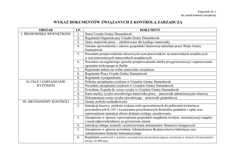 Załącznik Nr 1 do zasad kontroli zarządczej WYKAZ DOKUMENTÓW ZWIĄZANYCH Z KONTROLĄ ZARZĄDCZĄ OBSZAR I. ŚRODOWISKO WEWNĘTRZNE LP. 1. 2. 3. 4. 5. 6. II. CELE I ZARZĄDZANIE RYZYKIEM III. MECHANIZMY KONTROLI 7. 8. 9. 1. 2. 3. 4. 5. 1. 2. 3. 4. 5. 6. DOKUMENT Statut Urzędu Gminy Damasławek Regulamin Organizacyjny Urzędu Gminy Damasławek Opisy stanowisk pracy – zdefiniowane dla każdego stanowiska Imienne upoważnienia z zakresu gospodarki finansowej udzielane przez Wójta Gminy Damasławek Procedura przeprowadzenia okresowych ocen pracowników na stanowiskach urzędniczych w tym kierowniczych stanowiskach urzędniczych Procedura szczegółowego sposobu przeprowadzania służby przygotowawczej i organizowania egzaminu kończącego tę służbę Regulamin naboru na wolne stanowisko urzędnicze Regulamin Pracy Urzędu Gminy Damasławek Regulamin wynagradzania Polityka zarządzania ryzykiem w Urzędzie Gminy Damasławek Procedura zarządzania ryzykiem w Urzędzie Gminy Damasławek Powołanie Zespołu ds. oceny ryzyka w Urzędzie Gminy Damasławek Karta analizy ryzyka zawodowego stanowisko pracy – pracownik administracyjno-biurowy Dokumentacja oceny ryzyka zawodowego – pracownik gospodarczy Zasady polityki rachunkowości Instrukcja kasowa, ustalenie wykazu osób upoważnionych do pobierania kwitariuszy przychodowych K-103 i wystawiania przychodowych dochodów podatków i opłat oraz wprowadzenia instrukcji obrotu drukami ścisłego zarachowania Zarządzenie w sprawie wprowadzenia gospodarki majątkiem trwałym, inwentaryzacji majątku i zasad odpowiedzialności za powierzone mienie Instrukcja obiegu, kontroli i archiwizowania dokumentów finansowo-księgowych Zarządzenie w sprawie powołania Administratora Bezpieczeństwa Informacji oraz Administratora Systemu Informatycznego Regulamin zamówień o wartości szacunkowej nie przekraczającej wyrażonej w złotych równowartości kwoty 14 000 euro 7. 8. 9. 10. 11. 12. 13. IV. INFORMACJA I KOMUNIKACJA V. MONITOROWANIE I OCENA 14. 15. 1. 1. Regulamin Gospodarowania Środkami Zakładowego Funduszu Świadczeń Socjalnych w Urzędzie Gminy Damasławek Uchwała w sprawie określenia zasad gospodarowania nieruchomościami Gminy Damasławek Zarządzenie w sprawie wprowadzenia do użytku służbowego polityki bezpieczeństwa o instrukcji zarządzania systemem informatycznym służącym do przetwarzania danych osobowych w Urzędzie Gminy Damasławek. Instrukcja bezpieczeństwa pożarowego dla Urzędu Gminy w Damasławku Instrukcje BHP Instrukcje dot. powstania pożaru Zarządzenie w sprawie wyznaczenia pracownika do udzielania pierwszej pomocy i wykonywania działań w zakresie zwalczania pożarów i ewakuacji pracowników Zarządzenie w sprawie jednolitego wykazu akt dla Urzędu Gminy Damasławek Instrukcja archiwum zakładowego w Urzędzie Gminy Damasławek Rejestr korespondencji Bieżąca kontrola funkcjonalna określona w zarządzeniu w sprawie wprowadzenia regulaminu kontroli wewnętrznej Wójt Gminy Damasławek mgr inż. Andrzej Szewczykowski 2