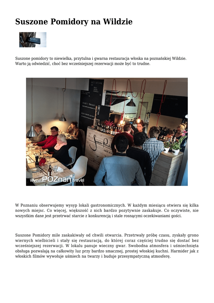 Suszone Pomidory na Wildzie Suszone pomidory to niewielka, przytulna i gwarna restauracja włoska na poznańskiej Wildzie. Warto ją odwiedzić, choć bez wcześniejszej rezerwacji może być to trudne. W Poznaniu obserwujemy wysyp lokali gastronomicznych. W każdym miesiącu otwiera się kilka nowych miejsc. Co więcej, większość z nich bardzo pozytywnie zaskakuje. Co oczywiste, nie wszystkim dane jest przetrwać starcie z konkurencją i stale rosnącymi oczekiwaniami gości. Suszone Pomidory mile zaskakiwały od chwili otwarcia. Przetrwały próbę czasu, zyskały grono wiernych wielbicieli i stały się restauracją, do której coraz częściej trudno się dostać bez wcześniejszej rezerwacji. W lokalu panuje wieczny gwar. Swobodna atmosfera i uśmiechnięta obsługa pozwalają na całkowity luz przy bardzo smacznej, prostej włoskiej kuchni. Harmider jak z włoskich filmów wywołuje uśmiech na twarzy i buduje przesympatyczną atmosferę. W karcie znajdziemy bruschetty, zupy, pizze i makarony. Wśród deserów poza klasyczną panna cottą i tiramisu pojawiają się także domowe ciasta. Dania wyglądają świeżo, kolorowo i doskonale smakują. Miło zjeść pachnące owoce morza, zamówić kieliszek przyzwoitego białego wina czy ulec marcepanowo-makowemu sernikowi. Wizyta w Suszonych Pomidorach to prawdziwa przyjemność, która większość z Was powinna podsumować planem kolejnej wizyty. Odkrywając poznańską Wildę, nie zapomnijcie o tym gastronomicznym skrawku Italii. Smacznego! Suszone Pomidory Św. Czesława 13, 61-575 Poznań www.suszonepomidory.com | tel. +48 530 838 100 Zobacz także poprzednie wpisy publikowane w dziale: AKTUALNOŚCI GASTRONOMICZNE