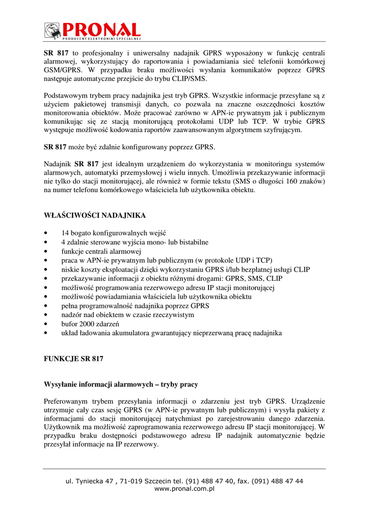 SR 817 to profesjonalny i uniwersalny nadajnik GPRS wyposażony w funkcję centrali alarmowej, wykorzystujący do raportowania i powiadamiania sieć telefonii komórkowej GSM/GPRS. W przypadku braku możliwości wysłania komunikatów poprzez GPRS następuje automatyczne przejście do trybu CLIP/SMS. Podstawowym trybem pracy nadajnika jest tryb GPRS. Wszystkie informacje przesyłane są z użyciem pakietowej transmisji danych, co pozwala na znaczne oszczędności kosztów monitorowania obiektów. Może pracować zarówno w APN-ie prywatnym jak i publicznym komunikując się ze stacją monitorującą protokołami UDP lub TCP. W trybie GPRS występuje możliwość kodowania raportów zaawansowanym algorytmem szyfrującym. SR 817 może być zdalnie konfigurowany poprzez GPRS. Nadajnik SR 817 jest idealnym urządzeniem do wykorzystania w monitoringu systemów alarmowych, automatyki przemysłowej i wielu innych. Umożliwia przekazywanie informacji nie tylko do stacji monitorującej, ale również w formie tekstu (SMS o długości 160 znaków) na numer telefonu komórkowego właściciela lub użytkownika obiektu. WŁAŚCIWOŚCI NADAJNIKA • • • • • • • • • • • • 14 bogato konfigurowalnych wejść 4 zdalnie sterowane wyjścia mono- lub bistabilne funkcje centrali alarmowej praca w APN-ie prywatnym lub publicznym (w protokole UDP i TCP) niskie koszty eksploatacji dzięki wykorzystaniu GPRS i/lub bezpłatnej usługi CLIP przekazywanie informacji z obiektu różnymi drogami: GPRS, SMS, CLIP możliwość programowania rezerwowego adresu IP stacji monitorującej możliwość powiadamiania właściciela lub użytkownika obiektu pełna programowalność nadajnika poprzez GPRS nadzór nad obiektem w czasie rzeczywistym bufor 2000 zdarzeń układ ładowania akumulatora gwarantujący nieprzerwaną pracę nadajnika FUNKCJE SR 817 Wysyłanie informacji alarmowych – tryby pracy Preferowanym trybem przesyłania informacji o zdarzeniu jest tryb GPRS. Urządzenie utrzymuje cały czas sesję GPRS (w APN-ie prywatnym lub publicznym) i wysyła pakiety z informacjami do stacji monitorującej natychmiast po zarejestrowaniu danego zdarzenia. Użytkownik ma możliwość zaprogramowania rezerwowego adresu IP stacji monitorującej. W przypadku braku dostępności podstawowego adresu IP nadajnik automatycznie będzie przesyłał informacje na IP rezerwowy. ul. Tyniecka 47 , 71-019 Szczecin tel. (91) 488 47 40, fax. (091) 488 47 44 www.pronal.com.pl W trybie GSM istnieje możliwość wykorzystania bezpłatnej usługi CLIP do wysyłania informacji alarmowych, co pozwala na znaczne oszczędności kosztów monitorowania obiektów. Centrala alarmowa Istnieje możliwość zaprogramowania nadajnika jako centralę alarmową. Uzbrojenie/rozbrojenie centrali następuje poprzez odpowiednie naruszenie jednego z wejść. W trybie centrali alarmowej użytkownik może zdefiniować linię wejściową jako: - nieaktywną, 24 godzinną, śledzącą, natychmiastową, opóźnioną, uzbr/rozb impulsem, 24 godzinną cichą W trybie centrali alarmowej użytkownik może zdefiniować wyjścia jako: - nieaktywne, czas na wej/wyj, stan uzbrojenia, alarm, alarm+uzbr., sterowanie SMS, sterowanie CLIP, sterowanie SMS+CLIP. Wejścia Nadajnik posiada 14 wejść, które mogą być indywidualnie konfigurowane wg: trybu komunikacji do odbiornika (GPRS< SMS< CLIP lub wyłączone) typu linii (NO lub NC) czasu pobudzenia linii (w przedziale od 0,1 do 10,0 sekund) ilości wyzwoleń blokujących linię (od 1 do 255), kasowanych automatycznie od 1 do 24 godzin licznika zdarzeń na wejściu – realizacja wprowadzonej liczby pobudzeń wejścia (od 1 do 9999) powoduje wysłanie informacji o tym zdarzeniu Wejścia mają wspólną: konfigurację czasu blokowania linii na kolejne pobudzenia po jej wyzwoleniu (od 0 do 9 minut) blokadę ilości wysłanych SMSów w przedziale 1 godziny. Wyjścia W trybie nadajnika do wykorzystania są 4 monostabilne lub bistabilne wyjścia typu OC o obciążalności 150 mA. Użytkownik ma możliwość zdalnego sterowania wyjściami (za pomocą SMS-ów lub CLIPów) posługując się kodem dostępu. Programowanie Wszystkie parametry nadajnika mogą być zaprogramowane przez złącze RS-232 z użyciem programu komputerowego CENTAUR 2010. Poprzez GPRS użytkownik ma możliwość dokonania pełnej konfiguracji nadajnika, identycznie jak w przypadku złącza RS-232. ul. Tyniecka 47 , 71-019 Szczecin tel. (91) 488 47 40, fax. (091) 488 47 44 www.pronal.com.pl Stany nadajnika Podczas połączenia nadajnika z programem Centaur 2010 użytkownik otrzymuje informacje o aktualnym stanie nadajnika: - poziom sygnału GSM - IP przydzielone karcie SIM (dotyczy trybu GPRS) - IMEI modułu telefonu komórkowego - stany wejść – każda cyfra to jedno wejście licząc od lewej od 1-go do 14-ego wejścia („0” – oznacza linię w stanie normalnym, „1” – oznacza linię w stanie pobudzonym) - stany wyjść – każda cyfra to jedno wyjście licząc od lewej od 1-go do 4-ego wyjścia („0” – oznacza wyjście nieaktywne, „1” – oznacza wyjście aktywne) - stan uzbrojenia - „0” oznacza stan nieuzbrojony, „1” – oznacza stan uzbrojony - poziom napięcia zasilania awaryjnego (akumulatora) z dokładnością do 0,5V - informacja, czy dane połączenie jest lokalne czy zdalne. Informacje o stanie SR 817 są aktualizowane co 5 sek. Automatyczny restart nadajnika SR 817 jest wyposażony w funkcję autodiagnostyki. W nadajniku zostało zdiagnozowanych kilkadziesiąt krytycznych punktów funkcjonowania urządzenia. Oprogramowanie samodzielnie ocenia czy wszystkie parametry są dotrzymywane. Jeżeli autodiagnostyka zarejestruje nieprawidłowe parametry pracy jakiejkolwiek funkcji nadajnika i oceni je jako zagrożenie dla prawidłowego działania całego urządzenia realizuje automatyczny, samoistny restart nadajnika. W czasie restartu ma miejsce ponowna instalacja pierwotnych, zaprogramowanych przez użytkownika ust
