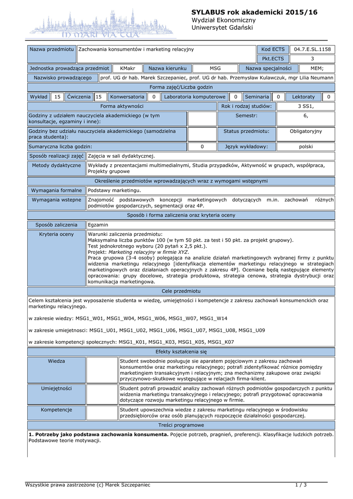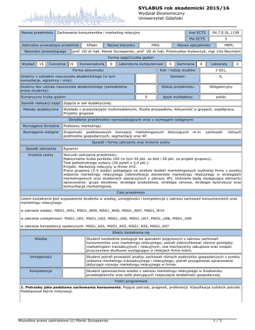 SYLABUS rok akademicki 2015/16 Wydział Ekonomiczny Uniwersytet Gdański Nazwa przedmiotu Zachowania konsumentów i marketing relacyjny Jednostka prowadząca przedmiot Nazwisko prowadzącego KMakr Nazwa kierunku MSG Kod ECTS 04.7.E.SL.1158 Pkt.ECTS 3 Nazwa specjalności MEM; prof. UG dr hab. Marek Szczepaniec, prof. UG dr hab. Przemysław Kulawczuk, mgr Lilia Neumann Forma zajęć/Liczba godzin Wykład 15 Ćwiczenia 15 Konwersatoria 0 Laboratoria komputerowe Forma aktywności 0 Sumaryczna liczba godzin: 0 0 Lektoraty 0 Rok i rodzaj studiów: 3 SS1, Semestr: 6, Status przedmiotu: Obligatoryjny Język wykładowy: polski Godziny z udziałem nauczyciela akademickiego (w tym konsultacje, egzaminy i inne): Godziny bez udziału nauczyciela akademickiego (samodzielna praca studenta): Seminaria Sposób realizacji zajęć Zajęcia w sali dydaktycznej. Metody dydaktyczne Wykłady z prezentacjami multimedialnymi, Studia przypadków, Aktywność w grupach, współpraca, Projekty grupowe Określenie przedmiotów wprowadzających wraz z wymogami wstępnymi Wymagania formalne Podstawy marketingu. Wymagania wstepne Znajomość podstawowych koncepcji marketingowych podmiotów gospodarczych, segmentacji oraz 4P. dotyczących m.in. zachowań różnych Sposób i forma zaliczenia oraz kryteria oceny Sposób zaliczenia Kryteria oceny Egzamin Warunki zaliczenia przedmiotu: Maksymalna liczba punktów 100 (w tym 50 pkt. za test i 50 pkt. za projekt grupowy). Test jednokrotnego wyboru (20 pytań x 2,5 pkt.). Projekt: Marketing relacyjny w firmie XYZ. Praca grupowa (3-4 osoby) polegająca na analizie działań marketingowych wybranej firmy z punktu widzenia marketingu relacyjnego [identyfikacja elementów marketingu relacyjnego w strategiach marketingowych oraz działaniach operacyjnych z zakresu 4P]. Oceniane będą następujące elementy opracowania: grupy docelowe, strategia produktowa, strategia cenowa, strategia dystrybucji oraz komunikacja marketingowa. Cele przedmiotu Celem kształcenia jest wyposażenie studenta w wiedzę, umiejętności i kompetencje z zakresu zachowań konsumenckich oraz marketingu relacyjnego. w zakresie wiedzy: MSG1_W01, MSG1_W04, MSG1_W06, MSG1_W07, MSG1_W14 w zakresie umiejetnosci: MSG1_U01, MSG1_U02, MSG1_U06, MSG1_U07, MSG1_U08, MSG1_U09 w zakresie kompetencji społecznych: MSG1_K01, MSG1_K03, MSG1_K05, MSG1_K07 Efekty kształcenia się Wiedza Student swobodnie posługuje sie aparatem pojęciowym z zakresu zachowań konsumentów oraz marketingu relacyjnego; potrafi zidentyfikować różnice pomiędzy marketingiem transakcyjnym i relacyjnym; zna mechanizmy zakupowe oraz związki przyczynowo-skutkowe występujące w relacjach firma-klient. Umiejętności Student potrafi prowadzić analizy zachowań różnych podmiotów gospodarczych z punktu widzenia marketingu transakcyjnego i relacyjnego; potrafi przygotować opracowania dotyczące rozwoju marketingu relacyjnego w firmie. Kompetencje Student upowszechnia wiedze z zakresu marketingu relacyjnego w środowisku przedsiębiorców oraz osób planujących rozpoczęcie działalności gospodarczej. Treści programowe 1. Potrzeby jako podstawa zachowania konsumenta. Pojęcie potrzeb, pragnień, preferencji. Klasyfikacje ludzkich potrzeb. Podstawowe teorie motywacji. Wszystkie prawa zastrzeżone (c) Marek Szczepaniec 1/3 SYLABUS rok akademicki 2015/16 Wydział Ekonomiczny Uniwersytet Gdański 2. Pojęcie i rodzaje zachowań konsumenta. Istota i znaczenia zachowań konsumentów. Teoria zachowań konsumpcyjnych. Zachowania konsumentów jako rodzaj ludzkich zachowań. Etapy zachowań konsumenta. Czynniki kształtujące zachowania konsumenta. Znaczenie badań nad zachowaniami konsumentów w praktyce marketingowej oraz w praktyce życia społeczno-gospodarczego. Metody badań zachowań konsumentów. 3. Decyzje podejmowane przez konsumenta indywidualnego. Pojęcie decyzji konsumenta. Determinanty decyzji i zachowań konsumenta (ekonomiczne i pozaekonomiczne). Etapy procesu decyzyjnego konsumenta. Klasyfikacje decyzji. Prezentacja podstawowych modeli zachowań konsumentów na rynku. 4. Rola informacji w procesach decyzyjnych konsumentów. Pojęcie informacji. Źródła informacji. Zapotrzebowanie na informacje. Oddziaływanie informacji prywatnej i jej znaczenie w procesach decyzyjnych konsumentów. Kanały osobiste a kanały nieosobiste w procesie komunikowania się przedsiębiorstw z rynkiem. 5. Zachowania finansowe jako rodzaj zachowań konsumenta. Oszczędzanie. Pożyczanie. Ubezpieczanie. Inwestowanie. 6. Typologia konsumentów. Istota i kryteria, procedura typologii. Znaczenie poznawcze i praktyczne Wykorzystanie typologii w praktycznej działalności przedsiębiorstw. Przykłady typologii. Postawy e-konsumentów. typologii. 7. Zachowanie poszczególnych grup społecznych oraz nabywców różnych produktów (usług). Zachowania dzieci i młodzieży, osób starszych. Korzystanie z usług medycznych, usług edukacyjnych oraz ze środków transportu. 8. Marketing transakcyjny a marketing relacyjny. Kapitał relacyjny. Relationship management - zarys koncepcji. Customer lifetime value. Rola pracowników w budowie oraz utrzymaniu relacji. Marketing transakcyjny a marketing relacyjny analiza porównawcza. Rola relationship managers. 9. Podstawy informacyjne kształtowania relacji z klientami. MIS firmy a wymogi informacyjne marketingu relacyjnego. Segmentacja klientów. Analiza wartości relacji. Model optymalnej użyteczności usług. QSL Index: jakość - satysfakcja lojalność. Pomiar stopnia lojalności na przykładzie wskaźnika NetPromoter Score. 10. Modele obsługi klientów indywidualnych. Specyfika potrzeb oraz zachowań finansowych klientów indywidualnych. Cykl życia klienta. Segmentacja klientów indywidualnych. Modele obsługi klientów indywidualnych. 11. Modele obsługi klientów biznesowych. Specyfika potrzeb oraz zachowań finansowych małych i średnich przedsiębiorstw (MSP) oraz klientów korporacyjnych. Segmentacja klientów bi