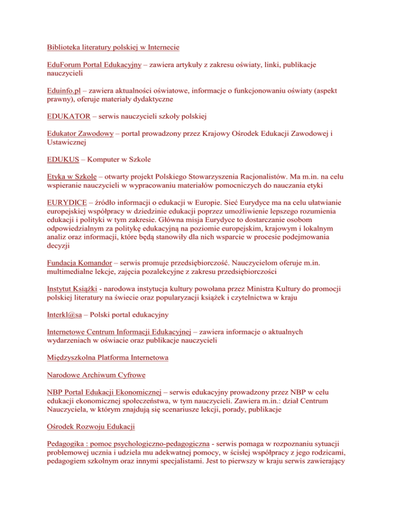 Biblioteka literatury polskiej w Internecie EduForum Portal Edukacyjny – zawiera artykuły z zakresu oświaty, linki, publikacje nauczycieli Eduinfo.pl – zawiera aktualności oświatowe, informacje o funkcjonowaniu oświaty (aspekt prawny), oferuje materiały dydaktyczne EDUKATOR – serwis nauczycieli szkoły polskiej Edukator Zawodowy – portal prowadzony przez Krajowy Ośrodek Edukacji Zawodowej i Ustawicznej EDUKUS – Komputer w Szkole Etyka w Szkole – otwarty projekt Polskiego Stowarzyszenia Racjonalistów. Ma m.in. na celu wspieranie nauczycieli w wypracowaniu materiałów pomocniczych do nauczania etyki EURYDICE – źródło informacji o edukacji w Europie. Sieć Eurydyce ma na celu ułatwianie europejskiej współpracy w dziedzinie edukacji poprzez umożliwienie lepszego rozumienia edukacji i polityki w tym zakresie. Główna misja Eurydyce to dostarczanie osobom odpowiedzialnym za politykę edukacyjną na poziomie europejskim, krajowym i lokalnym analiz oraz informacji, które będą stanowiły dla nich wsparcie w procesie podejmowania decyzji Fundacja Komandor – serwis promuje przedsiębiorczość. Nauczycielom oferuje m.in. multimedialne lekcje, zajęcia pozalekcyjne z zakresu przedsiębiorczości Instytut Książki - narodowa instytucja kultury powołana przez Ministra Kultury do promocji polskiej literatury na świecie oraz popularyzacji książek i czytelnictwa w kraju Interkl@sa – Polski portal edukacyjny Internetowe Centrum Informacji Edukacyjnej – zawiera informacje o aktualnych wydarzeniach w oświacie oraz publikacje nauczycieli Międzyszkolna Platforma Internetowa Narodowe Archiwum Cyfrowe NBP Portal Edukacji Ekonomicznej – serwis edukacyjny prowadzony przez NBP w celu edukacji ekonomicznej społeczeństwa, w tym nauczycieli. Zawiera m.in.: dział Centrum Nauczyciela, w którym znajdują się scenariusze lekcji, porady, publikacje Ośrodek Rozwoju Edukacji Pedagogika : pomoc psychologiczno-pedagogiczna - serwis pomaga w rozpoznaniu sytuacji problemowej ucznia i udziela mu adekwatnej pomocy, w ścisłej współpracy z jego rodzicami, pedagogiem szkolnym oraz innymi specjalistami. Jest to pierwszy w kraju serwis zawierający gotową do wykorzystania dokumentację dla dyrektorów szkół, koordynatorów oraz członków zespołów zaangażowanych w pomoc uczniom Portal Edux.pl – publikacje edukacyjne nauczycieli wszystkich szczebli kształcenia Profesor.pl – publikacje nauczycieli, awans zawodowy, scenariusze, wypracowania Przedszkolak.pl – portal dla rodziców i nauczycieli dzieci w wieku przedszkolnym n temat wychowania i rozwoju dzieci Wolne lektury – szkolna biblioteka internetowa WSIP (portal) – serwis prowadzony przez WSiP, zawiera materiały dla nauczycieli promujące różnorodną ofertę edukacyjną wydawnictwa