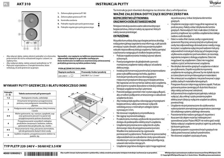 AKT 310 PL INSTRUKCJA PŁYTY Ta instrukcja jest również dostępna na stronie: docs.whirlpool.eu 1. Żeliwna płyta grzewcza Ř 180 2. Żeliwna płyta grzewcza Ř 145 3. Kontrolka zasilania 4. Pokrętło regulacyjne pola grzewczego 5. Pokrętło regulacyjne pola grzewczego WAŻNE ZALECENIA DOTYCZĄCE BEZPIECZEŃSTWA BEZPIECZEŃSTWO UŻYTKOWNIKA ORAZ INNYCH OSÓB JEST BARDZO WAŻNE • Niniejsza instrukcja zawiera ważne zalecenia dotyczące bezpieczeństwa, z którymi należy się zapoznać i których należy zawsze przestrzegać. OSTRZEŻENIE: • • • Aby włączyć płytę, należy obrócić pokrętło(-a) w kierunku przeciwnym do ruchu wskazówek zegara i ustawić na żądaną moc. Aby wyłączyć płytę, należy ustawić pokrętło(a) na "0". Płyta jest wyposażona w 2 lampki kontrolne, które wskazują, że pola grzewcze są gorące. Sprawdzić, czy napięcie na tabliczce znamionowej odpowiada napięciu w gniazdku zasilającym. Dane techniczne na tabliczce znamionowej umieszczonej pod płytą grzewczą są także podane tutaj: PODŁĄCZENIE DO ZASILANIA Napięcie zasilania Przewody: liczba i przekrój 220-240 V ~ + H05 RR-F 3 x 1.5 mm2 WYMIARY PŁYTY GRZEWCZEJ I BLATU ROBOCZEGO (MM) Pokrętło (1 - 6) 1‑2 2 3 3‑4 4 4‑5 6 Tabela zastosowań pól grzewczych Roztapianie (masła, czekolady) Utrzymanie temperatury przygotowanej potrawy oraz podgrzanie niewielkiej ilości płynów Podgrzewanie większych potraw, bitej śmietany i sosów Wolne gotowanie, np.: warzyw, spaghetti, zup oraz gotowanie pieczeni na parze lub przygotowywanie potraw duszonych Przygotowywanie wszystkich rodzajów produktów smażonych, kotletów, steków, gotowanie bez przykrywki, np.: risotto Przyrumienianie mięs, pieczenie ziemniaków, ryb lub gotowanie dużych ilości wody Szybkie smażenie, przygotowywanie steków na patelni, itp. TYP PLETP 220-240 V ~ 50/60 HZ 3.5 KW 400010900921 Wszystkie komunikaty dotyczące bezpieczeństwa określają rodzaj potencjalnego zagrożenia oraz informują, w jaki sposób zmniejszyć ryzyko obrażeń, szkód oraz porażenia prądem wskutek nieprawidłowej obsługi urządzenia. Należy pamiętać o zachowaniu następujących środków bezpieczeństwa: • Podczas rozpakowywania i instalacji używać rękawic ochronnych. • Przed przystąpieniem do jakiejkolwiek czynności montażowej urządzenie należy odłączyć od zasilania elektrycznego. • Instalacja lub konserwacja powinna być przeprowadzana przez wykwalifikowanego technika, zgodnie z instrukcjami producenta oraz obowiązującymi miejscowymi przepisami dotyczącymi bezpieczeństwa. Nie naprawiać ani nie wymieniać żadnej części urządzenia, jeśli nie jest to wyraźnie dozwolone w instrukcji obsługi. • Niniejsze urządzenie musi być uziemione. • Przewód zasilający powinien mieć wystarczającą długość, aby umożliwić podłączenie umieszczonego w zabudowie urządzenia do sieci. • Aby instalacja była zgodna z obowiązującymi przepisami bezpieczeństwa, należy zamontować wyłącznik wielobiegunowy o minimalnym odstępie styków wynoszącym 3 mm. • Nie stosować rozgałęziaczy ani przedłużaczy. • Nie ciągnąć za przewód zasilający. • Po zakończeniu montażu użytkownik nie powinien mieć dostępu do podzespołów elektrycznych urządzenia. • Urządzenie jest przeznaczone wyłącznie do użytku domowego i służy do przygotowywania żywności. Wszelkie inne zastosowania (np. ogrzewanie pomieszczeń) są zabronione. Producent nie ponosi żadnej odpowiedzialności za uszkodzenia i straty spowodowane niewłaściwym użyciem lub nieprawidłową konfiguracją ustawień elementów sterujących. • Urządzenie i jego łatwo dostępne części mogą nagrzewać Aby w pełni cieszyć się korzystaniem z piekarnika, należy uważnie przeczytać niniejsze instrukcje i zachować je na przyszłość. • • • • • • • • • się podczas pracy. Unikać dotykania elementów grzejnych. Urządzenie oraz jego części mogą silnie nagrzewać się podczas pracy. Należy unikać dotykania elementów grzejnych. Niemowlęta (0-3 lat) i małe dzieci (3-8 lat) nie powinny znajdować się w pobliżu urządzenia bez stałego nadzoru osób dorosłych. Dzieci w wieku 8 lat i starsze, osoby o ograniczonej sprawności fizycznej, sensorycznej lub umysłowej oraz osoby bez odpowiedniego doświadczenia i wiedzy mogą korzystać z urządzenia wyłącznie pod nadzorem lub przy odpowiednich instrukcjach dotyczących bezpiecznego użytkowania urządzenia i pod warunkiem, że rozumieją zagrożenia związane z obsługą urządzenia. Dzieci nie mogą bawić się urządzeniem. Dzieci nie mogą bez nadzoru czyścić ani konserwować urządzenia. Nie dotykać elementów grzejnych urządzenia w trakcie i po użytkowaniu. Dopóki wszystkie komponenty urządzenia nie wystygną, pilnować by nie stykało się ono ze ściereczkami ani innymi łatwopalnymi materiałami. Nie umieszczać na urządzeniu i nie przechowywać w jego pobliżu żadnych materiałów łatwopalnych. Przegrzane tłuszcze i oleje mogą się łatwo zapalić. Podczas gotowania potraw zawierających duże ilości tłuszczu i oleju należy zachowywać ostrożność. Jeśli powierzchnia urządzenia jest pęknięta, należy je wyłączyć, aby uniknąć ryzyka porażenia prądem elektrycznym (dotyczy wyłącznie urządzeń ze szklaną powierzchnią). Urządzenie nie jest przeznaczone do użytkowania z wykorzystaniem zewnętrznego programatora czasowego lub odrębnego systemu zdalnego sterowania. Pozostawianie bez nadzoru gotujących się potraw z tłuszczem lub olejem może być niebezpieczne i spowodować pożar. Pożaru NIGDY nie wolno gasić wodą! Należy wyłączyć urządzenie i przykryć ogień np. pokrywką lub kocem gaśniczym. Zagrożenie pożarem: na powierzchniach grzejnych nie należy przechowywać żadnych przedmiotów. Nie stosować urządzeń czyszczących parą. Whirlpool jest zastrzeżonym znakiem towarowym firmy Whirlpool, US