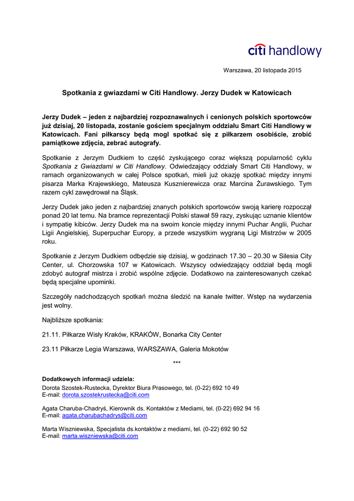Warszawa, 20 listopada 2015 Spotkania z gwiazdami w Citi Handlowy. Jerzy Dudek w Katowicach Jerzy Dudek – jeden z najbardziej rozpoznawalnych i cenionych polskich sportowców już dzisiaj, 20 listopada, zostanie gościem specjalnym oddziału Smart Citi Handlowy w Katowicach. Fani piłkarscy będą mogl spotkać się z piłkarzem osobiście, zrobić pamiątkowe zdjęcia, zebrać autografy. Spotkanie z Jerzym Dudkiem to część zyskującego coraz większą popularność cyklu Spotkania z Gwiazdami w Citi Handlowy. Odwiedzający oddziały Smart Citi Handlowy, w ramach organizowanych w całej Polsce spotkań, mieli już okazję spotkać między innymi pisarza Marka Krajewskiego, Mateusza Kusznierewicza oraz Marcina Żurawskiego. Tym razem cykl zawędrował na Śląsk. Jerzy Dudek jako jeden z najbardziej znanych polskich sportowców swoją karierę rozpoczął ponad 20 lat temu. Na bramce reprezentacji Polski stawał 59 razy, zyskując uznanie klientów i sympatię kibiców. Jerzy Dudek ma na swoim koncie między innymi Puchar Anglii, Puchar Ligii Angielskiej, Superpuchar Europy, a przede wszystkim wygraną Ligi Mistrzów w 2005 roku. Spotkanie z Jerzym Dudkiem odbędzie się dzisiaj, w godzinach 17.30 – 20.30 w Silesia City Center, ul. Chorzowska 107 w Katowicach. Wszyscy odwiedzający oddział będą mogli zdobyć autograf mistrza i zrobić wspólne zdjęcie. Dodatkowo na zainteresowanych czekać będą specjalne upominki. Szczegóły nadchodzących spotkań można śledzić na kanale twitter. Wstęp na wydarzenia jest wolny. Najbliższe spotkania: 21.11. Piłkarze Wisły Kraków, KRAKÓW, Bonarka City Center 23.11 Piłkarze Legia Warszawa, WARSZAWA, Galeria Mokotów *** Dodatkowych informacji udziela: Dorota Szostek-Rustecka, Dyrektor Biura Prasowego, tel. (0-22) 692 10 49 E-mail: [email protected] Agata Charuba-Chadryś, Kierownik ds. Kontaktów z Mediami, tel. (0-22) 692 94 16 E-mail: [email protected] Marta Wiszniewska, Specjalista ds.kontaktów z mediami, tel. (0-22) 692 90 52 E-mail: [email protected] Bank Handlowy w Warszawie SA to jedna z największych instytucji finansowych w Polsce, oferująca pod marką Citi Handlowy bogaty i nowoczesny asortyment produktów i usług bankowości korporacyjnej, inwestycyjnej i detalicznej. Bank Handlowy obsługuje 6,8 tys. klientów korporacyjnych i ok. 709 tys. klientów indywidualnych poprzez nowoczesne kanały dystrybucji oraz sieć 46 oddziałów. W skład grupy kapitałowej Banku wchodzą takie podmioty jak: Dom Maklerski Banku Handlowego i Handlowy Leasing. Przynależność do Citigroup, największej na świecie instytucji finansowej, zapewnia klientom Banku Handlowego dostęp do usług finansowych w ponad 140 krajach. Citi (NYSE:C) to wiodąca globalna instytucja finansowa, mająca około 200 milionów klientów w ponad 140 krajach. Poprzez swoje dwie odrębne jednostki operacyjne: Citicorp i Citi Holdings, Citi obsługuje klientów indywidualnych, korporacyjnych, rządowych i instytucjonalnych zapewniając im bogaty wachlarz produktów i usług finansowych w zakresie bankowości detalicznej, bankowości korporacyjnej i inwestycyjnej, usług maklerskich i zarządzania aktywami. Dodatkowe informacje można uzyskać na stronie internetowej www.citigroup.com lub www.citi.com.
