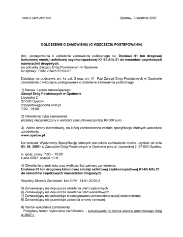 TDiM.V.3421/ZP/07/07 Opatów, 3 kwietnia 2007 OGŁOSZENIE O ZAMÓWIENIU (O WSZCZĘCIU POSTĘPOWANIA) dot.: postępowania o udzielenie zamówienia publicznego na: Dostawa 61 ton drogowej kationowej emulsji asfaltowej szybkorozpadowej K1-65 Alfa 21 do remontów cząstkowych nawierzchni drogowych. na potrzeby Zarządu Dróg Powiatowych w Opatowie Nr sprawy: TDiM.V.3421/ZP/07/07 . Działając na podstawie art. 4a ust. 2 oraz art. 41 Pzp Zarząd Dróg Powiatowych w Opatowie zawiadamia o wszczęciu postępowania o udzielenie zamówienia publicznego. 1) Nazwa i adres zamawiającego: Zarząd Dróg Powiatowych w Opatowie Lipowska 2 27-500 Opatów [email protected] 7:00 - 15:00 2) Określenie trybu zamówienia: przetarg nieograniczony o wartości szacunkowej poniżej 60 000 euro 3) Adres strony internetowej, na której zamieszczona została specyfikacja istotnych warunków zamówienia: www.opatow.pl Na wniosek Wykonawcy Specyfikację istotnych warunków zamówienia można uzyskać od dnia 03. 04. 2007r w Zarządzie Dróg Powiatowych w Opatowie przy ul. Lipowskiej 2, 27-500 Opatów, w godz. pracy: 7:00 - 15:00 Cena SIWZ wynosi 10 zł.. 4) Określenie przedmiotu oraz wielkości lub zakresu zamówienia. Dostawa 61 ton drogowej kationowej emulsji asfaltowej szybkorozpadowej K1-65 Alfa 21 do remontów cząstkowych nawierzchni drogowych. Wspólny Słownik Zamówień: kod CPV 14.51.20.00-3 5) Zamawiający nie dopuszcza składania ofert częściowych. 6) Zamawiający nie dopuszcza składania ofert wariantowych. 7) Zamawiający nie przewiduje w postępowaniu prowadzenie aukcji elektronicznej. 8) Zamawiający nie przewiduje zawarcia umowy ramowej. 9) Termin wykonania zamówienia: Pożądany termin wykonania zamówienia - sukcesywnie do końca sezonu remontowego dróg w 2007 r. 10) Opis warunków udziału w postępowaniu: Warunkiem udziału w postępowaniu o udzielenie przedmiotowego zamówienia jest spełnienie warunków art. 22 ust. 1 ustawy Prawo zamówień publicznych z dnia 29 stycznia 2004 r Dz. U. Nr 19 poz. 177, tj. : 1. posiadanie uprawnień do wykonywania określonej działalności lub czynności, jeżeli ustawy nakładają obowiązek posiadania takich uprawnień 2. posiadanie niezbędnej wiedzy i doświadczenia oraz dysponowanie potencjałem technicznym i osobami zdolnymi do wykonania zamówienia, 3. znajdowanie się w sytuacji ekonomicznej i finansowej zapewniającej wykonanie zamówienia, 4. nie podleganie wykluczeniu z postępowania o udzielenie zamówienia na podstawie art. 24 11) Informacja na temat wadium: oferent nie wnosi wadium 12) Kryteria oceny ofert i ich znaczenie: Cena – 100% 13) Miejsce i termin składania ofert: w siedzibie zamawiającego Zarząd Dróg Powiatowych w Opatowie, Lipowska 2, 27-500 Opatów, w sekretariacie do dnia 12. 04. 2007 r do godz. 10:00 14) Miejsce i termin otwarcia ofert: Zarząd Dróg Powiatowych w Opatowie, Lipowska 2, 27-500 Opatów, w świetlicy 12. 04. 2007 r o godz. 10:15 13) termin związania ofertą Wykonawca pozostaje związany ofertą przez okres 30 dni, Zarząd Dróg Powiatowych w Opatowie _________________________________ Nazwa zamawiającego dnia