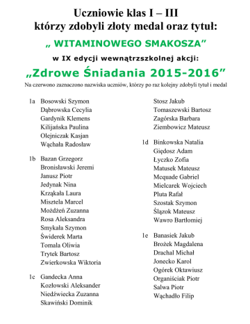 Uczniowie klas I – III którzy zdobyli złoty medal oraz tytuł: „ WITAMINOWEGO SMAKOSZA” w IX edycji wewnątrzszkolnej akcji: „Zdrowe Śniadania 2015-2016” Na czerwono zaznaczono nazwiska uczniów, którzy po raz kolejny zdobyli tytuł i medal 1a Bosowski Szymon Dąbrowska Cecylia Gardynik Klemens Kilijańska Paulina Olejniczak Kasjan Wąchała Radosław 1b Bazan Grzegorz Bronisławski Jeremi Janusz Piotr Jedynak Nina Krząkała Laura Misztela Marcel Możdżeń Zuzanna Rosa Aleksandra Smykała Szymon Świderek Marta Tomala Oliwia Trytek Bartosz Zwierkowska Wiktoria 1c Gandecka Anna Kozłowski Aleksander Niedźwiecka Zuzanna Skawiński Dominik Stosz Jakub Tomaszewski Bartosz Zagórska Barbara Ziembowicz Mateusz 1d Binkowska Natalia Giędosz Adam Łyczko Zofia Matusek Mateusz Mcquade Gabriel Mielcarek Wojciech Pluta Rafał Szostak Szymon Ślązok Mateusz Wawro Bartłomiej 1e Banasiek Jakub Brożek Magdalena Drachal Michał Jonecko Karol Ogórek Oktawiusz Organiściak Piotr Salwa Piotr Wąchadło Filip 2a Brożyńska Milena Choroszyński Cyprian Froelich Julia (2 raz) Heyda Dawid Kaczkowski Piotr Kapczyński Sergiusz Kułach Jakub Malicka Paulina Śladkowski Bartosz Walaszek Jakub 2b Borecka Hanna Bychowiec Nina (2 raz) Gardynik Amelia (2 raz) Golka Małgorzata Jaworska Alicja (2 raz) Konieczny Barbara Kowalczyk Julia Mietła Wojciech (2 raz) Owca Dominik Szymański Sylwester (2 raz) Tomaszek Maciej (2 raz) Wawro Filip 2c Augustynowicz Maja Ciesek Igor Cygan Denis Kincel Marta (2 raz) Niechwiejczyk Julia (2 raz) Olszok Tamara Rosołowska Agata (2 raz) Rossmann Karolina Stępniewski Tymoteusz (2 raz) Wigłasz Emilia (2 raz) 2d Czarnowski Mateusz Gierlotka Oskar Grabara Jakub (2 raz) Jedynak Maja (2 raz) Markiton Martyna (2 raz) Meisel Wojciech Pudołek Julia Schewior Hanna Smykała Julia Soczomski Mikołaj Stępień Karol (2 raz) Zaporowska Zofia (2 raz) Żółtak Patrycja 3a Burzawa Wiktor Gadomski Dawid (3 raz) Gałęziowski Wiktor Hibszer Jakub (2 raz) Karut Kacper (3 raz) Kozak Oliwia (3 raz) Kroczek Anna (2 raz) Kurasz Dominik (3 raz) Lis Wojciech (3 raz) Mielcarek Jan (2 raz) Moska Marta (2 raz) Obracaj Jakub (3 raz) Pająk Katarzyna (3 raz) Tokarska Weronika (2 raz) Walkiewicz Karolina Wąchadło Julia 3b Chećko Michał (2 raz) Holona Bartosz (2 raz) Jędrzejczak Natasza (2 raz) Możdżeń Paulina Nalepa Wiktor (2 raz) Stosz Zofia (2 raz) Szczotka Marta (3 raz) Vojtek Jakub (2 raz) Zientek Liwia (2 raz) 3c Aksiuto Karolina (3 raz) Bartoszewska Ewa Lorenc Emilia (3 raz) Mioduszewski Jan Odwaga Piotr Polakowska Jolanta (2 raz) Prachnio Wiktor Przybyła Julia (3 raz) Saratowicz Maksymilian (2 raz) Skutela Krzysztof (3 raz) Spyra Oliwia Stępień Szymon Topór Aleksandra Tur Weronika (2 raz) Ząbkowski Filip (2 raz) Żak Maciej (2 raz) opracowała Ilona Pająk