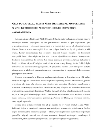 GŁOS DO ARTYKUŁU MARTY WIDY-BEHIESSE PT. MUZUŁMANIE W UNII EUROPEJSKIEJ. WIĘZY ETNICZNE I KULTUROWE A GLOBALIZACJA Lektura artykułu Pani Marty Widy-Behiesse była dla mnie wielką przyjemnością oraz w znacznym stopniu przyczyniła się do powiększenia wiedzy o tym zagadnieniu. Jak wspomina autorka — obecność muzułmanów w Europie jest prawie tak długa jak historia islamu. Pierwsze znane nam zapiski dotyczące pobytu Arabów na Sycylii pochodzą z VII wieku. Kupcy muzułmańscy lub żołnierze docierali bardzo wcześnie na kontynent europejski. Islam jako religia nie jest wiec nowym zjawiskiem na Starym Kontynencie. Ludności muzułmańska do połowy XX wieku mieszkała głownie na terenie Bałkanów i Rosji, zaś jako mniejszość religijna zamieszkująca inne tereny Europy (m.in. Polska), była traktowana na zasadzie lokalnego zjawiska. W przypadku Polski i Litwy mniejszość ta była zintegrowana z lokalnymi społeczeństwami, a reprezentujące ją organizacje były uznawane przez prawo tych krajów. Sytuacja muzułmanów w Europie uległa zmianie dopiero w drugiej połowie XX wieku, kiedy do Europy na szersza skalę zaczęli napływać wyznawcy proroka Muhammada, przede wszystkim jako tania siła robocza, lecz również jako uchodźcy (chociażby muzułmanie z Czeczenii czy Palestyny) czy studenci. Bardzo ważną rolę odegrała też przeszłość kolonialna wielu państw europejskich (Francji czy Wielkiej Brytanii). Według oficjalnych statystyk szacuje się, że w Europie Zachodniej żyje około 15 milionów muzułmanów, choć możliwe, że liczba ta jest zaniżona, ponieważ niektóre państwa, jak Grecja czy Dania, nie prowadzą statystyk dotyczących wyznania. Można mieć jednak pewność (tak jak podkreśliła to w swoim artykule Marta Widy– Behiesse), że jest to mniejszość znacząca, a co ważniejsze, wewnętrznie zróżnicowana. Bardzo często pomimo jednej wyznawanej religii — islamu, wspólnej historii i często także wspólnych powodów migracji stanowi ona ciekawą mieszankę kategorii etnicznych, narodowych i kulturowych, która bynajmniej nie jest wolna od wpływów i procesów globalizacji. 103 Kultura — Historia — Globalizacja Nr 6 PAULINA PARCEWICZ