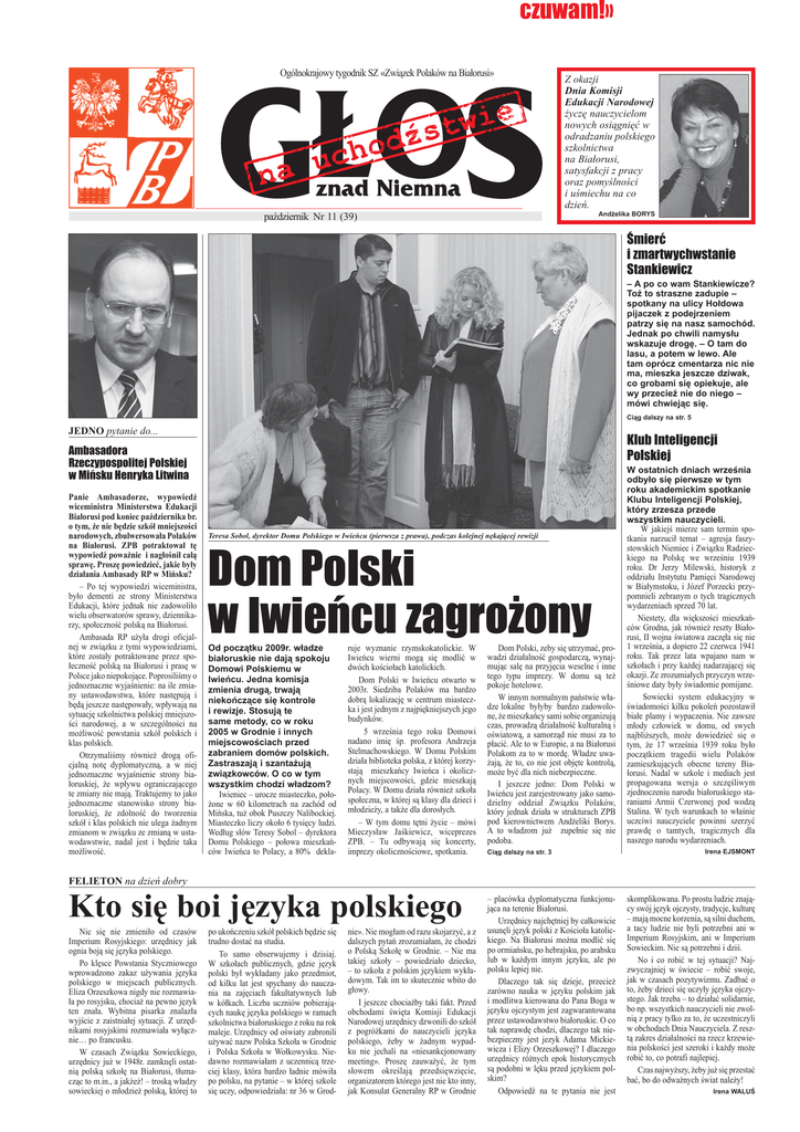 czuwam!» Ogólnokrajowy tygodnik SZ «Związek Polaków na Białorusi» Z okazji Dnia Komisji Edukacji Narodowej życzę nauczycielom nowych osiągnięć w odradzaniu polskiego szkolnictwa na Białorusi, satysfakcji z pracy oraz pomyślności i uśmiechu na co dzień. Andżelika BORYS październik Nr 11 (39) Śmierć i zmartwychwstanie Stankiewicz – A po co wam Stankiewicze? Toż to straszne zadupie – spotkany na ulicy Hołdowa pijaczek z podejrzeniem patrzy się na nasz samochód. Jednak po chwili namysłu wskazuje drogę. – O tam do lasu, a potem w lewo. Ale tam oprócz cmentarza nic nie ma, mieszka jeszcze dziwak, co grobami się opiekuje, ale wy przecież nie do niego – mówi chwiejąc się. Ciąg dalszy na str. 5 JEDNO pytanie do... Klub Inteligencji Polskiej Ambasadora Rzeczypospolitej Polskiej w Mińsku Henryka Litwina Panie Ambasadorze, wypowiedź wiceministra Ministerstwa Edukacji Białorusi pod koniec października br. o tym, że nie będzie szkół mniejszości narodowych, zbulwersowała Polaków na Białorusi. ZPB potraktował tę wypowiedź poważnie i nagłośnił całą sprawę. Proszę powiedzieć, jakie były działania Ambasady RP w Mińsku? – Po tej wypowiedzi wiceministra, było dementi ze strony Ministerstwa Edukacji, które jednak nie zadowoliło wielu obserwatorów sprawy, dziennikarzy, społeczność polską na Białorusi. Ambasada RP użyła drogi oficjalnej w związku z tymi wypowiedziami, które zostały potraktowane przez społeczność polską na Białorusi i prasę w Polsce jako niepokojące. Poprosiliśmy o jednoznaczne wyjaśnienie: na ile zmiany ustawodawstwa, które następują i będą jeszcze następowały, wpływają na sytuację szkolnictwa polskiej mniejszości narodowej, a w szczególności na możliwość powstania szkół polskich i klas polskich. Otrzymaliśmy również drogą oficjalną notę dyplomatyczną, a w niej jednoznaczne wyjaśnienie strony białoruskiej, że wpływu ograniczającego te zmiany nie mają. Traktujemy to jako jednoznaczne stanowisko strony bialoruskiej, że zdolność do tworzenia szkół i klas polskich nie ulega żadnym zmianom w związku ze zmianą w ustawodawstwie, nadal jest i będzie taka możliwość. Teresa Sobol, dyrektor Domu Polskiego w Iwieńcu (pierwsza z prawa), podczas kolejnej nękającej rewizji Dom Polski w Iwieńcu zagrożony Od początku 2009r. władze białoruskie nie dają spokoju Domowi Polskiemu w Iwieńcu. Jedna komisja zmienia drugą, trwają niekończące się kontrole i rewizje. Stosują te same metody, co w roku 2005 w Grodnie i innych miejscowościach przed zabraniem domów polskich. Zastraszają i szantażują związkowców. O co w tym wszystkim chodzi władzom? Iwieniec – urocze miasteczko, położone w 60 kilometrach na zachód od Mińska, tuż obok Puszczy Nalibockiej. Miasteczko liczy około 6 tysięcy ludzi. Według słów Teresy Sobol – dyrektora Domu Polskiego – połowa mieszkańców Iwieńca to Polacy, a 80% dekla- ruje wyznanie rzymskokatolickie. W Iwieńcu wierni mogą się modlić w dwóch kościołach katolickich. Dom Polski w Iwieńcu otwarto w 2003r. Siedziba Polaków ma bardzo dobrą lokalizację w centrum miasteczka i jest jednym z najpiękniejszych jego budynków. 5 września tego roku Domowi nadano imię śp. profesora Andrzeja Stelmachowskiego. W Domu Polskim działa biblioteka polska, z której korzystają mieszkańcy Iwieńca i okolicznych miejscowości, gdzie mieszkają Polacy. W Domu działa również szkoła społeczna, w której są klasy dla dzieci i młodzieży, a także dla dorosłych. – W tym domu tętni życie – mówi Mieczysław Jaśkiewicz, wiceprezes ZPB. – Tu odbywają się koncerty, imprezy okolicznościowe, spotkania. Dom Polski, zeby się utrzymać, prowadzi działalność gospodarczą, wynajmując salę na przyjęcia weselne i inne tego typu imprezy. W domu są też pokoje hotelowe. W innym normalnym państwie władze lokalne byłyby bardzo zadowolone, że mieszkańcy sami sobie organizują czas, prowadzą działalność kulturalną i oświatową, a samorząd nie musi za to płacić. Ale to w Europie, a na Białorusi Polakom za to w mordę. Władze uważają, że to, co nie jest objęte kontrolą, może być dla nich niebezpieczne. I jeszcze jedno: Dom Polski w Iwieńcu jest zarejestrowany jako samodzielny oddział Związku Polaków, który jednak działa w strukturach ZPB pod kierownictwem Andżeliki Borys. A to władzom już zupełnie się nie podoba. Ciąg dalszy na str. 3 W ostatnich dniach września odbyło się pierwsze w tym roku akademickim spotkanie Klubu Inteligencji Polskiej, który zrzesza przede wszystkim nauczycieli. W jakiejś mierze sam termin spotkania narzucił temat – agresja faszystowskich Niemiec i Związku Radzieckiego na Polskę we wrześniu 1939 roku. Dr Jerzy Milewski, historyk z oddziału Instytutu Pamięci Narodowej w Białymstoku, i Józef Porzecki przypomnieli zebranym o tych tragicznych wydarzeniach sprzed 70 lat. Niestety, dla większości mieszkańców Grodna, jak również reszty Białorusi, II wojna światowa zaczęła się nie 1 września, a dopiero 22 czerwca 1941 roku. Tak przez lata wpajano nam w szkołach i przy każdej nadarzającej się okazji. Ze zrozumiałych przyczyn wrześniowe daty były świadomie pomijane. Sowiecki system edukacyjny w świadomości kilku pokoleń pozostawił białe plamy i wypaczenia. Nie zawsze młody człowiek w domu, od swych najbliższych, może dowiedzieć się o tym, że 17 września 1939 roku było początkiem tragedii wielu Polaków zamieszkujących obecne tereny Białorusi. Nadal w szkole i mediach jest propagowana wersja o szczęśliwym zjednoczeniu narodu białoruskiego staraniami Armii Czerwonej pod wodzą Stalina. W tych warunkach to właśnie uczciwi nauczyciele powinni szerzyć prawdę o tamtych, tragicznych dla naszego narodu wydarzeniach. Irena EJSMONT FELIETON na dzień dobry Kto się boi języka polskiego Nic się nie zmieniło od czasów Imperium