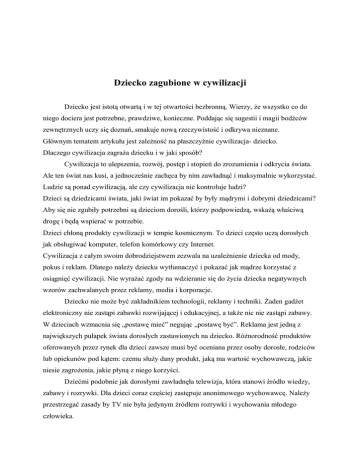 Dziecko zagubione w cywilizacji Dziecko jest istotą otwartą i w tej otwartości bezbronną. Wierzy, że wszystko co do niego dociera jest potrzebne, prawdziwe, konieczne. Poddając się sugestii i magii bodźców zewnętrznych uczy się doznań, smakuje nową rzeczywistość i odkrywa nieznane. Głównym tematem artykułu jest zależność na płaszczyźnie cywilizacja- dziecko. Dlaczego cywilizacja zagraża dziecku i w jaki sposób? Cywilizacja to ulepszenia, rozwój, postęp i stopień do zrozumienia i odkrycia świata. Ale ten świat nas kusi, a jednocześnie zachęca by nim zawładnąć i maksymalnie wykorzystać. Ludzie są ponad cywilizacją, ale czy cywilizacja nie kontroluje ludzi? Dzieci są dziedzicami świata, jaki świat im pokazać by były mądrymi i dobrymi dziedzicami? Aby się nie zgubiły potrzebni są dzieciom dorośli, którzy podpowiedzą, wskażą właściwą drogę i będą wspierać w potrzebie. Dzieci chłoną produkty cywilizacji w tempie kosmicznym. To dzieci często uczą dorosłych jak obsługiwać komputer, telefon komórkowy czy Internet. Cywilizacja z całym swoim dobrodziejstwem zezwala na uzależnienie dziecka od mody, pokus i reklam. Dlatego należy dziecku wytłumaczyć i pokazać jak mądrze korzystać z osiągnięć cywilizacji. Nie wyrażać zgody na wdzieranie się do życia dziecka negatywnych wzorów zachwalanych przez reklamy, media i korporacje. Dziecko nie może być zakładnikiem technologii, reklamy i techniki. Żaden gadżet elektroniczny nie zastąpi zabawki rozwijającej i edukacyjnej, a także nic nie zastąpi zabawy. W dzieciach wzmacnia się „postawę mieć” negując „postawę być”. Reklama jest jedną z największych pułapek świata dorosłych zastawionych na dziecko. Różnorodność produktów oferowanych przez rynek dla dzieci zawsze musi być oceniana przez osoby dorosłe, rodziców lub opiekunów pod kątem: czemu służy dany produkt, jaką ma wartość wychowawczą, jakie niesie zagrożenia, jakie płyną z niego korzyści. Dziećmi podobnie jak dorosłymi zawładnęła telewizja, która stanowi źródło wiedzy, zabawy i rozrywki. Dla dzieci coraz częściej zastępuje anonimowego wychowawcę. Należy przestrzegać zasady by TV nie była jedynym źródłem rozrywki i wychowania młodego człowieka. Następne zagrożenie to Internet, dzięki któremu najmłodsi nazywani są „globalnymi dzieciakami”. Wśród zagrożeń „internetowych” najgroźniejsze to: łatwy dostęp do pornografii, pedofilia, niebezpieczne znajomości i kontakty (sekty), manipulacje dzieckiem poprzez treści marketingowe, oraz gry on line w których dominuje agresja i brutalność. Świetnym i sprawdzonym sposobem zabezpieczenia przed dziećmi nieodpowiednich stron internetowych jest założenie filtru rodzinnego ( www.bezpiecznyinternet.org). Najlepszym sposobem przeciwdziałania zagrożeniom dzieciństwa jest miłość, czas rodziców, ich dialog z dzieckiem. Dziecko jest najważniejsze. Trzeba ze spokojem i zrozumieniem tłumaczy, wyjaśniać, odpowiadać na pytania, rozwiewać niejasności i problemy oraz pomagać. „Dziecko jako zakładnik cywilizacji jest tak naprawdę zakładnikiem świata dorosłych, ich wygórowanych ambicji, planów i marzeń… Ich sukcesów i porażek, ich przekonań, ich wyznań, ich stylu bycia i życia.” Powyższa treść artykułu zarysowała problem dziecka zagubionego w cywilizacji, jeśli chodzi o szczegóły, to już indywidualne rozważania i analiza dla sumienia rodziców, opiekunów i wychowawców. Bibliografia: 1. „Bliżej przedszkola” 2008 2. „Dziecko w świecie mediów i konsumpcji”, M. Bogunia- Borowska, Kraków 2006