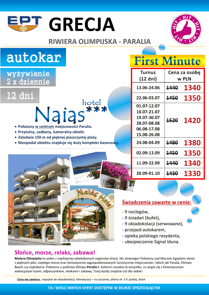 GRECJA RIWIERA OLIMPIJSKA - PARALIA Położony w centrum miejscowości Paralia. Przytulny, zadbany, kameralny obiekt. Zaledwie 150 m od pięknej piaszczystej plaży. Nieopodal obiektu znajduje się duży kompleks basenowy. Świadczenia zawarte w cenie: - 9 noclegów, - 9 śniadań (bufet), - 9 obiadokolacji (serwowane), - przejazd autokarem, - opieka polskiego rezydenta, - ubezpieczenie Signal Iduna. Słońce, morze, relaks, zabawa! Riwiera Olimpijska to jeden z najchętniej odwiedzanych regionów Grecji. Nic dziwnego! Położony nad Morzem Egejskim słynie z pięknych plaż, ciepłego morza oraz fantastycznie zagospodarowanych turystycznie miejscowości, takich jak Paralia, Olimpic Beach czy Leptokaria. Położona u podnóża Olimpu Paralia k. Katerini uosabia to wszystko, co wiąże się z fantastycznym wakacyjnym luzem, odpoczynkiem, relaksem i zabawą. Tutaj każdy znajdzie coś dla siebie! Cena nie zawiera: napojów do obiadokolacji, klimatyzacji – na życzenie, płatna ok. 5 € /pokój, dzień. TA i WIELE INNYCH OFERT DOSTĘPNE W BIURZE SPRZEDAJĄCYM