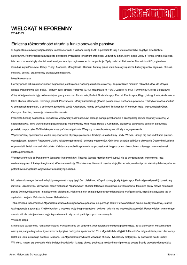 WIELOKĄT NIEFOREMNY 2014-11-27 Etniczna różnorodność utrudnia funkcjonowanie państwa. O Afganistanie mówimy najczęściej w kontekście walki z talibami i misji ISAF, a przecież to kraj o wielu obliczach i bogatym dziedzictwie kulturowym. Różnorodność zawdzięcza położeniu. Przez jego terytorium przebiegał Jedwabny Szlak, który łączył Chiny z Persją, Arabią i Europą. Nie bez znaczenia były również wielkie migracje w tym regionie oraz liczne podboje. Tędy podążali Aleksander Macedoński i Dżyngis-chan. Osiedlali się tu Persowie, Grecy, Turcy, Arabowie, Mongołowie i Hindusi. To tutaj przez wieki ścierały się różne kultury (grecka, rzymska, chińska, indyjska, perska) oraz interesy światowych mocarstw. Mozaika etniczna Liczący ponad 33 mln mieszkańców Afganistan jest krajem o złożonej strukturze etnicznej. To prawdziwa mozaika różnych ludów, do których należą: Pasztunowie (38–50%), Tadżycy, czyli etniczni Persowie (27%), Hazarowie (9–19%), Uzbecy (6–9%), Turkmeni (3%) oraz Beludżowie (2%). W Afganistanie żyją także mniejsze grupy etniczne: Aimakowie, Brahui, Nuristańczycy, Paszai, Pamirczycy, Kirgizi, Mongołowie, Arabowie, a także Hindusi i Sikhowie. Dominują jednak Pasztunowie, którzy zamieszkują głównie południowe i wschodnie prowincje. Tadżyków można spotkać w północnych regionach, a po´łnocno-zachodnia część Afganistanu należy do Uzbeków i Turkmenów. W centrum kraju, w prowincjach Ghor, Oruzgan i Bamian, dominują natomiast Hazarowie. Przez lata historię Afganistanu kształtował wojowniczy lud Pasztunów, dlatego panuje przekonanie o szczególnej pozycji tej grupy etnicznej w społeczeństwie. To w wyniku buntu pasztuńskiego możnowładcy Mira Wajsa Hotaki z Kandaharu przeciwko panowaniu perskich Safawidów powstało na początku XVIII wieku pierwsze państwo afgańskie. Wszyscy monarchowie wywodzili się z tego plemienia. W pasztuńskiej społeczności wielką rolę odgrywają obyczaje plemienne, tradycje, a także klany i rody. W życiu kieruje się ona kodeksem prawnoobyczajowym, zwanym Pasztunwali, który nakazuje gościnność i ochronę wędrowców. Gdy świat oskarżał talibów o ukrywanie Osamy bin Ladena, odpowiadali, że tak stanowi ich kodeks. Każdy obcy może liczyć u nich na poczęstunek i wypoczynek. Jakakolwiek zniewaga natomiast musi zostać pomszczona. W przeciwieństwie do Pasztuno´w (pasterzy i wojowników), Tadżycy (często rzemieślnicy i kupcy) nie są zorganizowani w plemiona, lecz utożsamiają się z lokalnymi regionami, które zamieszkują. W społecznej hierarchii najniżej stoją Hazarowie, uważani przez niektórych historyków za potomków mongolskich wojowników armii Dżyngis-chana. Nic zatem dziwnego, że trudno byłoby narysować mapę języków i dialektów, którymi posługują się Afgańczycy. Dari (afgański perski) i paszto są językami urzędowymi, używanymi przez większość Afgańczyków, chociaż talibowie posługiwali się tylko paszto. Mniejsze grupy mówią natomiast ponad 70 innymi językami i niezliczonymi dialektami. Niektóre z nich znają jedynie grupy mieszkające w Afganistanie, część jest używana też w sąsiednich krajach: Pakistanie, Iranie, Uzbekistanie. Taka etniczna różnorodność Afganistanu utrudnia funkcjonowanie państwa, nie pomaga także w działaniach na arenie międzynarodowej, ułatwia też ingerencję z zewnątrz. Ciężko bowiem o wspólną wizję bezpieczeństwa i politykę, gdy nie ma wspólnej tożsamości. Ponadto islam w mniejszym stopniu niż chrześcijaństwo sprzyja krystalizowaniu się uczuć patriotycznych i narodowych. W stronę Boga Kilkanaście stuleci temu religią dominującą w Afganistanie był buddyzm. Archeologiczne odkrycia potwierdzają, że w pierwszych wiekach przed naszą erą na tym terytorium żyła zamożna i prężna buddyjska społeczność. To z afgańskich buddyjskich klasztorów religia dotarła przez Jedwabny Szlak do Chin, a stamtąd do Korei i Japonii. Do Afganistanu przybywali wówczas chińscy i tybetańscy pielgrzymi, by poznawać nauki Buddy. W I wieku naszej ery powstało wiele świątyń buddyjskich i z tego okresu pochodzą między innymi pierwsze posągi Buddy przedstawionego jako Autor: Małgorzata Schwarzgruber Strona: 1 człowieka, w których widać wpływ sztuki hellenistycznej. Buddyjscy mnisi, którzy żyli w Bamian, pozostawili po sobie nie tylko posągi Buddy, lecz także liczne wykute w skałach jaskinie. W wielu z nich zachowały się malowidła naścienne (okazało się, że już w VI wieku n.e. mnisi używali farb olejnych, a wcześniej sądzono, że wynaleziono je w Europie dopiero w XIII wieku). Kres kulturze buddyjskiej położyli muzułmanie, którzy przybyli do Afganistanu w VII wieku. Islam zakorzeniał się przez kilka wieków, na przykład Kabul przyjął tę religię dopiero w XI wieku. To właśnie islam wydaje się dziś jedynym spoiwem łączącym Afgańczyków. Większość z nich to muzułmanie, chociaż dzielą się też na szyitów i sunnitów. Do sunnickiej szkoły hanafickiej należą Tadżycy, Pasztunowie i Uzbecy. Szyizm jest w mniejszości i wyznają go między innymi Hazarowie, Kyzyłbasze, górscy (pamirscy) Tadżycy, a także niektóre plemiona pasztun´skie. Afgańscy szyici, podobnie jak sunnici, tworzą wiele różnych ugrupowań i nurtów religijnych. Do mniejszości religijnych można zaliczyć również sikhów i hinduistów. Jak pisał analityk z Polskiego Instytutu Spraw Międzynarodowych Konrad Olgierd Zasztowt w jednym z wydawnictw Polskiej Akcji Humanitarnej poświęconych Afganistanowi, ważną cechą afgańskiego islamu jest przywiązanie do norm prawa zwyczajowego – adatu. Wynika ono z lokalnej tradycji, w przeciwieństwie do szariatu, który ma swoje źródło w religii. Nierzadko nawet prawo zwyczajowe bywa tam traktowane jako nadrzędne wobec norm religijnych. Większość Afgańczyków mieszka na wsiach, a ich plemiona, op