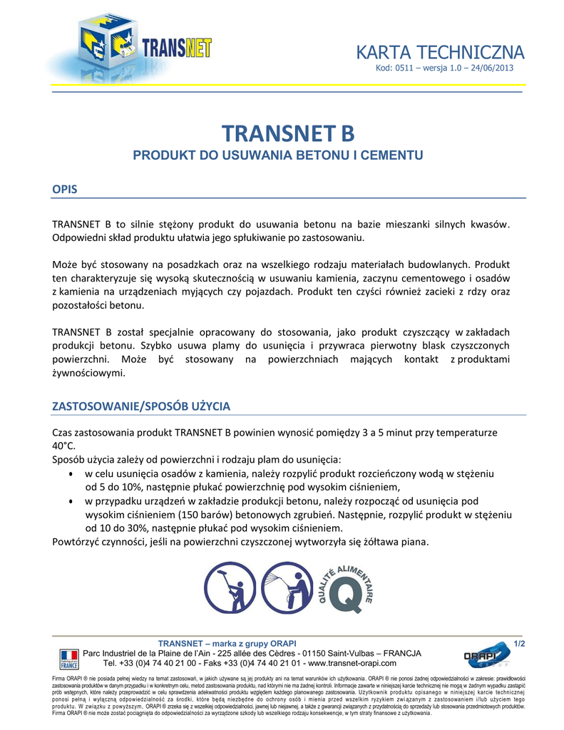 KARTA TECHNICZNA Kod: 0511 – wersja 1.0 – 24/06/2013 TRANSNET B PRODUKT DO USUWANIA BETONU I CEMENTU OPIS TRANSNET B to silnie stężony produkt do usuwania betonu na bazie mieszanki silnych kwasów. Odpowiedni skład produktu ułatwia jego spłukiwanie po zastosowaniu. Może być stosowany na posadzkach oraz na wszelkiego rodzaju materiałach budowlanych. Produkt ten charakteryzuje się wysoką skutecznością w usuwaniu kamienia, zaczynu cementowego i osadów z kamienia na urządzeniach myjących czy pojazdach. Produkt ten czyści również zacieki z rdzy oraz pozostałości betonu. TRANSNET B został specjalnie opracowany do stosowania, jako produkt czyszczący w zakładach produkcji betonu. Szybko usuwa plamy do usunięcia i przywraca pierwotny blask czyszczonych powierzchni. Może być stosowany na powierzchniach mających kontakt z produktami żywnościowymi. ZASTOSOWANIE/SPOSÓB UŻYCIA Czas zastosowania produkt TRANSNET B powinien wynosić pomiędzy 3 a 5 minut przy temperaturze 40°C. Sposób użycia zależy od powierzchni i rodzaju plam do usunięcia: w celu usunięcia osadów z kamienia, należy rozpylić produkt rozcieńczony wodą w stężeniu od 5 do 10%, następnie płukać powierzchnię pod wysokim ciśnieniem, w przypadku urządzeń w zakładzie produkcji betonu, należy rozpocząć od usunięcia pod wysokim ciśnieniem (150 barów) betonowych zgrubień. Następnie, rozpylić produkt w stężeniu od 10 do 30%, następnie płukać pod wysokim ciśnieniem. Powtórzyć czynności, jeśli na powierzchni czyszczonej wytworzyła się żółtawa piana. TRANSNET – marka z grupy ORAPI Parc Industriel de la Plaine de l’Ain - 225 allée des Cèdres - 01150 Saint-Vulbas – FRANCJA Tel. +33 (0)4 74 40 21 00 - Faks +33 (0)4 74 40 21 01 - www.transnet-orapi.com 1/2 Firma ORAPI ® nie posiada pełnej wiedzy na temat zastosowań, w jakich używane są jej produkty ani na temat warunków ich użytkowania. ORAPI ® nie ponosi żadnej odpowiedzialności w zakresie: prawidłowości zastosowania produktów w danym przypadku i w konkretnym celu, metod zastosowania produktu, nad którymi nie ma żadnej kontroli. Informacje zawarte w niniejszej karcie technicznej nie mogą w żadnym wypadku zastąpić prób wstępnych, które należy przeprowadzić w celu sprawdzenia adekwatności produktu względem każdego planowanego zastosowania. Użytkownik produktu opisanego w niniejszej karcie technicznej ponosi pełną i wyłączną odpowiedzialność za środki, które będą niezbędne do ochrony osób i mienia przed wszelkim ryzykiem zwi ązanym z zastosowaniem i/lub użyciem tego produktu. W związku z powyższym, ORAPI ® zrzeka się z wszelkiej odpowiedzialności, jawnej lub niejawnej, a także z gwarancji związanych z przydatnością do sprzedaży lub stosowania przedmiotowych produktów. Firma ORAPI ® nie może zostać pociągnięta do odpowiedzialności za wyrządzone szkody lub wszelkiego rodzaju konsekwencje, w tym straty finansowe z użytkowania . KARTA TECHNICZNA Kod: 0511 – wersja 1.0 – 24/06/2013 PARAMETRY Wygląd: pH produktu nierozcieńczonego: pH w 10 g/l: Masa właściwa w temp. 20°C: Temperatura zamarzania: Kolor: płyn przezroczysty nie dotyczy 1,4 +/- 0,1 1,18 +/- 0,01 g/cm3 -18°C bezbarwny do ochry Środki powierzchniowoczynne używane w recepturze naszych produktów spełniają kryteria biodegradowalności określone w rozporządzeniu WE nr 648/2004 dotyczącym detergentów. OPAKOWANIA 25 kg 260 kg SKŁADOWANIE/PRZECHOWYWANIE Produkt należy przechowywać w zamkniętym oryginalnym opakowaniu w suchym pomieszczeniu. TRANSNET – marka z grupy ORAPI Parc Industriel de la Plaine de l’Ain - 225 allée des Cèdres - 01150 Saint-Vulbas – FRANCJA Tel. +33 (0)4 74 40 21 00 - Faks +33 (0)4 74 40 21 01 - www.transnet-orapi.com 2/2 Firma ORAPI ® nie posiada pełnej wiedzy na temat zastosowań, w jakich używane są jej produkty ani na temat warunków ich użytkowania. ORAPI ® nie ponosi żadnej odpowiedzialności w zakresie: prawidłowości zastosowania produktów w danym przypadku i w konkretnym celu, metod zastosowania produktu, nad którymi nie ma żadnej kontroli. Informacje zawarte w niniejszej karcie technicznej nie mogą w żadnym wypadku zastąpić prób wstępnych, które należy przeprowadzić w celu sprawdzenia adekwatności produktu względem każdego planowanego zastosowania. Użytkownik produktu opisanego w niniejszej karcie technicznej ponosi pełną i wyłączną odpowiedzialność za środki, które będą niezbędne do ochrony osób i mienia przed wszelkim ryzykiem zwi ązanym z zastosowaniem i/lub użyciem tego produktu. W związku z powyższym, ORAPI ® zrzeka się z wszelkiej odpowiedzialności, jawnej lub niejawnej, a także z gwarancji związanych z przydatnością do sprzedaży lub stosowania przedmiotowych produktów. Firma ORAPI ® nie może zostać pociągnięta do odpowiedzialności za wyrządzone szkody lub wszelkiego rodzaju konsekwencje, w tym straty finansowe z użytkowania .