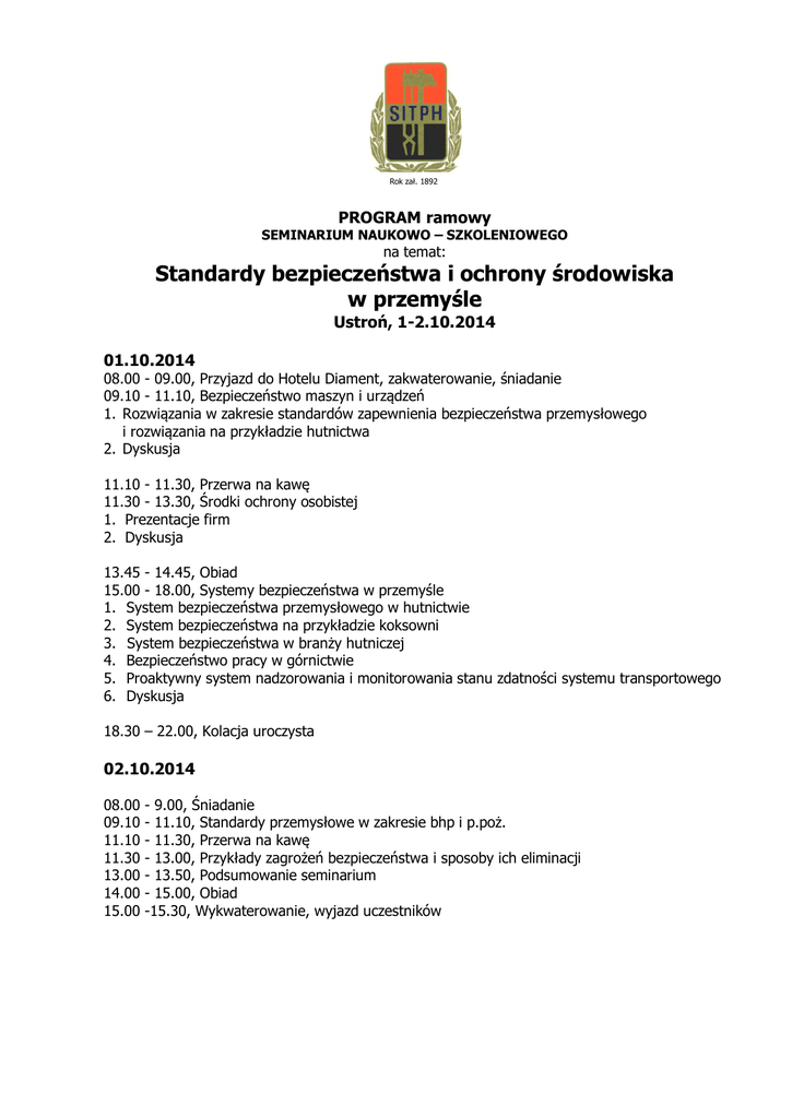 Rok zał. 1892 PROGRAM ramowy SEMINARIUM NAUKOWO – SZKOLENIOWEGO na temat: Standardy bezpieczeństwa i ochrony środowiska w przemyśle Ustroń, 1-2.10.2014 01.10.2014 08.00 - 09.00, Przyjazd do Hotelu Diament, zakwaterowanie, śniadanie 09.10 - 11.10, Bezpieczeństwo maszyn i urządzeń 1. Rozwiązania w zakresie standardów zapewnienia bezpieczeństwa przemysłowego i rozwiązania na przykładzie hutnictwa 2. Dyskusja 11.10 - 11.30, Przerwa na kawę 11.30 - 13.30, Środki ochrony osobistej 1. Prezentacje firm 2. Dyskusja 13.45 - 14.45, Obiad 15.00 - 18.00, Systemy bezpieczeństwa w przemyśle 1. System bezpieczeństwa przemysłowego w hutnictwie 2. System bezpieczeństwa na przykładzie koksowni 3. System bezpieczeństwa w branży hutniczej 4. Bezpieczeństwo pracy w górnictwie 5. Proaktywny system nadzorowania i monitorowania stanu zdatności systemu transportowego 6. Dyskusja 18.30 – 22.00, Kolacja uroczysta 02.10.2014 08.00 09.10 11.10 11.30 13.00 14.00 15.00 - 9.00, Śniadanie - 11.10, Standardy przemysłowe w zakresie bhp i p.poż. - 11.30, Przerwa na kawę - 13.00, Przykłady zagrożeń bezpieczeństwa i sposoby ich eliminacji - 13.50, Podsumowanie seminarium - 15.00, Obiad -15.30, Wykwaterowanie, wyjazd uczestników
