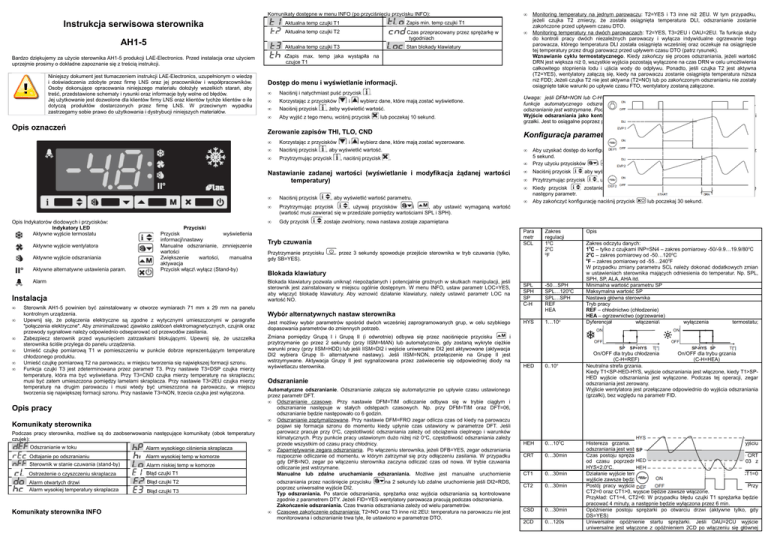 Komunikaty dostępne w menu INFO (po przyciśnięciu przycisku INFO): Instrukcja serwisowa sterownika AH1-5 Opis oznaczeń Zapis min. temp czujki T1 Aktualna temp czujki T2 Czas przepracowany przez sprężarkę w tygodniach Aktualna temp czujki T3 Stan blokady klawiatury • Naciśnij i natychmiast puść przycisk • Korzystając z przycisków • Naciśnij przycisk • Aby wyjść z tego menu, wciśnij przycisk i . wybierz dane, które mają zostać wyświetlone. , żeby wyświetlić wartość. lub poczekaj 10 sekund. Zerowanie zapisów THI, TLO, CND • Korzystając z przycisków • Naciśnij przycisk • Przytrzymując przycisk i Aktywne wyjście wentylatora Aktywne wyjście odszraniania Aktywne alternatywne ustawienia param. Alarm • • • • • • Sterownik AH1-5 powinien być zainstalowany w otworze wymiarach 71 mm x 29 mm na panelu kontrolnym urządzenia. Upewnij się, że połączenia elektryczne są zgodne z wytycznymi umieszczonymi w paragrafie "połączenia elektryczne". Aby zminimalizować zjawisko zakłóceń elektromagnetycznych, czujnik oraz przewody sygnałowe należy odpowiednio odseparować od przewodów zasilania. Zabezpiecz sterownik przed wysunięciem zatrzaskami blokującymi. Upewnij się, że uszczelka sterownika ściśle przylega do panelu urządzenia. Umieść czujkę pomiarową T1 w pomieszczeniu w punkcie dobrze reprezentującym temperaturę chłodzonego produktu. Umieść czujkę pomiarową T2 na parowaczu, w miejscu tworzenia się największej formacji szronu. Funkcja czujki T3 jest zdeterminowana przez parametr T3. Przy nastawie T3=DSP czujka mierzy temperaturę, która ma być wyświetlana. Przy T3=CND czujka mierzy temperaturę na skraplaczu; musi być zatem umieszczona pomiędzy lamelami skraplacza. Przy nastawie T3=2EU czujka mierzy temperaturę na drugim parowaczu i musi wtedy być umieszczona na parowaczu, w miejscu tworzenia się największej formacji szronu. Przy nastawie T3=NON, trzecia czujka jest wyłączona. Opis pracy Komunikaty sterownika Podczas pracy sterownika, możliwe są do zaobserwowania następujące komunikaty (obok temperatury czujek): Odszranianie w toku Alarm wysokiego ciśnienia skraplacza Odtajanie po odszranianiu Sterownik w stanie czuwania (stand-by) Alarm wysokiej temp w komorze Ostrzeżenie o czyszczeniu skraplacza Błąd czujki T1 Alarm otwartych drzwi Alarm wysokiej temperatury skraplacza Błąd czujki T2 Komunikaty sterownika INFO Alarm niskiej temp w komorze Uwaga: jeśli DFM=NON lub C-H=HEA wszystkie funkcje odszraniania są zatrzymane; jeśli DFT=0, funkcje automatycznego odszraniania są wyłączone. Podczas alarmu wysokiego ciśnienia, odszranianie jest wstrzymane. Podczas odszraniania, alarm wysokiej temperatury jest blokowany. Wyjście odszraniania jako kontrola grzałki. Wyjście odszraniania może być używane do kontroli grzałki. Jest to osiągalne poprzez parametry HED oraz HEH. Konfiguracja parametrów • , aby wyświetlić wartość. , naciśnij przycisk . • Naciśnij przycisk • Przytrzymując przycisk , używaj przycisków i , aby ustawić wymaganą wartość (wartość musi zawierać się w przedziale pomiędzy wartościami SPL i SPH). • Gdy przycisk , aby wyświetlić wartość parametru. • Aby uzyskać dostęp do konfiguracji parametrów, przyciśnij i przytrzymaj przyciski 5 sekund. Przy użyciu przycisków i wybierz parametr, który ma być zmodyfikowany. • Naciśnij przycisk • Przytrzymując przycisk • Kiedy przycisk zostanie zwolniony, nowa wartość zostaje zapamiętana i wyświetla się następny parametr. Aby zakończyć konfigurację naciśnij przycisk lub poczekaj 30 sekund. • Tryb czuwania Przytrzymanie przycisku gdy SB=YES). Para metr SCL Zakres regulacji 10C 20C 0 F SPL SPH SP C-H -50…SPH SPL…1200C SPL…SPH REF HEA HYS 1…10o przez 3 sekundy spowoduje przejście sterownika w tryb czuwania (tylko, Blokada klawiatury Wybór alternatywnych nastaw sterownika Jest możliwy wybór parametrów spośród dwóch wcześniej zaprogramowanych grup, w celu szybkiego dopasowania parametrów do zmiennych potrzeb. Zmiana pomiędzy Grupą I i Grupą II (i odwrotnie) odbywa się przez naciśnięcie przycisku i przytrzymanie go przez 2 sekundy (przy IISM=MAN) lub automatycznie, gdy zostaną wykryte ciężkie warunki pracy (przy IISM=HDD) lub jeśli IISM=DI2 i wejście uniwersalne DI2 jest aktywowane (aktywacja DI2 wybiera Grupę II- alternatywne nastawy). Jeśli IISM=NON, przełączenie na Grupę II jest wstrzymywane. Aktywacja Grupy II jest sygnalizowana przez zaświecenie się odpowiedniej diody na wyświetlaczu sterownika. HED 0..10o HEH 0…100C CRT 0…30min CT1 0…30min CT2 0…30min CSD 0…30min 2CD 0…120s Odszranianie Automatyczne odszranianie. Odszranianie załącza się automatycznie po upływie czasu ustawionego przez parametr DFT. • Odszranianie czasowe. Przy nastawie DFM=TIM odliczanie odbywa się w trybie ciągłym i odszranianie następuje w stałych odstępach czasowych. Np. przy DFM=TIM oraz DFT=06, odszranianie będzie następowało co 6 godzin. • Odszranianie zoptymalizowane. Przy nastawie DFM=FRO zegar odlicza czas od kiedy na parowaczu pojawi się formacja szronu do momentu kiedy upłynie czas ustawiony w parametrze DFT. Jeśli parowacz pracuje przy 0oC, częstotliwość odszraniania zależy od obciążenia cieplnego i warunków klimatycznych. Przy punkcie pracy ustawionym dużo niżej niż 0 oC, częstotliwość odszraniania zależy przede wszystkim od czasu pracy chłodnicy. • Zapamiętywanie zegara odszraniania. Po włączeniu sterownika, jeżeli DFB=YES, zegar odszraniania rozpocznie odliczanie od momentu, w którym zatrzymał się przy odłączeniu zasilania. W przypadku gdy DFB=NO, zegar po włączeniu sterownika zaczyna odliczać czas od nowa. W trybie czuwania odliczanie jest wstrzymane. Manualne lub zdalne uruchamianie odszraniania. Możliwe jest manualne uruchomienie Błąd czujki T3 • i przez aby wyświetlić wartość. , użyj przyciskó