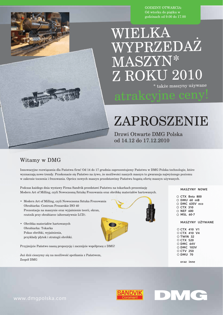 GODZINY OTWARCIA: Od wtorku do piàtku w godzinach od 9.00 do 17.00 WIELKA WYPRZEDA˚ MASZYN* Z ROKU 2010 * tak˝e maszyny u˝ywane atrakcyjne ceny! ZAPROSZENIE Drzwi Otwarte DMG Polska od 14.12 do 17.12.2010 Witamy w DMG Innowacyjne rozwiàzania dla Paƒstwa firm! Od 14 do 17 grudnia zaprezentujemy Paƒstwu w DMG Polska technologie, które wyznaczajà nowe trendy. Przekonacie si´ Paƒstwo na ˝ywo, ˝e mo˝liwoÊci naszych maszyn to gwarancja najwy˝szego poziomu w zakresie toczenia i frezowania. Oprócz nowych maszyn przedstawimy Paƒstwu bogatà ofert´ maszyn u˝ywanych. Podczas ka˝dego dnia wystawy Firma Sandvik przedstawi Paƒstwu na tokarkach prezentacj´ Modern Art of Milling, czyli Nowoczesnà Sztuk´ Frezowania oraz obróbk´ materiałów hartowanych. • Modern Art of Milling, czyli Nowoczesna Sztuka Frezowania Obrabiarka: Centrum Frezarskie ISO 40 Prezentacja na maszynie oraz wyjaÊnienie teorii, ekran, rzutnik przy obrabiarce (alternatywnie LCD). • Obróbka materiałów hartowanych Obrabiarka: Tokarka Pokaz obróbki, wyjaÊnienia, przykłady płytek i strategii obróbki. Przyjmijcie Paƒstwo naszà propozycj´ i zacznijcie wspó∏prac´ z DMG! Ju˝ dziÊ cieszymy si´ na mo˝liwoÊç spotkania z Paƒstwem, Zespół DMG www.dmgpolska.com MASZYNY NOWE CTX Beta 800 DMU 60 mB DMC 635V eco CTX 310 NEF 600 MSL 60-7 MASZYNY U˚YWANE CTX 410 V1 CTX 410 V4 TWIN 32 CTX 520 DMC 64V DMC 103V CTV 250 DMU 70 oraz inne Marszew, Konin, Pyzdry, Grab 42 ra echoty ƒ na i m Ar Maliƒska Osiedle 1000-lecia Wyspi aƒskieg o 42 Kalisz, Łódê ki as Pi oz iP o Pod gór na łku Pi Kazim ie Wie lk rza iego 70 Pu kieg Ogrodow a Sienkiewicza a Lipow Słow ac Dobrzyca, Kowalew 12 Kaliska Wodna 11 Prosimy o odpowiedê! Krótka Fabryczna Al.Mickiewicza Baranówek Sportowa Al. jska Wo Traugut ta Taczanów Planty o kieg Pols Nr faksu +48 62 74 28 290 Kubackiego 43 Wtorek, 14 grudnia 2010 Kajew Wszołów Sporna Gliwice, Katowice, Ostrów Wlkp. osobami: Âroda, 15 grudnia 2010 Czwartek, 16 grudnia 2010 Jestem zainteresowany nast´pujàcymi produktami: Nie wezm´ udziału w Drzwiach Otwartych w Pleszewie: Prosz´ jednak o kontakt z Paƒstwa in˝ynierem sprzeda˝y w temacie: Kontakt w sprawie ustalenia terminu pokazu na temat: Niewià˝àcà ofert´ na temat: Inne informacje na temat: Nr re f. DMG / Nr klie nta Nazwa firmy Nazwisko / Imi´ Ulica Ko d po c zto wy / Mie jsc owoÊç Kraj Nr te le fo nu Nr faksu Adre s e -mail Adre s stro ny inte rne to we j Data / Podpis DMG Polska: ul. Fabryczna 7, PL-63-300 Pleszew, Tel.: +48 62 / 7428 151 Fax: +48 62 / 7428 114, [email protected], www.dmgpolska.com Grodzisko, Rokutów Poznaƒ ska 43 Tak, wezm´ udział w Dniach Otwartych w Pleszewie z Lena o eg łowski Niesio lle Ha ka rtowic a w sk Drzwi Otwarte DMG Polska Od 14 do 17 grudnia 2010 rsze Ma ODPOWIEDè FAKSOWA Poznaƒ, Jarocin Prokopo ws ka Chocz, WrzeÊnia, Konin Piàtek, 17 grudnia 2010