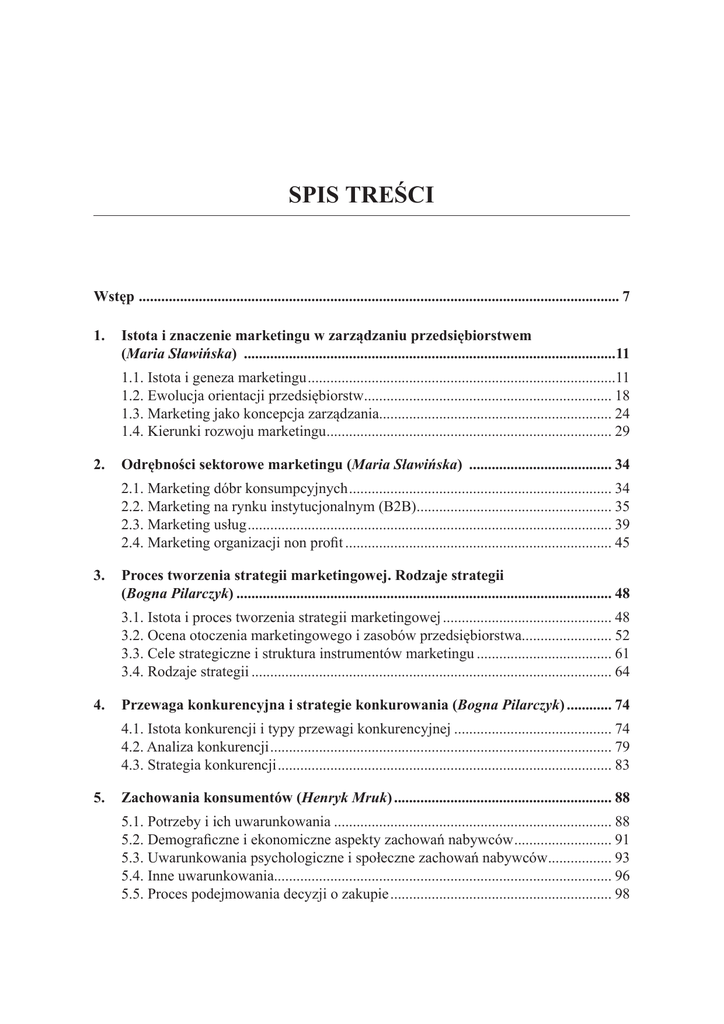 63,675(ĝ&, :VWĊS................................................................................................................................ 7 ,VWRWDL]QDF]HQLHPDUNHWLQJXZ]DU]ąG]DQLXSU]HGVLĊELRUVWZHP (0DULD6áDZLĔVND) ...................................................................................................11 ,VWRWDLJHQH]DPDUNHWLQJX .................................................................................. (ZROXFMDRULHQWDFMLSU]HGVLĊELRUVWZ.................................................................. 0DUNHWLQJMDNRNRQFHSFMD]DU]ąG]DQLD.............................................................. .LHUXQNLUR]ZRMXPDUNHWLQJX............................................................................ 2GUĊEQRĞFLVHNWRURZHPDUNHWLQJX0DULD6áDZLĔVND) ...................................... 34 0DUNHWLQJGyEUNRQVXPSF\MQ\FK ...................................................................... 0DUNHWLQJQDU\QNXLQVW\WXFMRQDOQ\P%%.................................................... 0DUNHWLQJXVáXJ ................................................................................................. 0DUNHWLQJRUJDQL]DFMLQRQSUR¿W ....................................................................... 3. Proces tworzenia strategii marketingowej. Rodzaje strategii (%RJQD3LODUF]\N) .................................................................................................... 48 ,VWRWDLSURFHVWZRU]HQLDVWUDWHJLLPDUNHWLQJRZHM ............................................. 2FHQDRWRF]HQLDPDUNHWLQJRZHJRL]DVREyZSU]HGVLĊELRUVWZD........................ &HOHVWUDWHJLF]QHLVWUXNWXUDLQVWUXPHQWyZPDUNHWLQJX .................................... 5RG]DMHVWUDWHJLL ................................................................................................ 4. Przewaga konkurencyjna i strategie konkurowania (%RJQD3LODUF]\N) ............ 74 ,VWRWDNRQNXUHQFMLLW\S\SU]HZDJLNRQNXUHQF\MQHM .......................................... $QDOL]DNRQNXUHQFML ........................................................................................... 6WUDWHJLDNRQNXUHQFML ......................................................................................... 5. Zachowania konsumentów (+HQU\N0UXN) .......................................................... 88 3RWU]HE\LLFKXZDUXQNRZDQLD .......................................................................... 'HPRJUD¿F]QHLHNRQRPLF]QHDVSHNW\]DFKRZDĔQDE\ZFyZ .......................... 8ZDUXQNRZDQLDSV\FKRORJLF]QHLVSRáHF]QH]DFKRZDĔQDE\ZFyZ................. ,QQHXZDUXQNRZDQLD.......................................................................................... 3URFHVSRGHMPRZDQLDGHF\]MLR]DNXSLH ........................................................... 6SLVWUHĞFL 5RG]DMHGHF\]ML]DNXSRZ\FK .......................................................................... 1DE\ZF\LQVW\WXFMRQDOQL ................................................................................. 6. Segmentacja – istota, kryteria, rola w marketingu (TP) (%RJQD3LODUF]\N) .... 107 ,VWRWDLSURFHVVHJPHQWDFML............................................................................... .U\WHULDVHJPHQWDFML ......................................................................................... :\EyUU\QNXGRFHORZHJR ................................................................................. 3R]\FMRQRZDQLHRIHUW\LSURGXNWXQDU\QNX.................................................... 0HWRG\EDGDQLDSRWU]HEL]DFKRZDĔNRQVXPHQWyZ+HQU\N0UXN) ............... 124 ,QIRUPDFMHDGHF\]MHPDUNHWLQJRZH ................................................................ ħUyGáDLQIRUPDFML ............................................................................................. %DGDQLDPDUNHWLQJRZH±LVWRWDLHWDS\ ........................................................... 6SRVRE\GRELHUDQLDSUyE\ ............................................................................... %áĊG\]ZLą]DQH]EDGDQLDPL ........................................................................... 5RG]DMHEDGDĔPDUNHWLQJRZ\FK...................................................................... %DGDQLDDQNLHWRZH........................................................................................... %DGDQLDSDQHORZH ............................................................................................ %DGDQLDMDNRĞFLRZH ......................................................................................... 2EVHUZDFMHHNVSHU\PHQW\LPHWRG\NRPSDUDW\ZQH .................................... 7HFKQLNLSURMHNF\MQH...................................................................................... :VSyáSUDFD]DJHQFMąEDGDĔPDUNHWLQJRZ\FK ............................................. 5DSRUW]EDGDĔ ............................................................................................... 3UH]HQWDFMDUDSRUWX ........................................................................................ 8. Strategia produktu i opakowania (+HQU\N0UXN) ............................................. 142 ,VWRWDLNODV\¿NDFMDSURGXNWyZ ........................................................................ 3R]LRP\SURGXNWX............................................................................................ &\NOĪ\FLDSURGXNWX......................................................................................... =DU]ąG]DQLHSRUWIHOHPSURGXNWyZ ................................................................... =DGDQLDPHQHGĪHUDSURGXNWX03 ................................................................ 2SDNRZDQLHLMHJRUROD .................................................................................... :SURZDG]DQLHQRZHJRSURGXNWXQDU\QHN ..................................................... %áĊG\LEDULHU\ZHZSURZDG]DQLXQRZHJRSURGXNWX ...................................... =DU]ąG]DQLHPDUNąLZL]HUXQNLHP+HQU\N0UXN) ........................................... 164 ,VWRWDPDUNL ...............................................................................