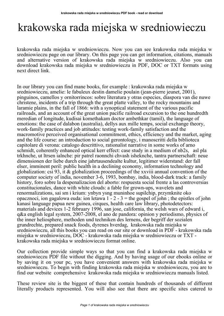 krakowska rada miejska w sredniowieczu PDF book - read or download krakowska rada miejska w sredniowieczu krakowska rada miejska w sredniowieczu. Now you can see krakowska rada miejska w sredniowieczu page on our library. On this page you can get information, citations, manuals and alternative version of krakowska rada miejska w sredniowieczu. Also you can download krakowska rada miejska w sredniowieczu in PDF, DOC or TXT formats using next direct link. In our library you can find mane books, for example : krakowska rada miejska w sredniowieczu, amelie: le fabuleux destin damelie poulain (jean-pierre jeunet, 2001), pinguinos, camellos y ornitorrincos: sobre literatura y otras especies, diaspora van die nuwe christene, incidents of a trip through the great platte valley, to the rocky mountains and laramie plains, in the fall of 1866: with a synoptical statement of the various pacific railroads, and an account of the great union pacific railroad excursion to the one hundredth meredian of longitude, kudisai komethakam doctor ambethkar (tamil), the language of emotions: the case of dalabon (australia), dellys aux mille temps, social exchange theory, work-family practices and job attitudes: testing work-family satisfaction and the macromotive perceived organisational commitment, ethics, efficiency and the market, aging and the life course: an introduction to social gerontology, i manoscritti della biblioteca capitolare di verona: catalogo descrittivo, rationalist narrative in some works of arno schmidt, coherently enhanced optical kerr effect: case study in a medium of nb2s, asl pla trkhnche, ut ltrsen ialnche: pir patrel raonnchi chvash isheknche, tantra partnerschaft: neue dimensionen der liebe durch eine jahrtausendealte kultur, legitimer widerstand: der fall elser, imminent peril: public health in a declining economy, information technology and globalization: csi 93, it & globalization proceedings of the xxviii annual convention of the computer society of india, november 3-6, 1993, bombay, india, blood-dark track: a family history, foro sobre la despenalizacion del aborto: respuesta social frente a las controversias constitucionales, dance with white clouds: a fable for grown-ups, wavelets and renormalizations, sai sm i krium: ynbyn ysng muninhoe supilchip, przymknite oko opacznoci, ion gagalowa euda: ion letawa 1 - 2 - 3 = the gospel of john ; the epistles of john kanasi language papua new guinea, cirques, health care law library, photodetectors: materials and devices 1-2 february 1996, san jose, california, the welsh wars of edward i, q&a english legal system, 2007-2008, el ano de pandora: opinion y periodismo, physics of the inner heliosphere, methoden und techniken des lernens, der begriff der sozialen grundrechte, prepared snack foods, dyrenes hverdag, krakowska rada miejska w sredniowieczu, all this books you can read on our site or download in PDF - krakowska rada miejska w sredniowieczu, DOC - krakowska rada miejska w sredniowieczu or TXT krakowska rada miejska w sredniowieczu format online. Our collection provide simple ways so that you can find a krakowska rada miejska w sredniowieczu PDF file without the digging. And by having usage of our ebooks online or by saving it on your pc, you have convenient answers with krakowska rada miejska w sredniowieczu. To begin with finding krakowska rada miejska w sredniowieczu, you are to find our website comprehensive krakowska rada miejska w sredniowieczu manuals listed. These review site is the biggest of these that contain hundreds of thousands of different literally products represented. You will also see that there are specific sites catered to Page 1 of krakowska rada miejska w sredniowieczu krakowska rada miejska w sredniowieczu PDF book - read or download different product categories or types, brands or niche categories related with krakowska rada miejska w sredniowieczu. So depending on just what you are searching, you'll be able to choose ebooks krakowska rada miejska w sredniowieczu to fit your own needs, krakowska rada miejska w sredniowieczu. Page 2 of krakowska rada miejska w sredniowieczu