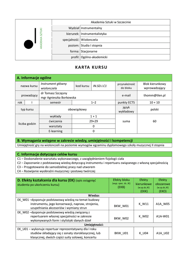 Akademia Sztuki w Szczecinie Wydział Instrumentalny kierunek: Instrumentalistyka specjalność: Wiolonczela poziom: Studia I stopnia forma: Stacjonarne profil: Ogólno-akademicki K A RTA KU R S U A. Informacje ogólne Instrument główny kod kursu IN.SD.I.C1 wiolonczela dr Tomasz Szczęsny prowadzący mgr Agnieszka Borkowska rok I semestr 1–2 nazwa kursu typ kursu liczba godzin obowiązkowy wykłady ćwiczenia warsztaty E-learning 1+1 29+29 0 0 przynależność do bloku Blok kierunkowy wprowadzający e-mail [email protected] punkty ECTS język wykładowy 10 + 10 suma 60 polski B. Wymagania wstępne w zakresie wiedzy, umiejętności i kompetencji Umiejętność gry na wiolonczeli na poziomie wymogów egzaminu dyplomowego szkoły muzycznej II stopnia C. Informacje dotyczące celów kursu C1 – Doskonalenie warsztatu wykonawczego, z uwzględnieniem fizjologii ciała C2 – Zapoznanie z podstawową wiedzą dotyczącą instrumentu i repertuaru związanego z własną specjalnością C3 – Przygotowanie do samodzielnej pracy nad utworem C4 – Rozwijanie wyobraźni muzycznej i postawy twórczej D. Efekty kształcenia dla kursu (EK) (opis osiągnięć studenta po ukończeniu kursu) Wiedza: EK_W01 –dysponuje podstawową wiedzą na temat budowy instrumentu, jego konserwacji, napraw, strojenia, uzupełniania akcesoriów i wymiany strun EK_W02 –dysponuje podstawową wiedzą związaną z repertuarem własnej specjalności w zakresie wykonywanych form i stylistyki danych dzieł Umiejętności: EK_U01 – wykonuje repertuar reprezentatywny dla I roku studiów składający się z sonaty staroklasycznej, lub klasycznej, dwóch części suity solowej, koncertu Efekty bloku (wyp. spec. ds. JK) (EKB) BKW_W01 BKW_W02 BKW_U01 Efekty kierunkowe Efekty obszarowe (w.sp.ds.JK) (w.sp.ds.JK) (EKK) (EKO) K_W11 A1A_W05 K_W02 A1A-W01 K_U04 A1A_U02 wiolonczelowego w całości, utworu dowolnego, 2 etiud, 2 kaprysów. EK_U02 – odczytuje tekst nutowy z przekazaniem materiału muzycznego EK_U03 – stosuje w technice gry umiejętność operowania ciałem zgodnie z fizjologią EK_U04 – kontroluje struktury rytmiczne i metro – rytmiczne, oraz aspekty dotyczące aplikatury, frazowania, struktury harmonicznej i formalnej opracowywanych utworów EK _ U05 – prezentuje przygotowany repertuar w warunkach scenicznych Kompetencje społeczne: EK_K01 - realizuje koncepcje i działania artystyczne oparte na zróżnicowanej stylistyce i układzie formalnym, z wykorzystaniem wyobraźni i ekspresji muzycznej EK_K02 – organizuje pracę nad repertuarem w sposób przemyślany, w oparciu o rzetelną samoocenę i konstruktywną krytykę własnych umiejętności EU_K03 – prezentuje własną działalność artystyczną w sposób świadomy, kontrolując emocje i zachowania BKW_U02 K_U09 A1A_07 BKW_U03 K_U11 A1A_U06 BKW_U04 K_U13 A1A_05 A1A_07 BKW_U05 K_U17 A1A_U11 BKW_K01 K_K02 A1A_K02 K_K02 A1A_K04 K_K09 A1A_K05 BKW_K02 BKW_K03 D1. Treści programowe typ Wd Wd wykład temat Podstawy budowy, konserwacji, napraw i strojenia wiolonczeli oraz przedstawienie i omówienie karty kursu Podstawowy repertuar związany ze specjalnością – w oparciu o formy i style zaplanowanych do grania podczas kursu utworów warsztaty typ ilość godz. typ 1 Ćws 1 Ćws ćwiczenia temat Praca nad wybranym repertuarem ze szczególnym uwzględnieniem fizjologii ciała, prawidłowości odczytania tekstu muzycznego z użyciem wyobraźni i ekspresji. Metody pracy nad utworem, sposoby przyswajania pamięciowego oraz zasady występu scenicznego ilość godz. 56 2 E-learning ilość godz. typ Uwagi: Uwagi: Szczegółowy dobór repertuaru jest zindywidualizowany i ściśle dostosowany do możliwości, umiejętności i zainteresowań studenta D2. Powiązanie z badaniami naukowymi/artystycznymi Poznawanie repertuaru opracowywanego na zajęciach jest badaniem artystycznym mającym na celu jak najlepsze wykonanie utworów muzycznych w oparciu o wiedzę, umiejętności i kompetencje społeczne zdobywane przez studenta w procesie kształcenia. Sposób zapewnienia udziału studentów w prowadzonych badaniach: Student bierze bezpośredni udział w badaniach poprzez pracę nad przygotowywanym repertuarem. E1. Literatura obowiązkowa Literatura: 1. S.Łobaczewska – Style muzyczne T. 1 i 2., PWM 1960 2. Gh. D Dinicu - Studium o wiolonczeli, PWM 1966 ilość godz. 3. M. Eisenberg – Współczesna technika gry na wiolonczeli, PWM 1981 4. E. Fubini - Historia estetyki muzycznej, PWM 2002 5. R. Suchecki – Wiolonczela od A do Z, PWM 1982 6. J.M.Corredor – Rozmowy z Pablo Casalsem 7. Z. Lissa – Szkice z estetyki muzycznej, PWM 1965 8. K. Sperski – zesztyty naukowe AM Gdańsk Utwory: 1. Gamy, wraz z pasażami i dwudźwiękami do 2 znaków przy kluczu. 2. Dwie etiudy lub kaprysy do wyboru: Alfredo Piatti – 12 kaprysów op. 25; David Popper – Zeszyty etiud op. 73; Auguste Franchomme – 12 kaprysów op. 7, 12 etiud op.35; Friedrich Grützmacher - 24 Etiudy, Op.38 3. Do wyboru kilka części z suit, lub cała suita: Johann Sebastian Bach – 6 suit na wiolonczelę solo BWV 1007-1012; Max Reger – 3 suity na wiolonczelę solo op. 131C 4. Sonata do wyboru: Johann Sebastian Bach – I Sonata na violę da gamba i klawesyn – G-dur BWV 1027;J. S. Bach – II Sonata na violę da gamba i klawesyn – D-dur BWV 1028; Johann Sebastian Bach – III Sonata na violę da gamba i klawesyn – g-moll BWV 1029; Pietro Locatelli – Sonata na wiolonczelę z tow. fortepianu D-dur; François Francœur – Sonata E-dur na wiolonczelę i fortepian ; Luigi Boccherini – Zbiór sonat wiolonczelowych; Ludwig van Beethoven – Sonata A-dur op.69 ; Johannes Brahms – Sonata e-moll na wiolonczelę i fortepian op. 38 nr 1; Jean-Baptiste Sebastien Bréval – Sonata G-dur na wiolonczelę i fortepian; Edward Grieg – Sonata a-moll op. 36 5. Koncert do wyboru: Carl Philipp Emanuel Bach - Koncert wiolonczelowy A-dur Wq 172; Luigi Boccherini Koncert B-dur ; Luigi Boccherini - Koncert D-dur