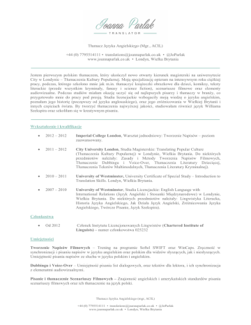 Tłumacz Języka Angielskiego (Mgr., ACIL) +44 (0) 7795514111 • [email protected] • @JoParlak www.joannaparlak.co.uk • Londyn, Wielka Brytania ________________________________________________________ Jestem pierwszym polskim tłumaczem, który ukończył nowo otwarty kierunek magisterski na uniwersytecie City w Londynie – Tłumaczenia Kultury Popularnej. Moją specjalizację opieram na intensywnym roku ciężkiej pracy, podczas, którego szkolono mnie jak m.in. tłumaczyć książeczki obrazkowe dla dzieci, komiksy, teksty literackie (przede wszystkim kryminały, fanasy i science fiction), scenariusze filmowe oraz elementy audiowizualne. Podczas studiów miałam okazję uczyć się od najlepszych pisarzy i tłumaczy w branży, co przygotowało mnie do pracy pod presją. Studia licencjackie wzbogaciły moją wiedzę o języku angielskim, poznałam jego historię (począwszy od języka anglosaskiego), oraz jego zróżnicowania w Wielkiej Brytanii i innych częściach świata. By tworzyć tłumaczenia najwyższej jakości, studiowałam również język Williama Szekspira oraz szkoliłam się w kreatywnym pisaniu. ________________________________________________________ Wykształcenie i kwalifikacje 2012 – 2012 Imperial College London, Warsztat jednodniowy: Tworzenie Napisów – poziom zaawansowany. 2011 – 2012 City University London, Studia Magisterskie: Translating Popular Culture (Tłumaczenia Kultury Popularnej) w Londynie, Wielkia Brytania. Do niektórych przedmiotów należały: Zasady i Metody Tworzenia Napisów Filmowych, Tłumaczenie Dubbingu i Voice-Over, Tłumaczenia Literatury Dziecięcej, Tłumaczenia Tekstów Multimodalnych, Tłumaczenia Literatury Kryminalnej). 2010 – 2011 University of Westminster, University Certificate of Special Study – Introduction to Translation Skills. Londyn, Wielkia Brytania. 2007 – 2010 University of Westminster, Studia Licencjackie: English Language with International Relations (Język Angielski i Stosunki Międzynarodowe) w Londynie, Wielkia Brytania. Do niektórych przedmiotów należały: Lingwistyka Literacka, Historia Języka Angielskiego, Jak Działa Język Angielski, Zróżnicowania Języka Angielskiego, Twórcze Pisanie, Język Szekspira). Członkostwa Od 2012 Członek Instytutu Licencjonowanych Lingwistów (Chartered Institute of Linguists) – numer członkowstwa 025232 Umiejętności Tworzenie Napisów Filmowych – Trening na programie Softel SWIFT oraz WinCaps. Zręczność w synchronizacji i pisaniu napisów w języku angielskim oraz polskim dla widzów słyszących, jak i niesłyszących. Umiejętność pisania napisów ze słuchu w języku polskim i angielskim. Dubbingu i Voice-Over – Umiejętność pisania list dialogowych, oraz tekstów dla lektora, i ich synchronizacja z elemenatmi audiowizualnymi. Pisanie i tłumaczenie Scenariuszy Filmowych – Znajomość angielskich i amerykańskich standardów pisania scenariuszy filmowych oraz ich tłumaczenie na język polski. Tłumacz Języka Angielskiego (mgr, ACIL) +44 (0) 7795514111 • [email protected] • @JoParlak www.joannaparlak.co.uk • Londyn, Wielka Brytania Tłumaczenie Literatury dla Dzieci i Młodzieży – Tłumaczenie książeczek obrazkowych, jak i literatury dziecięcej i tej poświęconej dla młodzieży. Tłumaczenie Tekstów Multimodalnych – Umiejętność tłumaczenia komiksów, powieści graficznych oraz gier komputerowych. Tłumaczenie Science Fiction / Fantasy – Szkolenie w tłumaczeniu złożonej narracji, ideologii oraz języków stworzonych dla potrzeb dzieł literackich. Tłumaczenie Literatury Kryminalnej – Znajomość języka sądowego i procedur kryminalistycznych. Szkolenie ze znajomości tłumaczeń spójności tekstów literatury kryminalnej. Doświadczenie Luty 2014 Ribbon & Pearl Tłumaczenie fragmentów firmowej strony internetowej. Maj 2012 Charlaine Harris Dead Reckoning. Tłumaczenie fragmentów książki. Maj 2012 Kathy Reichs Cross Bones. Tłumaczenie fragmentów książki. Maj 2012 The Departed (Tłumaczenie fragmentów scenariusza filmowego Infiltracja) Kwiecień 2012 London Film Academy Korekta polskich napisów do krótkiego filmu Adam’s Paradise, pod nadzorem Julii Knapp. Marzec 2012 Despicable Me (Tłumaczenie fragmentów scenariusza filmu animowanego Ja, podły Gru) Luty 2012 Dennis and Gnasher – Smelling of Roses. Tłumaczenie i lista dialogowa. Styczeń 2012 Adventure Comics #1, Superman. Styczeń 2012 Maurice Sendak Where the Wild Things Are. Październik 2011 Behind the Scenes of Pirates of the Caribbean At World's End. Spis dialogu ze słuchu w języku angielskim oraz napisy w języku angielskim. Grudzień 2011 Gladiator. Spis dialogu ze słuchu w języku angielskim oraz napisy dla niesłyszących utworzone zgodnie ze wskazówkami BBC (napisy w języku angielskim). Dodatkowe Umiejętności Softel – SWIFT (oprogramowanie napisów filmowych) WinCaps (oprogramowanie napisów filmowych) SDL Trados Mac OS X, Windows, Word and Excel. Tłumacz Języka Angielskiego (mgr, ACIL) +44 (0) 7795514111 • [email protected] • @JoParlak www.joannaparlak.co.uk • Londyn, Wielka Brytania