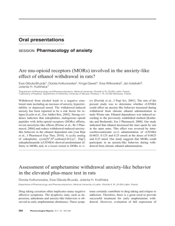 Oral presentations SESSION: Pharmacology of anxiety Are mu-opioid receptors (MORs) involved in the anxiety-like effect of ethanol withdrawal in rats? Ewa Gibu³a-Bruzda1, Dorota Ko³tunowska1, Kinga Gawe³1, Ewa Witkowska2, Jan Izdebski2, Jolanta H. Kotliñska1 Department of Pharmacology and Pharmacodynamics, Medical University, Chodki 6, PL 20-093 Lublin, Poland; Laboratory of Peptides, Department of Chemistry, University of Warsaw, Pasteura 1, PL 02-093 Warszawa, Poland Withdrawal from alcohol leads to a negative emotional state including an increase of anxiety, hyperirritability or depressed mood. The withdrawal-induced anxiety has been reported to be a risk factor for relapse [Lucht et al., Eur Addict Res, 2002]. Strong evidence indicates that enkephalins, endogenous opioid peptides with delta-opioid receptors (DORs) affinity, reveal anxiolytic-like effects [Perine et al., Br J Pharmacol, 2006] and reduce withdrawal-induced anxietylike behavior in the ethanol dependent rats [van Rijn et al., J Pharmacol Exp Ther, 2010]. A cyclic analog of enkephalin, cyclo[NA,N>-carbonyl-D-Lys2, Dap5] enkephalinamide (cUENK6) showed predominant affinity to MORs and, to a lesser extent to DORs in vi- tro [Pawlak et al., J Pept Sci, 2001]. The aim of the present study was to determine whether cUENK6 could affect an anxiety-like behavior measured during withdrawal from chronic ethanol administration in male Wistar rats. Ethanol dependence was induced according to the previously established method [Kotlinska and Bochenski, Eur J Pharmacol, 2008]. Our study indicated that ethanol decreased the time spent by rats in the open arms. This effect was reversed by intracerebroventricular (icv) administration of cUENK6 (0.0625, 0.125 and 0.25 nmol) at the doses of 0.0625 and 0.25 nmol. Our study suggests that MORs could participate in an anxiety-like behavior during withdrawal from chronic ethanol administration. Assessment of amphetamine withdrawal anxiety-like behavior in the elevated plus-maze test in rats Dorota Ko³tunowska, Ewa Gibu³a-Bruzda, Jolanta H. Kotliñska Department of Pharmacology and Pharmacodynamics, Medical University of Lublin, Chodki 6, PL 20-093 Lublin, Poland Drug taking cessation often implicates many negative affective symptoms. The dysphoric state, such as depression, anhedonia and anxiety-like behaviors is observed in early amphetamine abstinence. These symp560 Pharmacological Reports, 2011, 63, 560588 toms certainly contribute to drug taking and relapse to addiction. Therefore, there is a great need to provide successful treatment for early amphetamine withdrawal. However, evaluation of full expression of The Twentieth Days of Neuropsychopharmacology Oral presentations dysphoric state during amphetamine withdrawal in experimental animals is often confusing and highly depends on the dose and time schedules. The primary goal of the study was to choose a method, which allows the most effective induction of the anxiety-like behavior in amphetamine withdrawal in Wistar rats. Amphetamine (2.5 mg/kg ip) was administered once daily for 14 consecutive days. The anxiety-like behavior was estimated 24 hours or 14 days after withdrawal from amphetamine treatment in the elevated plus maze (EPM) test as the percent of time spent in open arms and the percent of entries into the open arms. Our results indicated that rats that have been withdrawn from repeated amphetamine, displayed a significant increase in anxiety-like behavior after 24 hours of withdrawal, while no changes in the locomotor activity was observed. Extending the withdrawal period from 1 to 14 days caused no significant changes in rats’ behavior. This symptom of withdrawal was also estimated 24 hours after single injection of amphetamine (2.5 mg/kg) and revealed reduced anxiety-like behavior in the amphetaminetreated rats with no change in locomotor activity. These results indicate that the anxiety-like behavior is time limited only to an early withdrawal after chronic amphetamine administration. Key words: amphetamine withdrawal, rats, withdrawal schedule, EPM Abbreviations: EPM – elevated plus maze test The expression of NMDA(R)(NR2B) subunit in rats selected for low and high anxiety Ma³gorzata Lehner1, Aleksandra Wis³owska-Stanek2, Anna Skórzewska1, Danuta Turzyñska1, Alicja Sobolewska1, Adam P³aŸnik1,2 Department of Neurochemistry, Institute of Psychiatry and Neurology, Sobieskiego 9, PL 02-957 Warszawa, Poland; Department of Experimental and Clinical Pharmacology, Medical University, Krakowskie Przedmiecie 26/28, PL 00-927 Warszawa, Poland In the experiment, we studied differences in the density of NMDA receptor NR2B subunit in the brain structures of low (LR) and high (HR) anxiety rats in basal condition and after exposure to extinction trials and re-learning of a conditioned fear response. Classification of animals as LR or HR was determined by fear-induced freezing responses in the contextual fear test (the duration of a freezing response was used as a discriminating variable). In basal conditions we found increased concentrations of NR2B in the amygdala of HR rats as compared to the unconditioned control group. An exposure of HR animals to fear conditioned context on re-test elevated the expression of NR2B subunits in the basolateral amygdala, prefrontal cortex and dentate gyrus of HR animals. Together, these data suggest that animals that are more anxious have altered patterns of NR2B subunit expression in the frontal cortex and limbic structures, which control emotional behavior. In the HR group the density of NR2B subunits in the cortex correlated negatively with the duration of a freezing response upon re-test of a conditioned fear. The current results suggest that drugs targeting NMDA receptors containing the NR2B subunit may be useful for the treatment of anxiety disorders. Pharmacological Reports, 2011, 63, 560588 561 The influence of CRF2 receptor antagonists on rat conditioned fear responses and c-Fos and CR