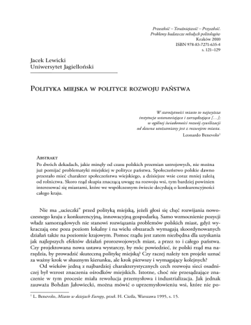 Przeszłość – Teraźniejszość – Przyszłość. Problemy badawcze młodych politologów Kraków 2010 ISBN 978-83-7271-635-4 s. 121–129 Jacek Lewicki Uniwersytet Jagielloński Polityka miejska w polityce rozwoju państwa W starożytności miasto to najwyższa instytucja ustanawiająca i zarządzająca […]; w ogólnej świadomości rozwój cywilizacji od dawna utożsamiany jest z rozwojem miasta. Leonardo Benevolo Abstrakt Po dwóch dekadach, jakie minęły od czasu polskich przemian ustrojowych, nie można już pomijać problematyki miejskiej w polityce państwa. Społeczeństwo polskie dawno przestało mieć charakter społeczeństwa wiejskiego, a dzisiejsze wsie coraz mniej zależą od rolnictwa. Skoro rząd skupia znaczącą uwagę na rozwoju wsi, tym bardziej powinien interesować się miastami, które we współczesnym świecie decydują o konkurencyjności całego kraju. Nie ma „ucieczki” przed polityką miejską, jeżeli głosi się chęć rozwijania nowoczesnego kraju z konkurencyjną, innowacyjną gospodarką. Samo wzmocnienie pozycji władz samorządowych nie stanowi rozwiązania problemów polskich miast, gdyż wykraczają one poza poziom lokalny i na wielu obszarach wymagają skoordynowanych działań także na poziomie krajowym. Pomoc rządu jest zatem niezbędna dla uzyskania jak najlepszych efektów działań prorozwojowych miast, a przez to i całego państwa. Czy projektowana nowa ustawa wystarczy, by móc powiedzieć, że polski rząd ma narzędzia, by prowadzić skuteczną politykę miejską? Czy raczej należy ten projekt uznać za ważny krok w słusznym kierunku, ale krok pierwszy i wymagający kolejnych? Od wieków jedną z najbardziej charakterystycznych cech rozwoju sieci osadniczej był wzrost znaczenia ośrodków miejskich. Istotne, choć nie przesądzające znaczenie w tym procesie miała rewolucja przemysłowa i industrializacja. Jak jednak zauważa Bohdan Jałowiecki, można mówić o uprzemysłowieniu wsi, które nie po L. Benevolo, Miasto w dziejach Europy, przeł. H. Cieśla, Warszawa 1995, s. 15. 122 Jacek Lewicki woduje urbanizacji (np. we wsi powstaje fabryka lub zakłady przemysłowe w mieście zatrudniają mieszkańców terenów wiejskich). Procesy urbanizacyjne występowały już w dobie preindustrialnej, choć skala ich była oczywiście mniejsza. W powojennej Polsce urbanizacja była wyjątkowo dynamiczna. O ile w 1946 roku w miastach żyło 7,5 mln osób, w 1950 roku – 9,6 mln, to już w 1980 roku aż 20,9 mln. Wzrost liczby ludności miejskiej był następstwem nie tylko wysokiego przyrostu naturalnego (typowego dla okresów powojennych) i migracji, ale także działań administracyjnych polegających na włączaniu do miast przyległych terenów wiejskich oraz nadawaniu praw miejskich kolejnym osiedlom. Polska długo pozostawała słabo zurbanizowanym krajem i dopiero w 1966 roku ludność miejska przekroczyła liczbę ludności wsi. W 1999 roku prawie 62% mieszkańców Polski żyło w miastach. Wraz z urbanizacją następowały również inne przekształcenia sieci osadniczej. Zmalała liczba miast najmniejszych. Liczba miast 10-tysiecznych w zasadzie utrzymała się na podobnym poziomie, liczba miast do 20 tys. mieszkańców wzrosła w latach 1950–1994 przeszło dwukrotnie, liczba miast do 50 tys. mieszkańców – wzrosła trzykrotnie, miast do 100 tys. mieszkańców – prawie pięciokrotnie, miast do 200 tys. mieszkańców prawie czterokrotnie, podobnie zwiększyła się liczba miast największych. Obecnie największym spośród 879 polskich miast pozostaje stołeczna Warszawa (1 711 466 mieszkańców), kolejne dwa miasta to: Kraków (754 854 mieszkańców) i Łódź (744 541 mieszkańców). Najmniejszą miejscowością posiadającą prawa miejskie są Wyśmierzyce (pow. białobrzeski) liczące jedynie 858 mieszkańców (dla przykładu największą wieś, Kozy w powiecie bielskim, zamieszkuje 11 920 osób). Od blisko dwóch dekad udział ludności miejskiej w całości populacji pozostaje w granicach 61,2–61,8%. Do końca XX wieku utrzymywało się nieznacznie dodatnie saldo migracji na korzyść miast, jednak po 2000 roku tendencja się odwróciła, tj. przeważają migracje z miast do wsi. Także wskaźniki ruchu naturalnego, choć nieznacznie, ale są korzystniejsze dla wsi. W konsekwencji „liczba ludności obszarów wiejskich wzrasta (z 14 584 tys. do 14 756 tys. w okresie 2000–2006), podczas gdy liczba mieszkańców miast wykazuje spadek – z 23 670 tys. do 23 369 tys.” Jak słusznie zauważają autorzy projektu Koncepcji Przestrzennego Zagospodarowania Kraju, powyższe dane nie świadczą o procesie dezurbanizacji, lecz o nieadekwatności podziału administracyjnego do faktycznej sytuacji przestrzennej kraju. Proces, który obserwujemy w rejonie dużych miast, czyli suburbanizacja, nie ma odzwierciedlenia w zmianach administracyjnych. Podmiejskie tereny pomimo nowych funkcji, rosnącej zabudowy mieszkaniowej itd., nadal pozostają formalnie terenami wiejskimi. Co więcej, jak dalej wskazują autorzy rzeczonego projektu: Por. B. Jałowiecki, Zarządzanie rozwojem aglomeracji miejskich, Białystok 2002, s. 8–9. Ibidem, s. 16–17. Ibidem. Za: Ludność. Stan i struktura w przekroju terytorialnym stan w dn. 31 XII 2008 r., GUS, Warszawa 2008. Projekt autorski KPZK do roku 2033, Warszawa 2008 (grudzień), s. 19–20. Polityka miejska w polityce rozwoju państwa 123 znaczna część migracji do miast to przemieszczenia nie rejestrowane, nie odnotowane w danych meldunkowych. Odwrócenie salda migracji między obszarami wiejskimi a miastami jest zatem zjawiskiem pozornym. Podobnie jest w przypadku danych wskazujących na zmniejszanie się udziału ludności miejskiej. Zaliczenie do tej kategorii ludności faktycznie zurbanizowanych stref położonych wokół dużych miast oznaczałoby wzrost wartości tego wskaźnika do ok. 65–68%. Same migracje wieś–miasto oraz miasto–wieś przez autorów KPZK szacowane 