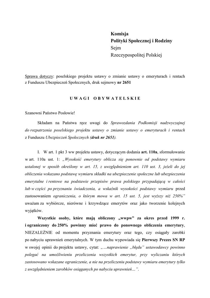 Komisja Polityki Społecznej i Rodziny Sejm Rzeczypospolitej Polskiej Sprawa dotyczy: poselskiego projektu ustawy o zmianie ustawy o emeryturach i rentach z Funduszu Ubezpieczeń Społecznych, druk sejmowy nr 2651 UWAGI OBYWATELSKIE Szanowni Państwo Posłowie! Składam na Państwa ręce uwagi do Sprawozdania Podkomisji nadzwyczajnej do rozpatrzenia poselskiego projektu ustawy o zmianie ustawy o emeryturach i rentach z Funduszu Ubezpieczeń Społecznych (druk nr 2651). I. W art. 1 pkt 3 ww projektu ustawy, dotyczącym dodania art. 110a, sformułowanie w art. 110a ust. 1: „Wysokość emerytury oblicza się ponownie od podstawy wymiaru ustalonej w sposób określony w art. 15, z uwzględnieniem art. 110 ust. 3, jeżeli do jej obliczenia wskazano podstawę wymiaru składki na ubezpieczenie społeczne lub ubezpieczenia emerytalne i rentowe na podstawie przepisów prawa polskiego przypadającą w całości lub w części po przyznaniu świadczenia, a wskaźnik wysokości podstawy wymiaru przed zastosowaniem ograniczenia, o którym mowa w art. 15 ust. 5, jest wyższy niż 250%” uważam za wybiórcze, nierówne i krzywdzące emerytów oraz jako tworzenie kolejnych wyjątków. Wszystkie osoby, które mają obliczony „wwpw” za okres przed 1999 r. i ograniczony do 250% powinny mieć prawo do ponownego obliczenia emerytury, NIEZALEŻNIE od momentu przyznania emerytury oraz tego, czy osiągały zarobki po nabyciu uprawnień emerytalnych. W tym duchu wypowiada się Pierwszy Prezes SN RP w swojej opinii do projektu ustawy, cytat: „…naprawienie „błędu” ustawodawcy powinno polegać na umożliwieniu przeliczenia wszystkich emerytur, przy wyliczaniu których zastosowano wskazane ograniczenie, a nie na przeliczeniu podstawy wymiaru emerytury tylko z uwzględnieniem zarobków osiąganych po nabyciu uprawnień…”. II. W art. 1 pkt 4 ww projektu ustawy, dotyczącym zmian w art. 174, po ust. 2 dodaje się ust. 2a w brzmieniu: „2a. Przy ustalaniu kapitału początkowego do okresów, o których mowa w art. 7 pkt 5 stosuje się art. 53 ust. 1 pkt 2.”. Takie sformułowanie również wybiórczo i nierówno traktuje osoby, które przebywały na urlopach wychowawczych, zawężając grupę „beneficjentek” jedynie do tych, które będą miały uwzględnione te zmiany w kapitale początkowym, POMIJAJĄC osoby przebywające na emeryturach nie obliczanych metodą kapitałową (na zasadach przed 1999 r.). Regulacja powinna obejmować WSZYSTKIE osoby, które korzystały z urlopów wychowawczych i mają ten okres uznawany do tej pory z przelicznikiem 0,7% podstawy. W tym przypadku również Pierwszy Prezes SN RP w swojej opinii do projektu ustawy uważa to za niewłaściwe, cytat: „…proponowana regulacja stawia osoby urodzone po 1948 r. w lepszej sytuacji w stosunku do ubezpieczonych urodzonych przed 1949 rokiem, którzy okres urlopu wychowawczego sprzed 1999 roku mają uwzględniony w rozmiarze 1/3 posiadanych okresów składkowych i z przelicznikiem 0,7% podstawy…”. Uważam, że powyższe przepisy proponowane w projekcie ustawy, zawężające krąg osób, które zostają nimi objęte, mają na celu jak największe ograniczenie kosztów wprowadzenia ustawy, co skutkuje nierównym traktowaniem i może budzić poważne zastrzeżenia natury konstytucyjnej. W związku z powyższym zwracam się z prośbą do Komisji Polityki Społecznej i Rodziny o dokładne zapoznanie się z treścią i skutkami zmian projektowanych w ustawie emerytalnej oraz z apelem o objęcie proponowanymi zmianami wszystkich, będących w podobnej sytuacji, a nie tylko grup obecnie wskazanych w projekcie. 2