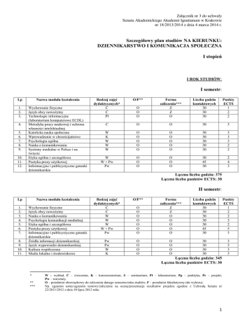 Załącznik nr 3 do uchwały Senatu Akademickiego Akademii Ignatianum w Krakowie nr 18/2013/2014 z dnia 4 marca 2014 r. Szczegółowy plan studiów NA KIERUNKU: DZIENNIKARSTWO I KOMUNIKACJA SPOŁECZNA I stopień I ROK STUDIÓW: I semestr: Lp Nazwa modułu kształcenia 1. 2. 3. Wychowanie fizyczne Język obcy nowożytny Technologie informacyjne (laboratorium komputerowe ECDL) Metodyka pracy naukowej i ochrona własności intelektualnej Katolicka nauka społeczna Wprowadzenie w chrześcijaństwo Psychologia ogólna Nauka o komunikowaniu Systemy medialne w Polsce i na świecie Etyka ogólna i szczegółowa Poetyka prozy użytkowej Informacyjne i publicystyczne gatunki dziennikarskie 4. 5. 6. 7. 8. 9. 10. 11. 12. Rodzaj zajęć dydaktycznych* Ć Ć Pl O/F** O O O Forma zaliczenia*** Z Z O Liczba godzin kontaktowych 30 30 30 Punkty ECTS 1 2 2 Ć O O 30 3 W K W W W O O O O O O O O O O 30 30 30 30 30 3 3 3 2 2 W W + Pw Pw O O O O O O 30 45 30 2 4 3 Łączna liczba godzin: 375 Łączna liczba punktów ECTS: 30 II semestr: Lp Nazwa modułu kształcenia 1. 2. 3. 4. 5. 6. 7. Wychowanie fizyczne Język obcy nowożytny Nauka o komunikowaniu Psychologia komunikacji medialnej Etyka ogólna i szczegółowa Poetyka prozy użytkowej Informacyjne i publicystyczne gatunki dziennikarskie Źródła informacji dziennikarskiej Język wypowiedzi dziennikarskiej Kultura współczesna Media lokalne i środowiskowe 8. 9. 10. 11. Rodzaj zajęć dydaktycznych* Ć Ć W W W W + Pw Pw O/F** Pw Pw W K O O O O O O O Forma zaliczenia*** Z Z O O O O O Liczba godzin kontaktowych 30 30 30 30 30 45 30 Punkty ECTS 1 2 2 3 2 5 3 O O O O O O O O 30 30 30 30 3 3 3 3 Łączna liczba godzin: 345 Łączna liczba punktów ECTS: 30 ----------------------------* ** *** W – wykład, Ć – ćwiczenia, K – konwersatorium, S – seminarium, Pl – laboratorium, Pp – praktyka, Pr – projekt, Pw – warsztaty. O – przedmiot obowiązkowy do zaliczenia danego semestru/roku studiów, F – przedmiot fakultatywny (do wyboru). Np. egzamin ustny/egzamin testowy/zaliczenie na ocenę/prezentacja rezultatów projektu zgodnie z Uchwałą Senatu nr 22/2011/2012 z dnia 10 lipca 2012 roku 1 Załącznik nr 3 do uchwały Senatu Akademickiego Akademii Ignatianum w Krakowie nr 18/2013/2014 z dnia 4 marca 2014 r. II ROK STUDIÓW: III semestr: Lp 1. 2. 3. 4. 5. 6. 7. 8. 9. 10. 11. 10. 11. 10. 11. 10. 11. Nazwa modułu kształcenia Rodzaj zajęć dydaktycznych* Ć W W W K Pw K Pp O/F** Język obcy nowożytny Prawo dziennikarskie Etyka dziennikarska Historia najnowsza Polski Mniejszości narodowe i etniczne w Europie Warsztat rzecznika prasowego Wprowadzenie do praktyk Praktyki kierunkowa hospitacyjnoobserwacyjna Moduł swobodnego wyboru – 5 Specjalność (do wyboru): Dziennikarstwo prasowe Dziennikarstwo prasowe Warsztat dziennikarza prasowego Specjalność (do wyboru): Dziennikarstwo radiowe Dziennikarstwo radiowe Warsztat dziennikarza radiowego Specjalność (do wyboru): Dziennikarstwo telewizyjne Warsztat dziennikarza telewizyjnego Kurs pracy z kamerą Specjalność (do wyboru): Dziennikarstwo internetowe Dziennikarstwo internetowe Warsztat dziennikarza internetowego O O O O O O O O Forma zaliczenia*** Z O O O O O Z Z Liczba godzin kontaktowych 30 15 15 30 30 30 20 150 Punkty ECTS 2 2 2 2 3 3 1 6 Pr F O 25 3 K Pw F F O O 30 30 3 3 K Pw F F O O 30 30 3 3 Pw Pw F F O O 30 30 3 3 K Pw F F O O 30 30 3 3 Łączna liczba godzin: 255 Łączna liczba punktów ECTS: 30 IV semestr: Lp 1. 2. 3. 4. 5. 6. 7. 8. 9. 10. 8. 9. 10. 8. 9. 10. 8. 9. 10. Nazwa modułu kształcenia Język obcy nowożytny Socjologia komunikacji mediów Dykcja i emisja głosu Historia najnowsza Polski Stylistyka i kultura języka polskiego Warsztat rzecznika prasowego Moduł swobodnego wyboru – 1 Specjalność: Dziennikarstwo prasowe Warsztat dziennikarza prasowego Seminarium dyplomowe: dziennikarstwo prasowe Praktyka specjalnościowa ciągła Specjalność: Dziennikarstwo radiowe Warsztat dziennikarza radiowego Seminarium dyplomowe: dziennikarstwo radiowe Praktyka specjalnościowa ciągła Specjalność: Dziennikarstwo telewizyjne Warsztat dziennikarza telewizyjnego Seminarium dyplomowe: dziennikarstwo telewizyjne Praktyka specjalnościowa ciągła Specjalność: Dziennikarstwo internetowe Warsztat dziennikarza internetowego Seminarium dyplomowe: dziennikarstwo internetowe Praktyka specjalnościowa ciągła Rodzaj zajęć dydaktycznych* Ć W Ć W Pw Pw Pw O/F** O O O O O O F Forma zaliczenia*** O O O O O O O Liczba godzin kontaktowych 30 30 30 30 30 30 15 Punkty ECTS 3 3 2 2 4 3 2 Pw S F F O Z 30 15 3 2 Pp F Z 150 6 Pw S F O Z 30 15 3 2 Pp F F Z 150 6 Pw S F F O Z 30 15 3 2 Pp F Z 150 6 Pw S F F O Z 30 15 3 2 Pp F Z 150 6 Łączna liczba godzin: 240 Łączna liczba punktów ECTS: 30 III rok: 2 Załącznik nr 3 do uchwały Senatu Akademickiego Akademii Ignatianum w Krakowie nr 18/2013/2014 z dnia 4 marca 2014 r. V semestr: Lp 1. 2. 3. 4. 5. 6. 7. 8. 9. 10. 11. 8. 9. 10. 11. 8. 9. 10. 11. 8. 9. 10. 11. Nazwa modułu kształcenia Filozofia języka Semiotyka języka Współczesne zagadnienia społeczne, polityczne i gospodarcze Podstawy dialogu międzykulturowego i międzyreligijnego Public Relations Moduł swobodnego wyboru – 2 Moduł swobodnego wyboru – 3 Specjalność: Dziennikarstwo prasowe Warsztat publicysty prasowego Warsztat krytyka Fotografia prasowa Seminarium dyplomowe: dziennikarstwo prasowe Specjalność: Dziennikarstwo radiowe Warsztat publicysty radiowego Przygotowanie serwisów informacyjnych Praca z mikrofonem Seminarium dyplomowe: dziennikarstwo radiowe Specjalność: Dziennikarstwo telewizyjne Warsztat publicysty telewizyjnego Warsztat prezentera telewizyjnego Montaż telewizyjny Seminarium dyplomowe: dziennikarstwo telewizyjne Specjalność: Dziennikarstwo internetowe Warsztat publicysty internetowego Przygotowanie serwisów informacyjnych on-line Bezpieczeństwo i dostęp do informacji w Internecie Seminarium dyplomowe: dziennikarstwo internetowe Rodzaj zajęć d