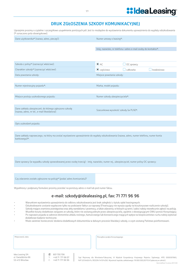 1/1 Druk zgłoszenia szkody komunikacyjnej Uprzejmie prosimy o czytelne i szczegółowe uzupełnienie poniższych pól. Jest to niezbędne do wystawienia dokumentu upoważnienia do wypłaty odszkodowania (* oznaczono pola obowiązkowe). Dane użytkownika* (nazwa, adres, pieczęć): Numer umowy o leasing*: Imię, nazwisko, nr telefonu i adres e-mail osoby do kontaktu*: Szkoda z polisy* (zaznaczyć właściwe): AC OC sprawcy Charakter szkody* (zaznaczyć właściwe): częściowa całkowita Data powstania szkody: Miejsce powstania szkody: Numer rejestracyjny pojazdu*: Marka, model pojazdu: Miejsce postoju uszkodzonego pojazdu: Numer szkody ubezpieczyciela*: Dane zakładu ubezpieczeń, do którego zgłoszono szkodę (nazwa, adres, nr tel., e-mail likwidatora): Szacunkowa wysokość szkody (w PLN)*: kradzieżowa Opis uszkodzeń pojazdu: Dane zakładu naprawczego, na który ma zostać wystawione upoważnienie do wypłaty odszkodowania (nazwa, adres, numer telefonu, numer konta bankowego)*: Dane sprawcy (w wypadku szkody spowodowanej przez osobę trzecią) - imię, nazwisko, numer rej., ubezpieczyciel, numer polisy OC sprawcy: Czy zdarzenie zostało zgłoszone na policję* (podać adres komisariatu)? Wypełniony i podpisany formularz prosimy przesłać na poniższy adres e-mail lub pod numer faksu. e-mail: [email protected], fax: 71 771 96 96 • • • • • • Warunkiem wystawienia upoważnienia do odbioru odszkodowania jest brak zaległości z tytułu opłat leasingowych. Odszkodowanie zostanie wypłacone tylko na podstawie faktur za naprawę (Finansujący nie wyraża zgody na kosztorysowe rozliczenie szkody). Szkody mające znamiona przestępstwa oraz akty wandalizmu i przemocy, a także zdarzenia, w których są ranni / zabici należy niezwłocznie zgłosić na policję. Wszelkie koszty dodatkowe związane ze szkodą, które nie zostaną pokryte przez ubezpieczyciela, zgodnie z obowiązującymi OWU ponosi Korzystający. Po naprawie pojazdu w zakresie elementów układu nośnego, hamulcowego lub kierowniczego mających wpływ na bezpieczeństwo ruchu należy wykonać dodatkowe badanie techniczne. Może zaistnieć konieczność dosłania dodatkowych dokumentów w dalszym procesie likwidacji szkody, o czym zostaną Państwo poinformowani. Miejscowość, data Idea Leasing SA ul. Gwiaździsta 66 53-413 Wrocław Pieczątka i podpis Korzystającego T: F: 801 700 706 +48 71 771 96 07 +48 71 771 96 96 Sąd Rejonowy dla Wrocławia-Fabrycznej, VI Wydział Gospodarczy Krajowego Rejestru Sądowego, KRS 0000307665, NIP 5213482474, REGON 141374292. Wysokość kapitału zakładowego: 19 000 000,00 PLN (opłacony w całości). Data modyfikacji: 14 czerwca, 2013 13:06