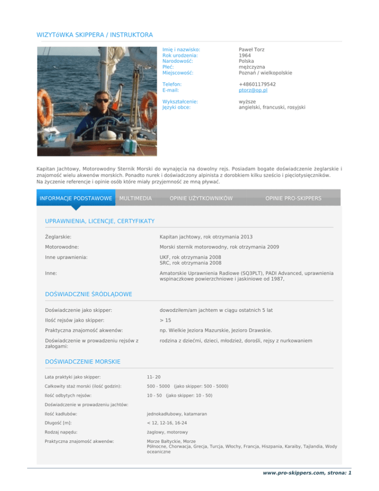 WIZYTóWKA SKIPPERA / INSTRUKTORA Imię i nazwisko: Rok urodzenia: Narodowość: Płeć: Miejscowość: Paweł Torz 1964 Polska mężczyzna Poznań / wielkopolskie Telefon: E-mail: +48601179542 [email protected] Wykształcenie: Języki obce: wyższe angielski, francuski, rosyjski Kapitan Jachtowy, Motorowodny Sternik Morski do wynajęcia na dowolny rejs. Posiadam bogate doświadczenie żeglarskie i znajomość wielu akwenów morskich. Ponadto nurek i doświadczony alpinista z dorobkiem kilku sześcio i pięciotysięczników. Na życzenie referencje i opinie osób które miały przyjemność ze mną pływać. INFORMACJE PODSTAWOWE MULTIMEDIA OPINIE UŻYTKOWNIKÓW OPINIE PRO-SKIPPERS UPRAWNIENIA, LICENCJE, CERTYFIKATY Żeglarskie: Kapitan jachtowy, rok otrzymania 2013 Motorowodne: Morski sternik motorowodny, rok otrzymania 2009 Inne uprawnienia: UKF, rok otrzymania 2008 SRC, rok otrzymania 2008 Inne: Amatorskie Uprawnienia Radiowe (SQ3PLT), PADI Advanced, uprawnienia wspinaczkowe powierzchniowe i jaskiniowe od 1987, DOŚWIADCZNIE ŚRÓDLĄDOWE Doświadczenie jako skipper: dowodziłem/am jachtem w ciągu ostatnich 5 lat Ilość rejsów jako skipper: > 15 Praktyczna znajomość akwenów: np. Wielkie Jeziora Mazurskie, Jezioro Drawskie. Doświadczenie w prowadzeniu rejsów z załogami: rodzina z dziećmi, dzieci, młodzież, dorośli, rejsy z nurkowaniem DOŚWIADCZENIE MORSKIE Lata praktyki jako skipper: 11- 20 Całkowity staż morski (ilość godzin): 500 - 5000 (jako skipper: 500 - 5000) Ilość odbytych rejsów: 10 - 50 (jako skipper: 10 - 50) Doświadczenie w prowadzeniu jachtów: Ilość kadłubów: jednokadłubowy, katamaran Długość [m]: < 12, 12-16, 16-24 Rodzaj napędu: żaglowy, motorowy Praktyczna znajomość akwenów: Morze Bałtyckie, Morze Północne, Chorwacja, Grecja, Turcja, Włochy, Francja, Hiszpania, Karaiby, Tajlandia, Wody oceaniczne www.pro-skippers.com, strona: 1 Doświadczenie w prowadzeniu rejsów z załogami: rodzina z dziećmi, dzieci, młodzież, dorośli, rejsy z nurkowaniem DOŚWIADCZNIE SZKOLENIOWE Brak danych DOŚWIADCZENIE REGATOWE Rodzaj doświadczenia regatowego: turystyczne Rodzaj regat ze względu na akwen: śródlądowe Ilość udziałów w regatach: <5 w tym w ostatnich 5 latach: <5 Pełnione funkcje podczas regat: skipper www.pro-skippers.com, strona: 2