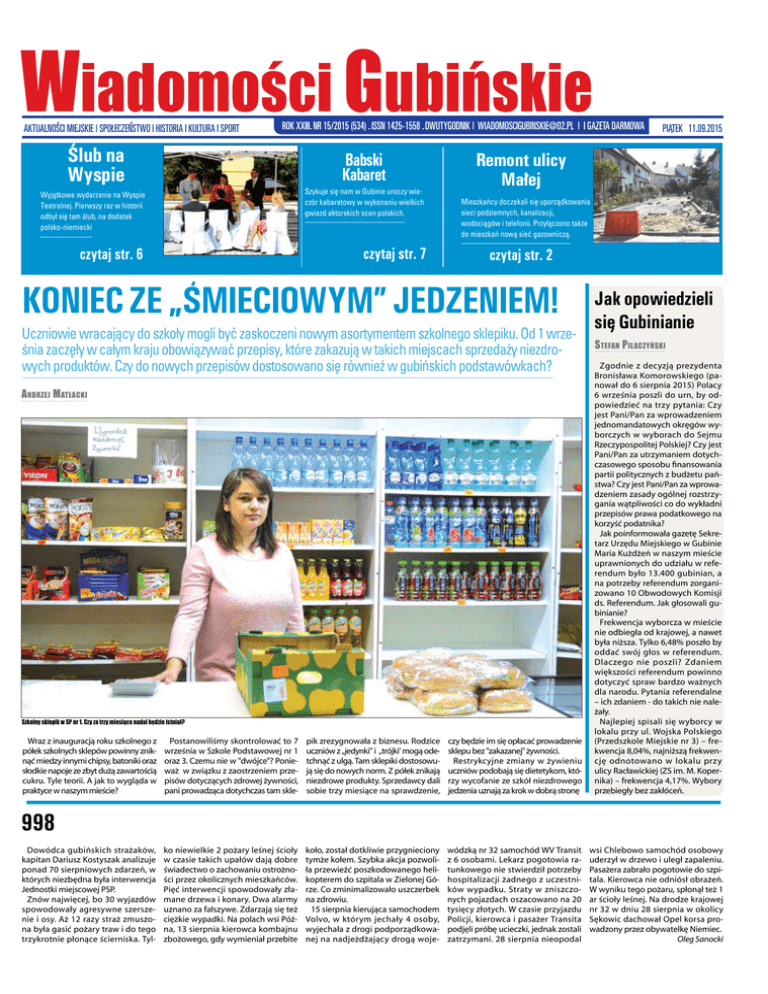 Wiadomości Gubińskie AKTUALNOSCI MIEJSKIE | SPOLECZENSTWO I HISTORIA I KULTURA I SPORT ROK XXIIi. nr 15/2015 (534) . ISSN 1425-1558 . DWUTYGODNIK | [email protected] | I Gazeta DARMOWA Slub na Wyspie Babski Kabaret Wyjątkowe wydarzenie na Wyspie Teatralnej. Pierwszy raz w historii odbył się tam ślub, na dodatek polsko-niemiecki Szykuje się nam w Gubinie uroczy wieczór kabaretowy w wykonaniu wielkich gwiazd aktorskich scen polskich. czytaj str. 6 czytaj str. 7 Remont ulicy Malej Mieszkańcy doczekali się uporządkowania sieci podziemnych, kanalizacji, wodociągów i telefonii. Przyłączono także do mieszkań nową sieć gazowniczą. czytaj str. 2 Koniec ze „smieciowym” jedzeniem! Uczniowie wracający do szkoły mogli być zaskoczeni nowym asortymentem szkolnego sklepiku. Od 1 września zaczęły w całym kraju obowiązywać przepisy, które zakazują w takich miejscach sprzedaży niezdrowych produktów. Czy do nowych przepisów dostosowano się również w gubińskich podstawówkach? Jak opowiedzieli sie Gubinianie S tefan P ilaczyński Postanowiliśmy skontrolować to 7 września w Szkole Podstawowej nr 1 oraz 3. Czemu nie w "dwójce"? Ponieważ w związku z zaostrzeniem przepisów dotyczących zdrowej żywności, pani prowadząca dotychczas tam skle- pik zrezygnowała z biznesu. Rodzice uczniów z „jedynki” i „trójki’ mogą odetchnąć z ulgą. Tam sklepiki dostosowują się do nowych norm. Z półek znikają niezdrowe produkty. Sprzedawcy dali sobie trzy miesiące na sprawdzenie, czy będzie im się opłacać prowadzenie sklepu bez "zakazanej" żywności. Restrykcyjne zmiany w żywieniu uczniów podobają się dietetykom, którzy wycofanie ze szkół niezdrowego jedzenia uznają za krok w dobrą stronę Zgodnie z decyzją prezydenta Bronisława Komorowskiego (panował do 6 sierpnia 2015) Polacy 6 września poszli do urn, by odpowiedzieć na trzy pytania: Czy jest Pani/Pan za wprowadzeniem jednomandatowych okręgów wyborczych w wyborach do Sejmu Rzeczypospolitej Polskiej? Czy jest Pani/Pan za utrzymaniem dotychczasowego sposobu finansowania partii politycznych z budżetu państwa? Czy jest Pani/Pan za wprowadzeniem zasady ogólnej rozstrzygania wątpliwości co do wykładni przepisów prawa podatkowego na korzyść podatnika? Jak poinformowała gazetę Sekretarz Urzędu Miejskiego w Gubinie Maria Kużdżeń w naszym mieście uprawnionych do udziału w referendum było 13.400 gubinian, a na potrzeby referendum zorganizowano 10 Obwodowych Komisji ds. Referendum. Jak głosowali gubinianie? Frekwencja wyborcza w mieście nie odbiegła od krajowej, a nawet była niższa. Tylko 6,48% poszło by oddać swój głos w referendum. Dlaczego nie poszli? Zdaniem większości referendum powinno dotyczyć spraw bardzo ważnych dla narodu. Pytania referendalne – ich zdaniem - do takich nie należały. Najlepiej spisali się wyborcy w lokalu przy ul. Wojska Polskiego (Przedszkole Miejskie nr 3) – frekwencja 8,04%, najniższą frekwencję odnotowano w lokalu przy ulicy Racławickiej (ZS im. M. Kopernika) – frekwencja 4,17%. Wybory przebiegły bez zakłóceń. ko niewielkie 2 pożary leśnej ścioły w czasie takich upałów dają dobre świadectwo o zachowaniu ostrożności przez okolicznych mieszkańców. Pięć interwencji spowodowały złamane drzewa i konary. Dwa alarmy uznano za fałszywe. Zdarzają się też ciężkie wypadki. Na polach wsi Późna, 13 sierpnia kierowca kombajnu zbożowego, gdy wymieniał przebite koło, został dotkliwie przygnieciony tymże kołem. Szybka akcja pozwoliła przewieźć poszkodowanego helikopterem do szpitala w Zielonej Górze. Co zminimalizowało uszczerbek na zdrowiu. 15 sierpnia kierująca samochodem Volvo, w którym jechały 4 osoby, wyjechała z drogi podporządkowanej na nadjeżdżający drogą woje- wódzką nr 32 samochód WV Transit z 6 osobami. Lekarz pogotowia ratunkowego nie stwierdził potrzeby hospitalizacji żadnego z uczestników wypadku. Straty w zniszczonych pojazdach oszacowano na 20 tysięcy złotych. W czasie przyjazdu Policji, kierowca i pasażer Transita podjęli próbę ucieczki, jednak zostali zatrzymani. 28 sierpnia nieopodal wsi Chlebowo samochód osobowy uderzył w drzewo i uległ zapaleniu. Pasażera zabrało pogotowie do szpitala. Kierowca nie odniósł obrażeń. W wyniku tego pożaru, spłonął też 1 ar ścioły leśnej. Na drodze krajowej nr 32 w dniu 28 sierpnia w okolicy Sękowic dachował Opel korsa prowadzony przez obywatelkę Niemiec. Oleg Sanocki A ndrzej M atłacki Szkolny sklepik w SP nr 1. Czy za trzy miesiące nadal będzie istniał? Wraz z inauguracją roku szkolnego z półek szkolnych sklepów powinny zniknąć miedzy innymi chipsy, batoniki oraz słodkie napoje ze zbyt dużą zawartością cukru. Tyle teorii. A jak to wygląda w praktyce w naszym mieście? piatek 11.09.2015 998 Dowódca gubińskich strażaków, kapitan Dariusz Kostyszak analizuje ponad 70 sierpniowych zdarzeń, w których niezbędna była interwencja Jednostki miejscowej PSP. Znów najwięcej, bo 30 wyjazdów spowodowały agresywne szerszenie i osy. Aż 12 razy straż zmuszona była gasić pożary traw i do tego trzykrotnie płonące ścierniska. Tyl- 2 piatek 11.09.2015 aktualności miejskie 1 wrzesnia - dwa wazne wydarzenia A ndrzej M atłacki 1 września br. w Szkole Podstawowej nr 2 w Gubinie odbyła się miejska inauguracja roku szkolnego 2015/16. Przed placówką oświatową przy ulicy Świerczewskiego można było zobaczyć tłumy odświętnie ubranych dzieci, ich rodziców, a także nauczycieli oraz przedstawicieli władz samorządowych oraz Związku Kombatantów i Byłych Więźniów Politycznych. Tego samego dnia obchodziliśmy 76. Rocznicę wybuchu II wojny światowej. Z tej okazji pod Pomnikiem w Parku imienia V Dywizji w Gubinie odbyły się uroczystości, na których mieszkańcy oraz delegaci złożyli kwiaty, czym oddali cześć wszystkim walczącym na frontach Europy i Świata w latach 1939-1945. Mala w r