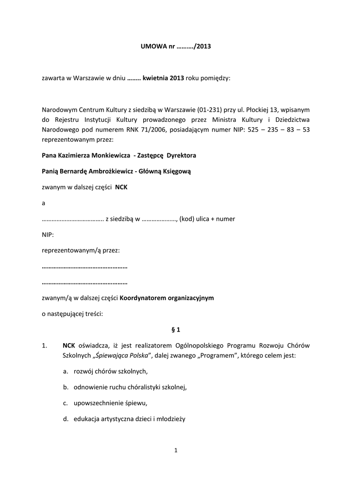 UMOWA nr ………./2013 zawarta w Warszawie w dniu …….. kwietnia 2013 roku pomiędzy: Narodowym Centrum Kultury z siedzibą w Warszawie (01-231) przy ul. Płockiej 13, wpisanym do Rejestru Instytucji Kultury prowadzonego przez Ministra Kultury i Dziedzictwa Narodowego pod numerem RNK 71/2006, posiadającym numer NIP: 525 – 235 – 83 – 53 reprezentowanym przez: Pana Kazimierza Monkiewicza - Zastępcę Dyrektora Panią Bernardę Ambrożkiewicz - Główną Księgową zwanym w dalszej części NCK a ……………………………….. z siedzibą w …………………, (kod) ulica + numer NIP: reprezentowanym/ą przez: …………………………………………… …………………………………………… zwanym/ą w dalszej części Koordynatorem organizacyjnym o następującej treści: §1 1. NCK oświadcza, iż jest realizatorem Ogólnopolskiego Programu Rozwoju Chórów Szkolnych „Śpiewająca Polska”, dalej zwanego „Programem”, którego celem jest: a. rozwój chórów szkolnych, b. odnowienie ruchu chóralistyki szkolnej, c. upowszechnienie śpiewu, d. edukacja artystyczna dzieci i młodzieży 1 2. Zgodnie z § 5 Regulaminu Programu zostały przewidziane dwa Etapy dofinansowania. Niniejsza Umowa zawarta jest w ramach II Etapu dofinansowania w ramach Programu, zwanego dalej „II Etapem” 3. NCK oświadcza, iż II Etap realizowany będzie przez 5 miesięcy w okresie od 01 maja 2013 r. do 29 listopada 2013 r. (z wyłączeniem przerwy wakacyjnej lipiec/sierpień) na terenie Rzeczpospolitej Polskiej, a środki NCK będą przeznaczone na : a. wynagrodzenie koordynatora regionalnego w wysokości 60 zł za miesiąc za jeden chór; zwanego dalej „koordynatorem regionalnym” b. organizację działalności zespołów chóralnych (przeglądów, koncertów, konkursów itp.) w wysokości 80 zł za miesiąc za jeden chór, zwaną dalej „organizacją działalności zespołów chóralnych” 4. Koordynator organizacyjny zaangażuje do II Etapu koordynatora regionalnego (osoba fizyczna), o którego udział w aplikacji do II Etapu wnioskował, tj. ……………….. (imię i nazwisko) 5. Obszarem koordynacji koordynatora organizacyjnego będzie ………… zwanym dalej „obszarem koordynacji” 6. Koordynator organizacyjny oświadcza, iż w związku z zakwalifikowaniem aplikacji do II Etapu, w celu udziału w II Etapie będzie współpracował z ……… (liczba) Beneficjantami, którzy zgłosili ………….. (liczba chórów). Szczegółowa lista Beneficjentów oraz chórów stanowi Załącznik numer 1 do niniejszej umowy. §2 1. NCK oświadcza, iż: a) posiada doświadczenie w zakresie prowadzenia programów edukacyjnych, b) posiada wiedzę niezbędną do realizacji Programu, c) osobą odpowiedzialną za współpracę ze strony NCK jest p. Monika Wołos (tel. 0 22 2 100 111, e-mail: [email protected] ) 2. Koordynator organizacyjny oświadcza, iż: a) osobą odpowiedzialną za współpracę ze strony Koordynatora organizacyjnego jest p. ......................................................................, tel: ....................................... . 2 §3 W celu realizacji przedmiotu niniejszej umowy Koordynator organizacyjny zobowiązuje się do zawarcia umowy (zlecenie/ o dzieło) z wybranym koordynatorem regionalnym. W ramach umowy, o której mowa w zdaniu poprzedzającym, Koordynator organizacyjny zobowiąże Koordynatora regionalnego do: 1. Przygotowania planu pracy zespołów chóralnych wraz z kosztorysem niezbędnym do organizacji działalności zespołów chóralnych z uwzględnieniem potrzeb chórów i dyrygentów 2. Organizacji działalności zespołów chóralnych 3. Opieki metodycznej nad chórami oraz dyrygentami §4 1. Koordynator organizacyjny zobowiązuje się do wykorzystania przekazanych środków finansowych NCK wyłącznie zgodnie z celem, na jaki je uzyskał i na warunkach określonych niniejszą umową uwzględniając potrzeby chórów uzasadnione w zakresie wsparcia merytorycznego oraz w oparciu o plan pracy wraz z kosztorysem przygotowany przez koordynatora regionalnego. 2. NCK zobowiązuje się przeznaczyć środki finansowe niezbędne do realizacji II Etapu: dla Koordynatora regionalnego sprawującego koordynację w regionie …… oraz na organizację działalności zespołów chóralnych. 3. NCK przekaże środki finansowe w łącznej wysokości: …………….. zł brutto (słownie: ……………………………………………………………………………brutto) na rachunek bankowy Koordynatora organizacyjnego o nr: ……………………………………………………… w terminie do 14 dni od daty otrzymania podpisanej umowy. 4. Szczegółowy podział środków stanowi Załącznik numer 1 do niniejszej umowy. §5 1) Wydatki związane z organizacją działalności zespołów chóralnych muszą zostać przeznaczone wyłącznie na realizację II Etapu, a ponadto powinny być: a) niezbędne dla realizacji zadania, b) efektywne i racjonalne, 3 c) poniesione w okresie kwalifikowalności wydatków tj. w trakcie trwania Programu, jednakże nie wcześniej, niż z dniem podpisania umowy o dofinansowanie (nie jest możliwa refundacja poniesionych już kosztów) i nie później niż 29.11.2013r., d) poniesione zgodnie z ustawą Prawo zamówień publicznych, e) udokumentowane, f) poniesione przez wnioskodawcę. 2) za wydatki kwalifikowane uznaje się: a) honoraria/wynagrodzenia za działania merytoryczne i obsługę przedsięwzięcia, instruktorów - prowadzących warsztaty, członków jury, akompaniatorów, konferansjerów i osób prowadzących imprezy towarzyszące (np. koncerty, przeglądy, konkursy), pracowników obsługi technicznej przedsięwzięć w ramach zadania (scena, nagłośnienie, oświetlenie, nagranie, strojenie instrumentów, dokumentacja, bileterzy, ochrona – z wyłączeniem kosztów sprzątania), Do tej pozycji nie kwalifikują się płace pracowników etatowych wnioskodawcy. Są to wy