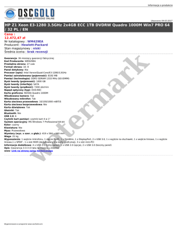 Informacje o produkcie Utworzono 04-03-2017 HP Z1 Xeon E3-1280 3.5GHz 2x4GB ECC 1TB DVDRW Quadro 1000M Win7 PRO 64 / 32 PL / EN Cena : 12.472,47 zł Nr katalogowy : WM429EA Producent : Hewlett-Packard Stan magazynowy : niski Średnia ocena : brak recenzji w at er m ar k Gwarancja: 36 miesięcy gwarancji fabrycznej Kod Producenta: WM429EA Przekątna ekranu: 27 cale Format obrazu: 16 :9 Panel dotykowy: Nie Procesor (opis): Intel Xenon/Quad-Core/E3-1280/3,5GHz Pamięć zainstalowana (pojemność): 8192 MB Pamięć (technologia): DDR3 SDRAM 1333 MHz (SO-DIMM) Dysk twardy (pojemność): 1000 GB Dysk twardy (interfejs): SATA Dysk twardy (prędkość): 7200 obr/min Napęd optyczny (typ): DVD-REC Karta graficzna: NVIDIA Quadro 1000M Wbudowana kamera: Tak Wbudowany mikrofon: Tak Karta sieciowa przewodowa: 10/100/1000 mBIT/S Karta sieciowa bezprzewodowa: Nie Karta dźwiękowa: Tak Głośniki: Tak Bluetooth: Nie USB 2.0: 6 Czytnik kart pamięci: czytnik kart 4 w 1" System operacyjny: MS Windows 7 Professional 64-bit Kolor: czarny Klawiatura: Nie Mysz: Przewodowa Wymiary (wys. x szer. x głęb.): 419 x 584 x 660 mm Waga: 21 kg Wyposażenie: 1 wejście mikrofonu, 1 złącze RJ-45, 1 x FireWire, 1 x DisplayPort, 2 x USB 3.0, 1 x wyjście na słuchawki, 1 x wejście liniowe, 1 x wyjście liniowe,1 x SPDIF , 1 x slot MXM (dedykowany dla karty graficznej), 3 x slot mini-PCI Informacje dodatkowe: 4 x USB 2.0 (tylny panel), 2 x USB 2.0 (opcja), 2 x USB 3.0 (boczny panel) Opis: Gwarancja 3-3-3 (3 lata na miejscu u klienta) www: Link na stronę opisu technicznego Wygenerowano w programie www.oscGold.com
