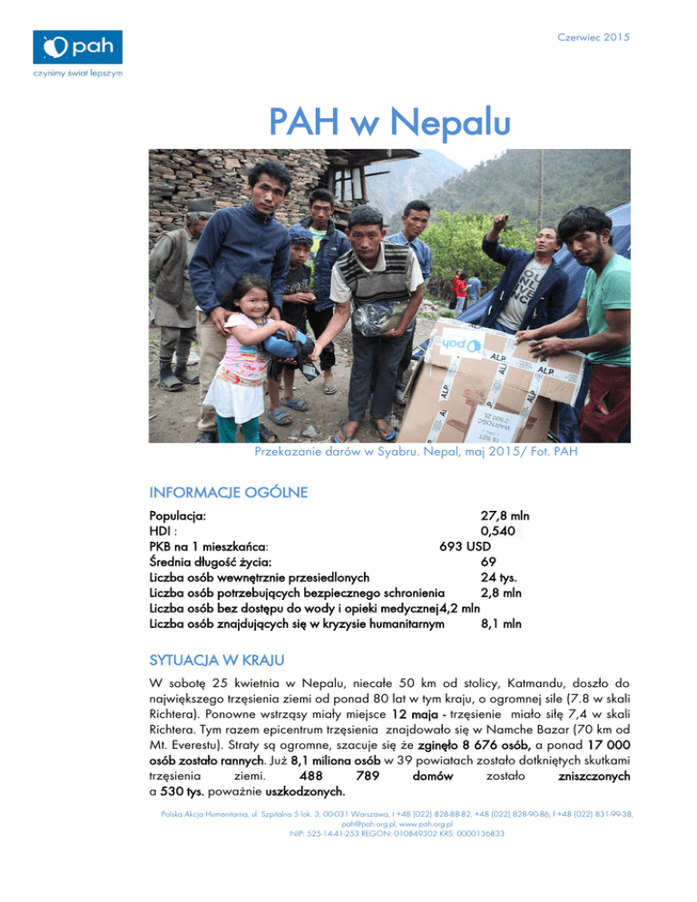 Czerwiec 2015 PAH w Nepalu Przekazanie darów w Syabru. Nepal, maj 2015/ Fot. PAH INFORMACJE OGÓLNE Populacja: 27,8 mln HDI : 0,540 PKB na 1 mieszkańca: 693 USD Średnia długość życia: 69 Liczba osób wewnętrznie przesiedlonych 24 tys. Liczba osób potrzebujących bezpiecznego schronienia 2,8 mln Liczba osób bez dostępu do wody i opieki medycznej 4,2 mln Liczba osób znajdujących się w kryzysie humanitarnym 8,1 mln SYTUACJA W KRAJU W sobotę 25 kwietnia w Nepalu, niecałe 50 km od stolicy, Katmandu, doszło do największego trzęsienia ziemi od ponad 80 lat w tym kraju, o ogromnej sile (7.8 w skali Richtera). Ponowne wstrząsy miały miejsce 12 maja - trzęsienie miało siłę 7,4 w skali Richtera. Tym razem epicentrum trzęsienia znajdowało się w Namche Bazar (70 km od Mt. Everestu). Straty są ogromne, szacuje się że zginęło 8 676 osób, a ponad 17 000 osób zostało rannych. Już 8,1 miliona osób w 39 powiatach zostało dotkniętych skutkami trzęsienia ziemi. 488 789 domów zostało zniszczonych a 530 tys. poważnie uszkodzonych. Polska Akcja Humanitarna, ul. Szpitalna 5 lok. 3, 00-031 Warszawa, t +48 (022) 828-88-82, +48 (022) 828-90-86, f +48 (022) 831-99-38, [email protected], www.pah.org.pl NIP: 525-14-41-253 REGON: 010849302 KRS: 0000136833 2015 Rozpoznanie potrzeb: Przeprowadzone przez PAH rozpoznanie potrzeb w dystrykcie Sindhupalchowk, wskazuje na bardzo trudną sytuację mieszkańców w tym regionie. Zbliża się pora monsunów, dlatego przede wszystkim trzeba zapewnić schronienie tym, którzy w wyniku trzęsienia ziemi stracili swoje domy. Wraz z partnerską organizacją International Student Relationship prowadzimy dystrybucję materiałów służących do przygotowania tymczasowego schronienia (koce, namioty, plandeki/tarpoliny i liny) oraz dystrybucję nieżywnościowych artykułów pierwszej potrzeby. Górzysty teren kraju znacznie utrudnia dotarcie z pomocą do mniejszych miejscowości. Kolejne potrzeby osób poszkodowanych to opieka medyczna, woda i żywność Szpitale są przepełnione, zaczyna brakować leków i środków opatrunkowych, wody i żywności. Większość ludzi opuściła swoje domy i nocuje w prowizorycznych obozowiskach, na wolnych przestrzeniach w obawie przed kolejnymi wstrząsami i zawaleniem się budynków. POMOC HUMANITARNA UDZIELANA PRZEZ PAH Trzęsienia ziemi 25.04 i 12 .05. 2015 roku pochłonęły bardzo wiele ofiar, ale ci, którzy przeżyli potrzebują naszej natychmiastowej pomocy. W odpowiedzi na katastrofę PAH natychmiast rozpoczęła zbiórkę pieniędzy na pomoc dla ofiar trzęsienia ziemi. Środki zbierane są na koncie statutowym fundacji oraz poprzez stronę internetową www.pah.org.pl. Dystrybucja Dzięki uruchomieniu puli środków z Klubu PAH SOS oraz zaangażowaniu polskiego społeczeństwa, mogliśmy szybko odpowiedzieć na kryzys. Podczas pierwszych dni obecności pracowniczki PAH w Nepalu, dostarczyliśmy: Żywność: 1,5 tony artykułów spożyczych: mąka (500 kg) oraz ryż (1 tona) Artykuły pierwszej potrzeby: 112 tys. tabletek do oczyszczania wody oraz artykuły pierwszej potrzeby: ubrania, śpiwory, menażki i namioty. Dary trafiły do potrzebujących w Pharping, Shyabrubesi, dystrykcie Kathmandu i Ghorka. Schronienie: Prowadzimy dystrybucję materiałów służących do zabezpieczenia schronienia (tarpolina, liny i koce) w wioskach w regionie Helambu. Łącznie przekazaliśmy: 3 124 plandek/tarpolin 3 124 koców 3 124 lin 2015 Wspieramy: 1 562 rodziny z 35 wiosek w regionie Helambu. Wszyscy pochodzą z rodzin Hylomo - jest to grupa etniczna wywodząca się z Tybetu, żyjąca obecnie w Himalajach, w okolicy pasma Langtang. Każda rodzina otrzymała zestaw (tzw. „shelter kit”) do przygotowania tymczasowego schronienia. Zestaw składa się z: 2 tarpolin/plandek, 2 kocy oraz 2 lin o długości 30m każda. PAH na bieżąco przeprowadza rozpoznanie potrzeb i w oparciu o zebrane dane podejmie kolejne działania pomocowe. To, ile pomocy będziemy w stanie udzielić, zależy od ilości zebranych środków. MATERIAŁY INFORMACYJNE: Zobacz galerię zdjęć z Nepalu (KLIKNIJ) Pobierz infografikę. (KLIKNIJ). Sprawdź aktualności działań PAH w Nepalu. (KLIKNIJ).