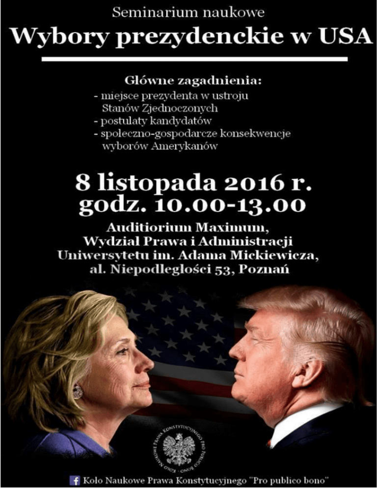 PROGRAM Seminarium naukowego Wybory prezydenckie w USA dnia 8 listopada 2016 roku sala: Auditorium Maximum 10:00 – otwarcie seminarium, powitanie gości Panel Studencki 10:10-10:30 – Rafał Świergiel „Pięciu wspaniałych – przegląd wybranych sylwetek prezydentów USA” 10:30-10:50 – Jacek Szczytko „Hillary Clinton – Only the Fight” 10:50-11:10 – Patryk Maćkowiak „Kim jest Donald Trump?” 11:10-11:20 – dyskusja 11:20-11:30 – przerwa Panel Ekspercki 11:30-11:50 – dr Michał Urbańczyk „Wybory prezydenckie w USA. Między marketingiem politycznym a manipulacją” 11:55-12:15 – dr hab. Maksymilian Stanulewicz „Rola prezydenta USA i procedura jego wyboru” 12:20-12:40 – dr Marcin konsekwencje wyboru Amerykanów” Graban „Społeczno-gospodarcze 12:40-13:00 – dyskusja, zakończenie seminarium