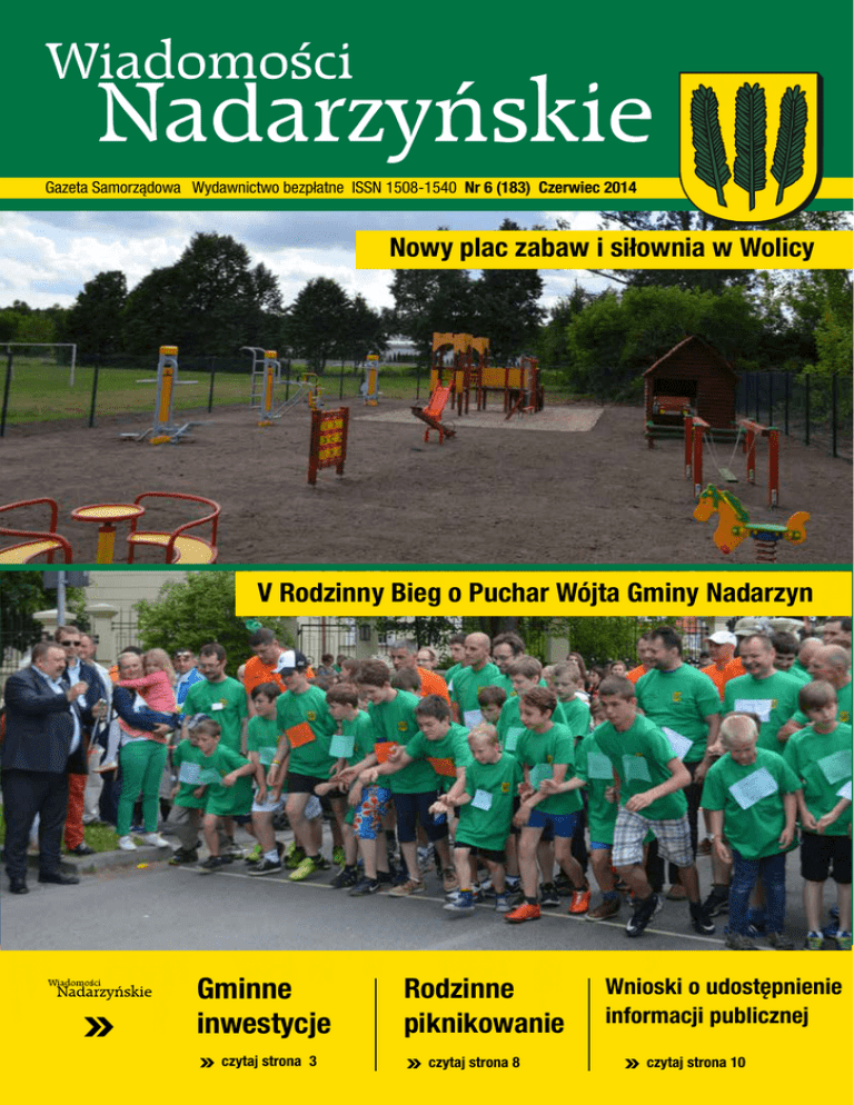 Gazeta Samorządowa Wydawnictwo bezpłatne ISSN 1508-1540 Nr 6 (183) Czerwiec 2014 Nowy plac zabaw i siłownia w Wolicy V Rodzinny Bieg o Puchar Wójta Gminy Nadarzyn Gminne inwestycje czytaj strona 3 Rodzinne piknikowanie czytaj strona 8 Wnioski o udostępnienie informacji publicznej czytaj strona 10 Wiadomości Nadarzyńskie 2 6 (183) czerwiec 2014 Wiadomości Nadarzyńskie WAŻNE SPRAWY NA BIEŻĄCO... Gminne inwestycje Budowa kompleksu oświatowego w Ruścu Największą, priorytetową, inwestycją realizowaną obecnie przez Gminę Nadarzyn jest rozpoczęta jesienią 2013 roku budowa kompleksu oświatowego w Ruścu, w skład, którego wejdą szkoła podstawowa i gimnazjum wraz z halą sportowo – widowiskową oraz częścią administracyjną. Zakończenie pierwszego etapu, który obejmuje powstanie szkoły podstawowej wraz z halą sportową i częścią administracyjną planowane jest na wrzesień 2014 roku. Tak, aby po wakacjach dzieci z Ruśca i Starej Wsi mogły rozpocząć naukę w nowej szkole. Gmina wydatkowała na ten cel już ponad 10 mln zł z własnych środków, a wszystkie płatności regulowane są na bieżąco. Pozwala to na zgodny z harmonogramem przebieg inwestycji. Każda inwestycja tego typu to olbrzymie wyzwanie wymagające skoordynowania wielu działań, które mają zapewnić jej płynny i zgodny z przyjętymi terminami i założeniami przebieg. Na budynku i w jego wnętrzu po- kładów na korytarzach przed aulą. Równocześnie na dachu wymieniana jest warstwa papy zabezpieczającej na docelowy system pokrywczy. Trwa kontynuacja prac związanych z elewacją na budynku (fot. powyżej). Trwa białkowanie ścian wewnątrz. W większości pomieszczeń zamontowano parapety wewnętrzne, a do zakończenia pozostało ostateczne malowanie i montaż wyposażenia. Na koryta- Pomieszczenia sanitarne - kładziona jest glazura Inne inwestycje Główne wejście do szkoły jawiły się kolory. To znak że budowa wchodzi w decydującą fazę robót wykończeniowych. Roboty tynkarskie wewnątrz budynku są zakończone. Na ukończeniu jest układanie warstwy podkładów betonowych pod posadzki - pozostały do ułożenia niewielkie fragmenty pod6 (183) czerwiec 2014 rzach trwa montaż stelaży dla sufitów podwieszanych oraz układana jest terakota, montowane są parapety wewnętrzne oraz glazura w sanitariatach. W trakcie montowania jest instalacja wentylacji mechanicznej w auli, kuchni oraz sali gimnastycznej. Układana jest instalacja elektryczna, teletechniczna i komputerowa. W trakcie jest przebudowa ul. K. Łoniewskiego w Kajetanach w zakresie nakładki oraz budowy kanalizacji – termin realizacji aneksowany został do dnia 31 sierpnia 2014 roku. W najbliższym czasie rozpocznie się również budowa chodnika w ul. Błońskiej w Nadarzynie – termin zakończenia przewidziany jest do 24 sierpnia 2014 roku. Wśród inwestycji prowadzonych obecnie przez Gminę są także nowe odcinki oświetlenia dla mieszkańców kolejnych ulic. Zakończone zostały prace na ul. Przemysłowej 3 Wiadomości Nadarzyńskie Remont i modernizacja parku „Skwer” przy ul. Lipowej w Nadarzynie - Trwają prace wykończeniowe (zwią- w Rozalinie (dz. Nr ew. 42/10, 44/1, 44/5, 44/6, 55/1, 78/1, 80/9, 81/1, 82, 83/11 oraz dz. nr ew. 65/1, 65/10, 65/13, 69/1, 70.), ul. Ekologicznej w Urzucie (dz. Nr ew. 263/1, 261/1), ul. Poranka w Kajetanach (dz. Nr ew. 60/11). W trakcie realizacji jest budowa oświetlenia ul. Grodziskiej w Starej Wsi (dz. Nr ew. 91/1) - na fot. powyżej, w Ruścu, ul. Żwirowa (dz. Nr ew. 250/38, 250/37), a także w Rozalinie ul. Młochowska (dz. Nr ew. 102/1). Ponadto podpisana została umowa na zaprojektowanie i budowę oświetlenia ul. Zielonej w Wolicy – termin realizacji do końca 28 lipca 2014 roku. Ogłoszony został również przetarg na budowę oświetlenia ul. Akacjowej w Nadarzynie, ul. Komorowskiej i Pruszkowskiej w Strzeniówce, ul. Myśliwskiej w Ruścu oraz ul. Bukietowej w Walendowie. Na oświetlenie przeznaczony zostanie ponad 1 mln zł. zane z oświetleniem i założeniem monitoringu), planowane zakończenie prac wraz z uzyskaniem pozwolenia na użytkowanie około 10 września 2014 roku. Nadbudowa i rozbudowa budynku świetlicy na działce o nr ew. 149 i 148/4 w Rozalinie – z powodu nieprawidłowości ze strony wykonawcy w prowadzeniu inwestycji gmina odstąpiła od umowy. Po wykonaniu inwentaryzacji zostanie ponownie ogłoszone postepowanie przetargowe. wierzchni bitumicznych. Ponownie zostanie wykonane mechaniczne profilowanie z zagęszczeniem dróg gruntowych na terenie Gminy Nadarzyn W zakresie inwestycji dotyczących kanalizacji i wodociągów trwa budowa wodociągu w ul. Pawiej w Rozalinie. Ogłoszony został przetarg na wykonanie garaży dla OSP Młochów oraz na wykonanie remontów wakacyjnych w palcówkach oświatowych. Ponadto ogłoszono przetarg na dostawę sprzętu komputerowego dla 13 jednostek podległych Gminie Nadarzyn oraz 52 gospodarstw domowych w ramach projektu „Przeciwdziałanie wykluczeniu cyfrowemu w Gminie Nadarzyn”. Informacje o prowadzonych oraz planowanych inwestycjach znajdują się w Biuletynie Informacji Publicznej: www.bip.nadarzyn.pl oraz na gminnej stronie www.nadarzyn.pl i gminnym profilu na facebooku. Plac zabaw i siłownia zewnętrzna w Wolicy – Inwestycja została zakończona i w najbliższym czasie pierwsza siłownia zewnętrzna na terenie Gminy Nadarzyn oraz przylegający do niej plac zabaw zostaną udostępnione mieszkańcom Wolicy (więcej o siłowniach na kolejnej stronie WN). Na bieżąco trwają: dostawa tłucznia kamiennego 5000 t oraz tłucznia betonowego 5000 t. Bieząco prowadzone są także remonty cząstkowe na- Wartość projektu (zakup sprzętu oraz realizacja programu) - 860 tys. zł, z czego udało nam się otrzymać 100 % dofinansowanie. W trakcie procedury ogłaszania są kolejne siłownie zewnętrzne oraz plac zabaw w Starej Wsi. Ref. Inwestycji Zapraszamy do odwiedzania strony Gminy Nadarzyn: www.na