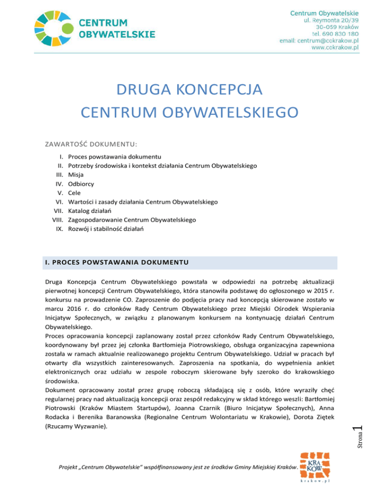 DRUGA KONCEPCJA CENTRUM OBYWATELSKIEGO ZAWARTOŚĆ DOKUMENTU: I. II. III. IV. V. VI. VII. VIII. IX. Proces powstawania dokumentu Potrzeby środowiska i kontekst działania Centrum Obywatelskiego Misja Odbiorcy Cele Wartości i zasady działania Centrum Obywatelskiego Katalog działań Zagospodarowanie Centrum Obywatelskiego Rozwój i stabilność działań Strona Druga Koncepcja Centrum Obywatelskiego powstała w odpowiedzi na potrzebę aktualizacji pierwotnej koncepcji Centrum Obywatelskiego, która stanowiła podstawę do ogłoszonego w 2015 r. konkursu na prowadzenie CO. Zaproszenie do podjęcia pracy nad koncepcją skierowane zostało w marcu 2016 r. do członków Rady Centrum Obywatelskiego przez Miejski Ośrodek Wspierania Inicjatyw Społecznych, w związku z planowanym konkursem na kontynuację działań Centrum Obywatelskiego. Proces opracowania koncepcji zaplanowany został przez członków Rady Centrum Obywatelskiego, koordynowany był przez jej członka Bartłomieja Piotrowskiego, obsługa organizacyjna zapewniona została w ramach aktualnie realizowanego projektu Centrum Obywatelskiego. Udział w pracach był otwarty dla wszystkich zainteresowanych. Zaproszenia na spotkania, do wypełnienia ankiet elektronicznych oraz udziału w zespole roboczym skierowane były szeroko do krakowskiego środowiska. Dokument opracowany został przez grupę roboczą składającą się z osób, które wyraziły chęć regularnej pracy nad aktualizacją koncepcji oraz zespół redakcyjny w skład którego weszli: Bartłomiej Piotrowski (Kraków Miastem Startupów), Joanna Czarnik (Biuro Inicjatyw Społecznych), Anna Rodacka i Berenika Baranowska (Regionalne Centrum Wolontariatu w Krakowie), Dorota Ziętek (Rzucamy Wyzwanie). 1 I. PROCES POWSTAWANIA DOKUMENTU Projekt „Centrum Obywatelskie” współfinansowany jest ze środków Gminy Miejskiej Kraków. Założenia dotyczące funkcjonowania Centrum Obywatelskiego opracowano na podstawie pierwotnej koncepcji, wniosków z ewaluacji pierwszego okresu działania CO oraz potrzeb zebranych od krakowskiego środowiska obywatelskiego. Prace przebiegały w następujących etapach: ● prace Rady Centrum Obywatelskiego - planowanie procesu aktualizacji koncepcji, analiza pierwszej koncepcji, analiza wniosków z ewaluacji działania Centrum Obywatelskiego w okresie 08-12.2015 (spotkania 17 marca, 13 kwietnia 2016 r.). ● analiza potrzeb organizacji pozarządowych, grup nieformalnych i mieszkańców Krakowa (otwarte spotkanie konsultacyjne 4 maja 2016 r.; ankieta z udziałem 62 respondentów, 0419.05.2016 r.); ● spotkania grupy roboczej mające na celu wypracowanie założeń do koncepcji oraz zespołu redakcyjnego opracowującego jej wstępny projekt (maj – sierpień 2016 r.). ● konsultacje projektu zaktualizowanej koncepcji (05-20.09.2016 r., spotkanie Rady Centrum Obywatelskiego, spotkanie otwarte w CO, konsultacje online). Projekt „Centrum Obywatelskie” współfinansowany jest ze środków Gminy Miejskiej Kraków. Strona Centrum Obywatelskie jest odpowiedzią na potrzeby mieszkańców Krakowa oraz środowiska grup i organizacji obywatelskich wyrażaną od 2013 roku. W odpowiedzi na nią opracowana została pierwsza koncepcja oraz realizowana pierwsza edycja projektu “Centrum Obywatelskie” (08.2015 - 12.2016 r.). Potrzeba miejsca wspierającego aktywność społeczną i obywatelską jest nadal aktualna, co potwierdzają dostępne wyniki badań (np. Barometr Krakowski 2015, Diagnoza Społeczna. Warunki i jakość życia Polaków.2015, Ludzie młodzi a nierówności społeczne. Kraków na tle Europy. 2015, Kondycja sektora organizacji pozarządowych w Polsce 2015) oraz ewaluacja dotychczasowych działań Centrum Obywatelskiego. Pokazują one niski poziom aktywności społecznej, utrzymujący się w różnych grupach wiekowych (ponad 60% krakowian wcale lub w niskim stopniu angażuje się społecznie lub politycznie, około 13% osób przynależy do różnego typu organizacji pozarządowych), w tym wymiarze Kraków nie wyróżnia się na tle innych większych miast Polski. Równocześnie jednak, jak pokazuje Barometr Krakowski, mieszkańcy Krakowa są zainteresowani większym udziałem w sprawach swojego miasta. Potwierdza to coraz większe zainteresowanie krakowian podejmowaniem działań na rzecz swojego najbliższego środowiska, interesowanie sprawami miasta, czy włączanie w lokalne akcje. Niezwykle istotną częścią obrazu aktywności obywatelskiej krakowian są organizacje pozarządowe. Aktualnie funkcjonuje ich w Krakowie ponad 3,5 tys. Działają one we wszystkich sferach działań pożytku publicznego, najliczniej reprezentowane są organizacje zajmujące się sportem, edukacją i wychowaniem, kulturą i sztuką, pomocą społeczną, ochroną zdrowia i rozwojem lokalnym. Realizują one ważne zadania publiczne, zarówno we współpracy z samorządem lokalnym, jak i samodzielnie, w oparciu o środki prywatne lub publiczne pochodzące z innych szczebli administracji. W ten sposób organizacje wnoszą do potencjału Krakowa nie tylko swoje zasoby merytoryczne i ludzkie, ale również dodatkowe środki przeznaczane bezpośrednio na rzecz mieszkańców. Krakowskie organizacje borykają się równocześnie z podobnymi trudnościami co NGO z pozostałych części Polski. 2 II. POTRZEBY ŚRODOWISKA I KONTEKST DZIAŁANIA CENTRUM OBYWATELSKIEGO Specyficzny sposób funkcjonowania formalno-prawnego i finansowego sprawia, że aby w pełni wykorzystać swój potencjał potrzebują zewnętrznego wsparcia. Projekt „Centrum Obywatelskie” współfinansowany jest ze środków Gminy Miejskiej Kraków. Strona Określone w poniższej koncepcji wizja i zadania Centrum Obywatelskiego odpowiadają autentycznym potrzebom mieszkańców i sektora społecznego. Postawione przed CO cele i rozmach działań są adekwatne do wielkości Krakowa oraz jego wizji jako miasta ludzi aktywnych i społecznie zaangażowanych. Wpisuje się ono również w ideę miasta 
